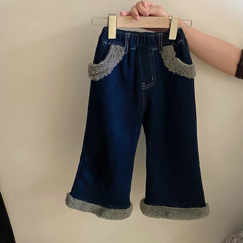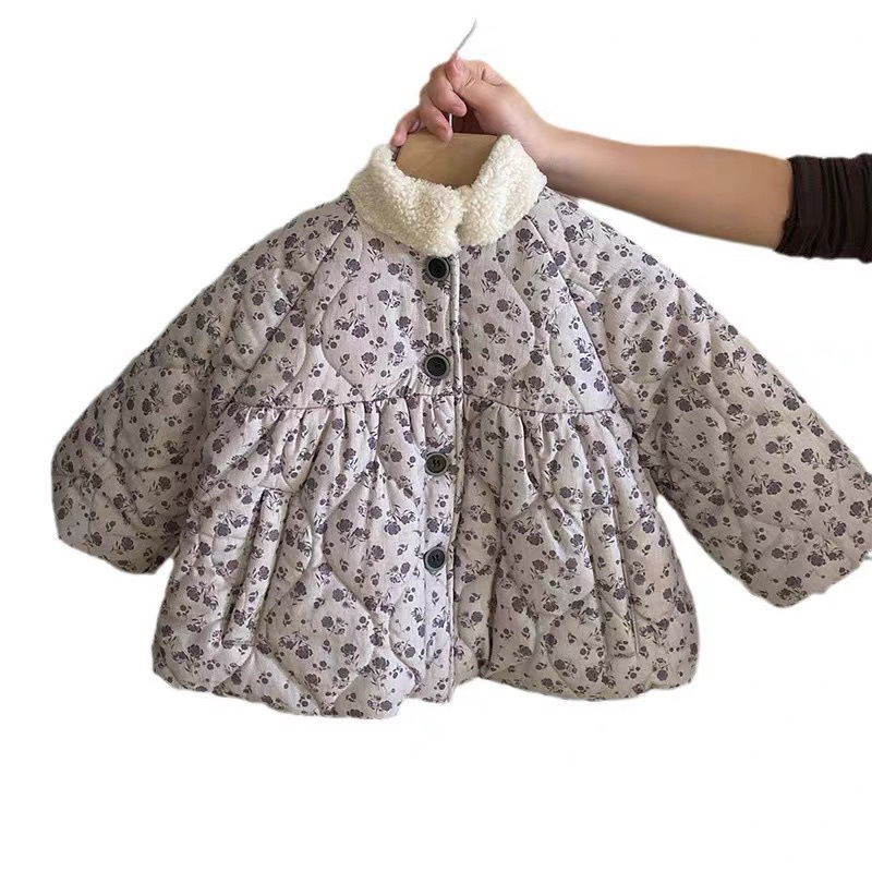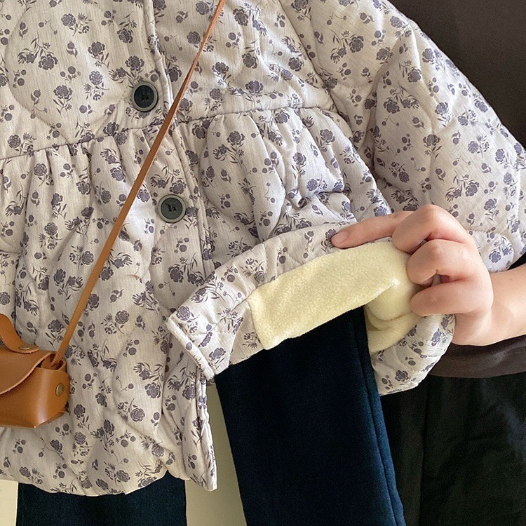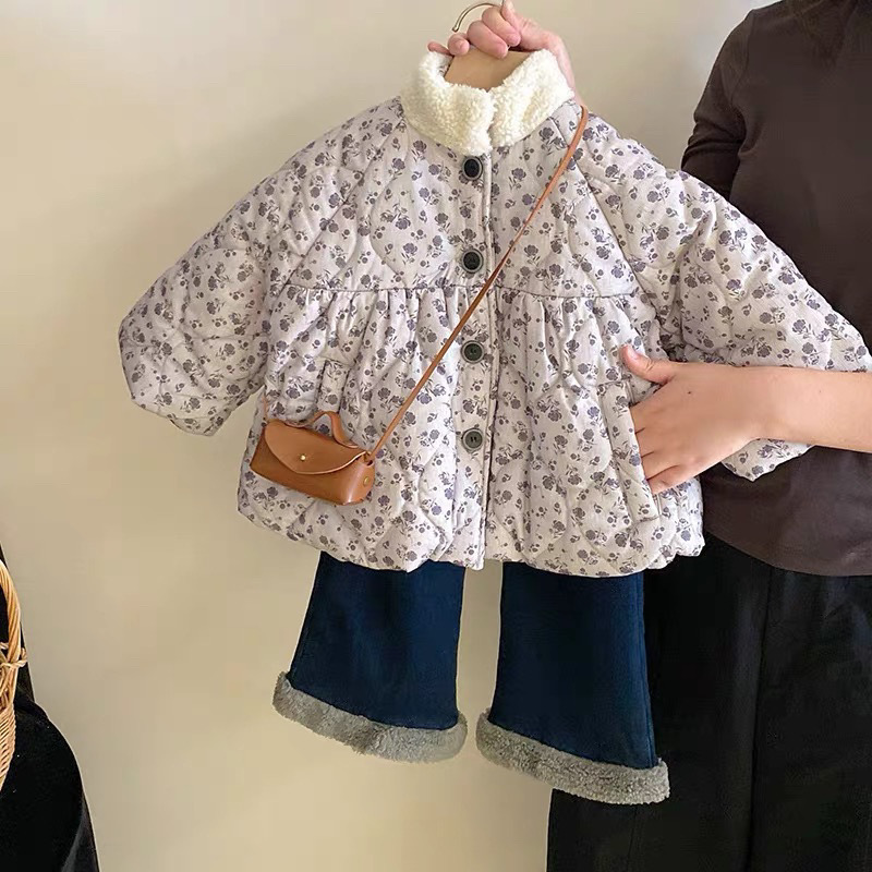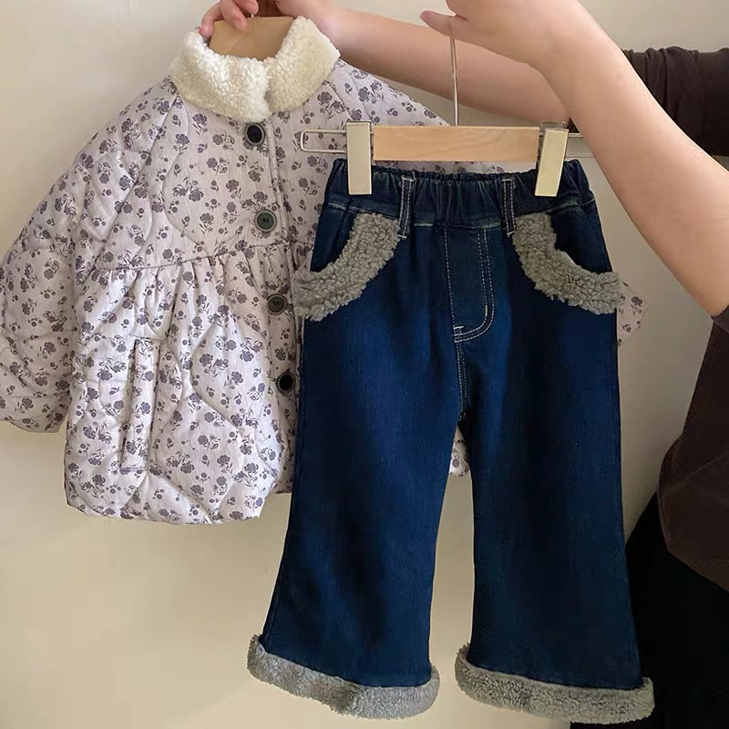 森系童装女童碎花夹棉保暖棉服外套2024秋冬女宝宝棉衣加绒牛仔裤