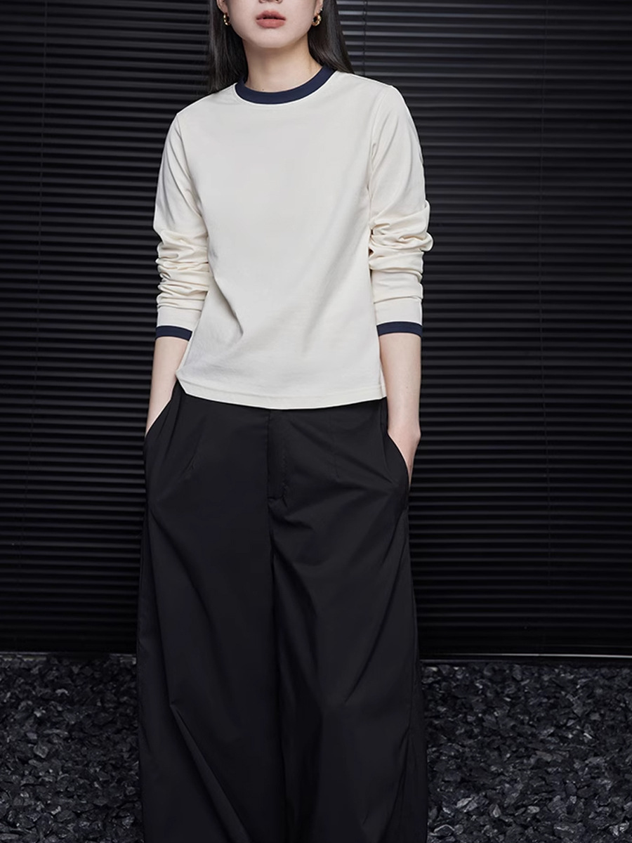 베이지 긴팔 크루 넥 티셔츠 여성용 2024 가을 뉴 숄더 아메리칸 레트로 슬림 핏 슬리밍스토어 가기