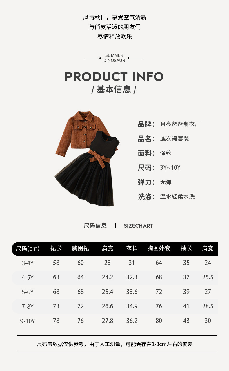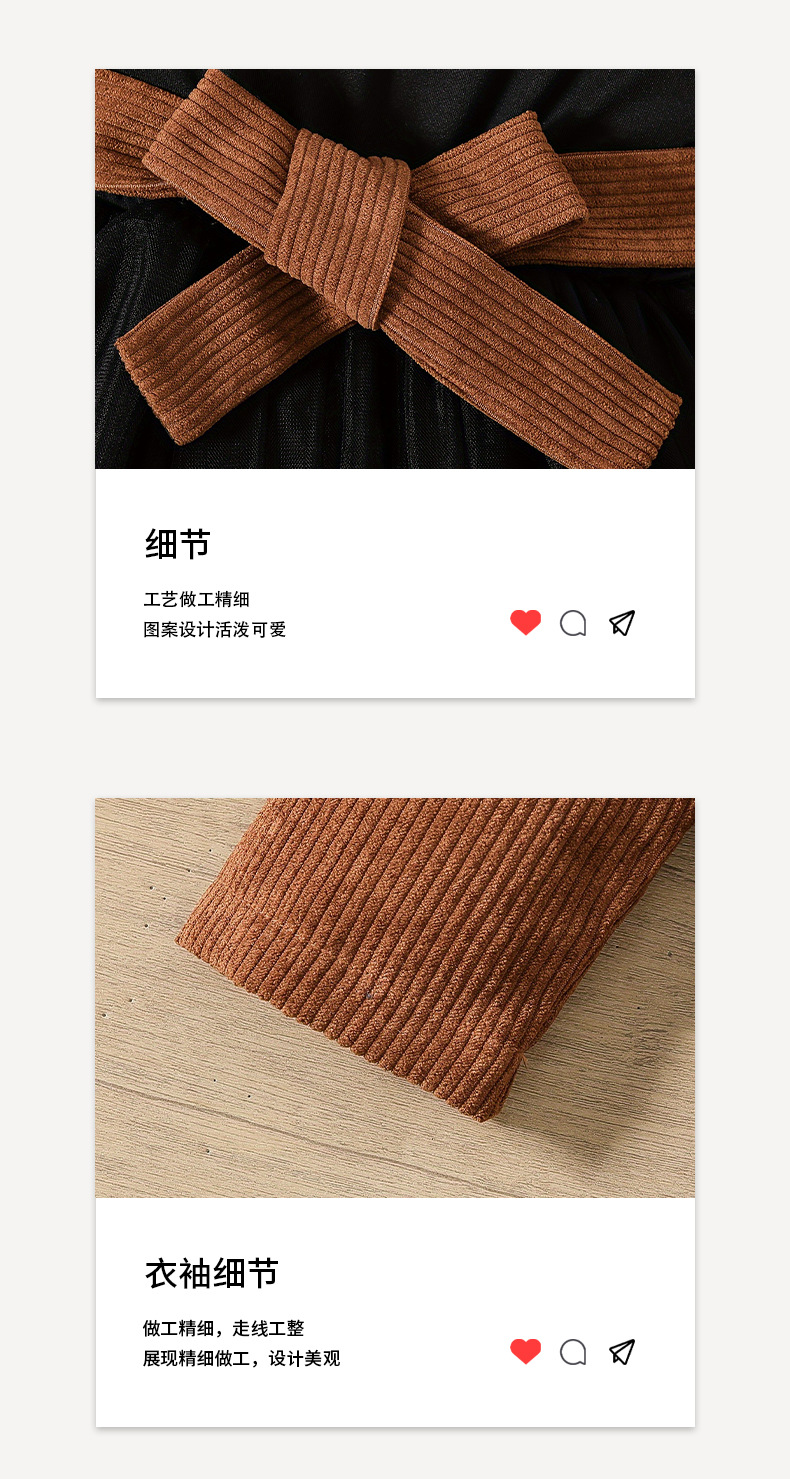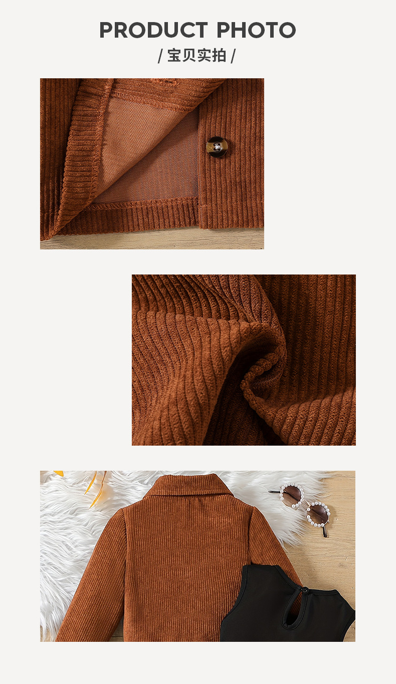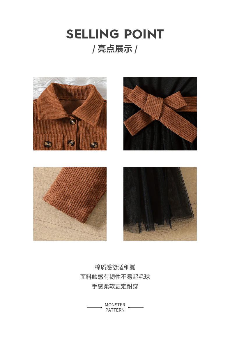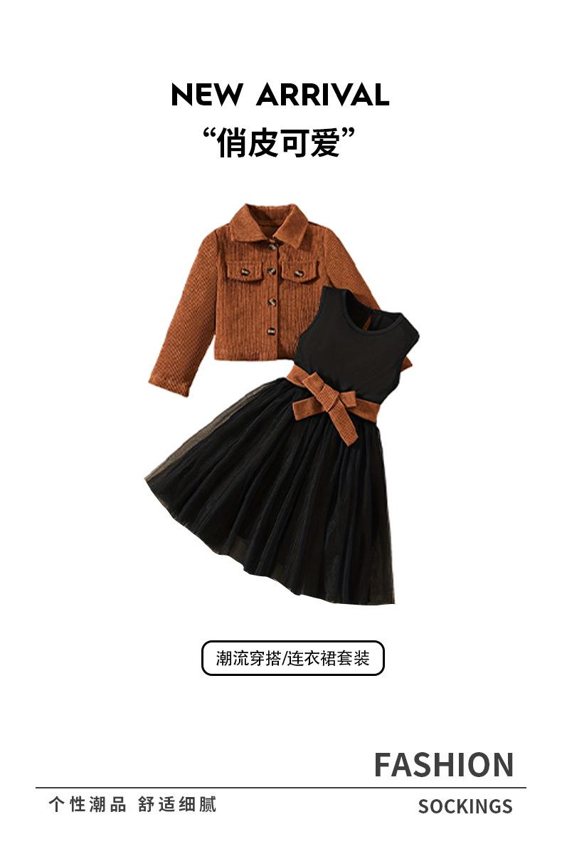 소녀 코듀로이 코트 스커트 세트 다크 브라운 컬러 싱글 브레스트 긴팔 탑 조끼 메쉬 스커트 어린이 투피스 세트스토어 가기