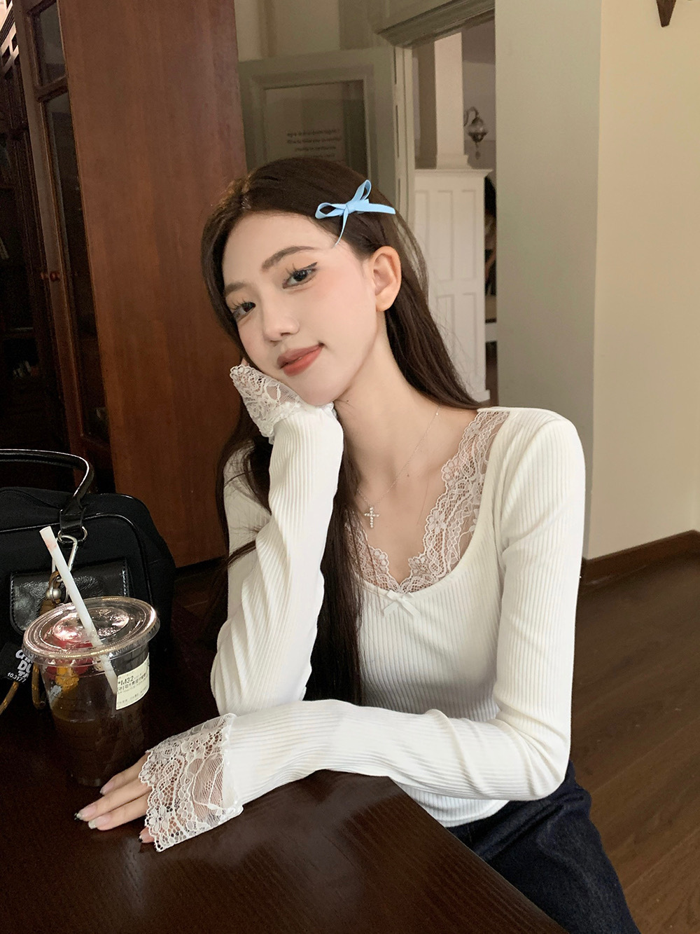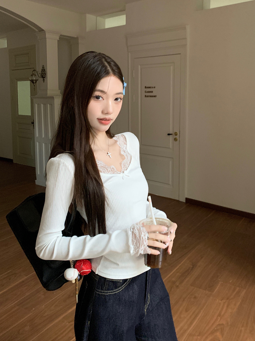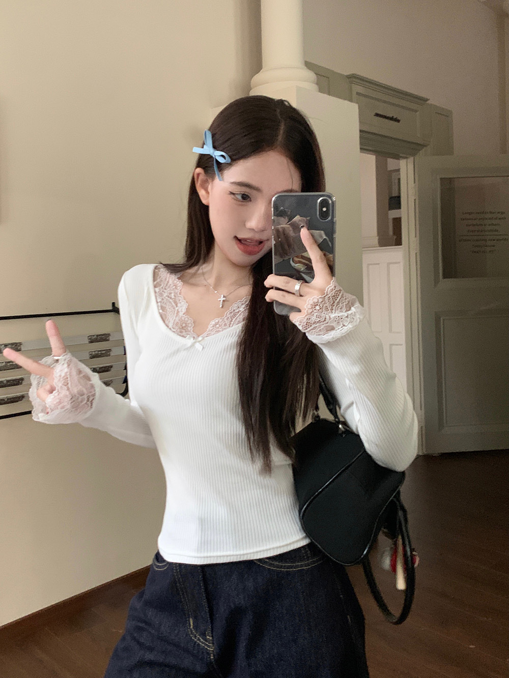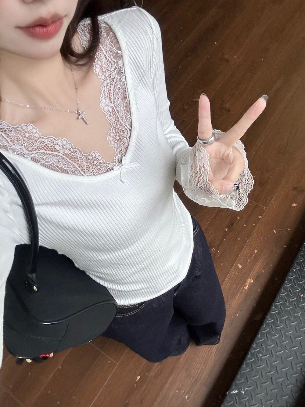 달콤하고 매운 레이스 바느질 V 넥 긴팔 스웨터 여성의 봄과 가을 새로운 슬림 핏 슬리밍 순수한 욕망 내베이스 탑