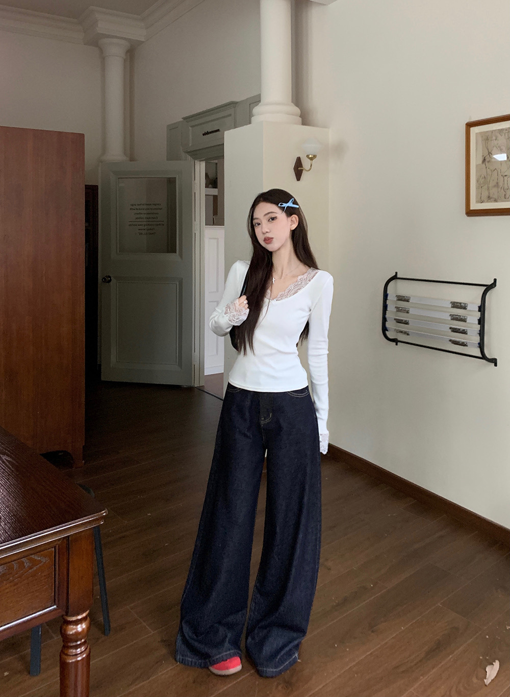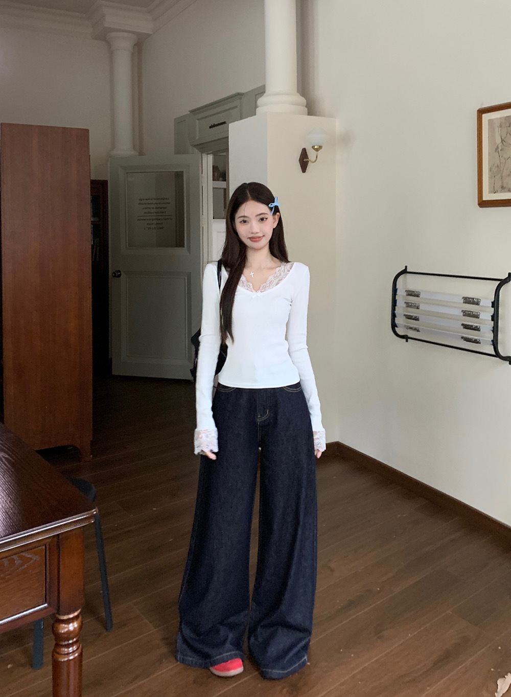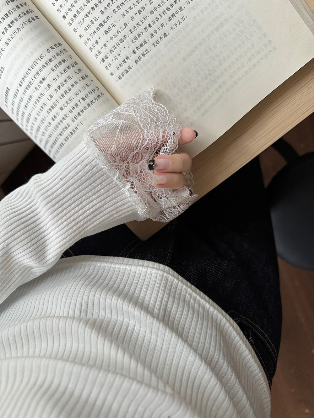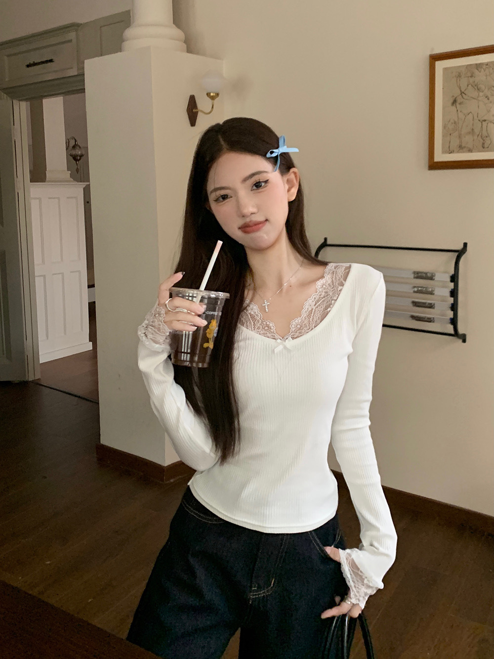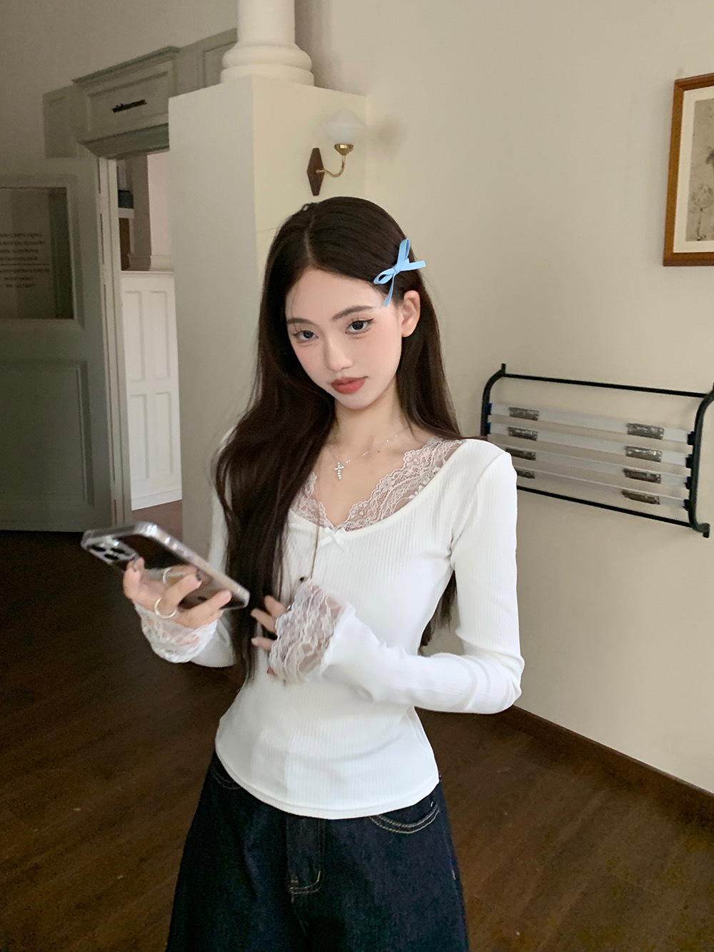 달콤하고 매운 레이스 바느질 V 넥 긴팔 스웨터 여성의 봄과 가을 새로운 슬림 핏 슬리밍 순수한 욕망 내베이스 탑