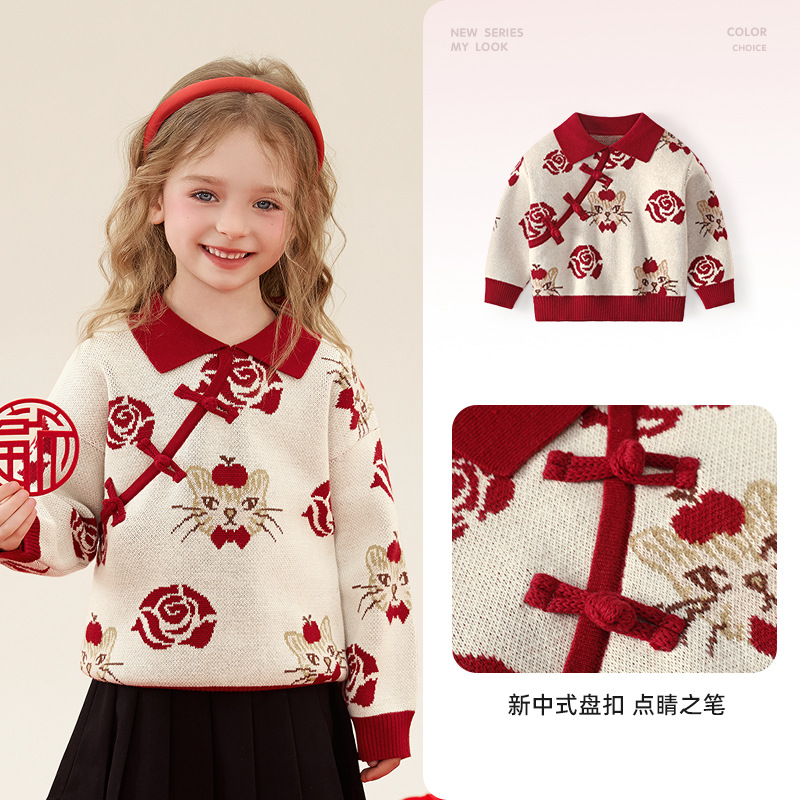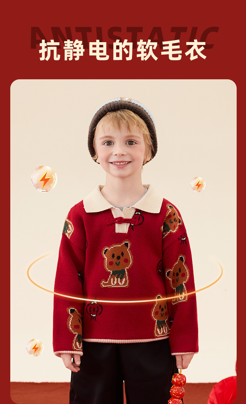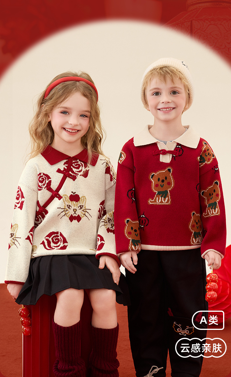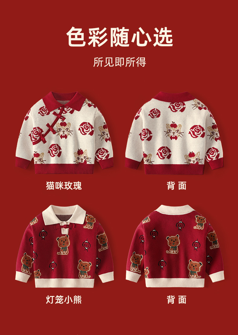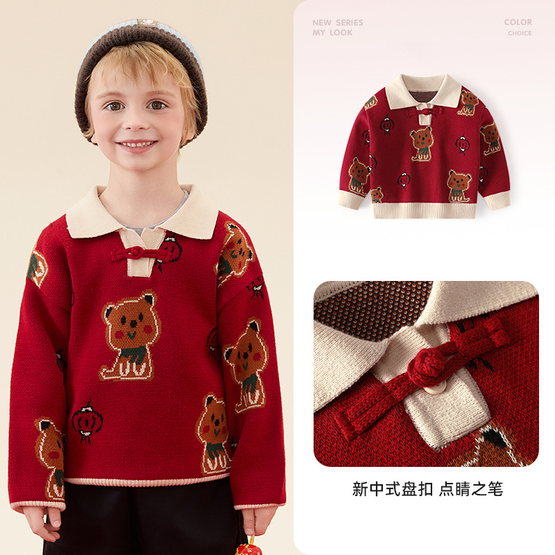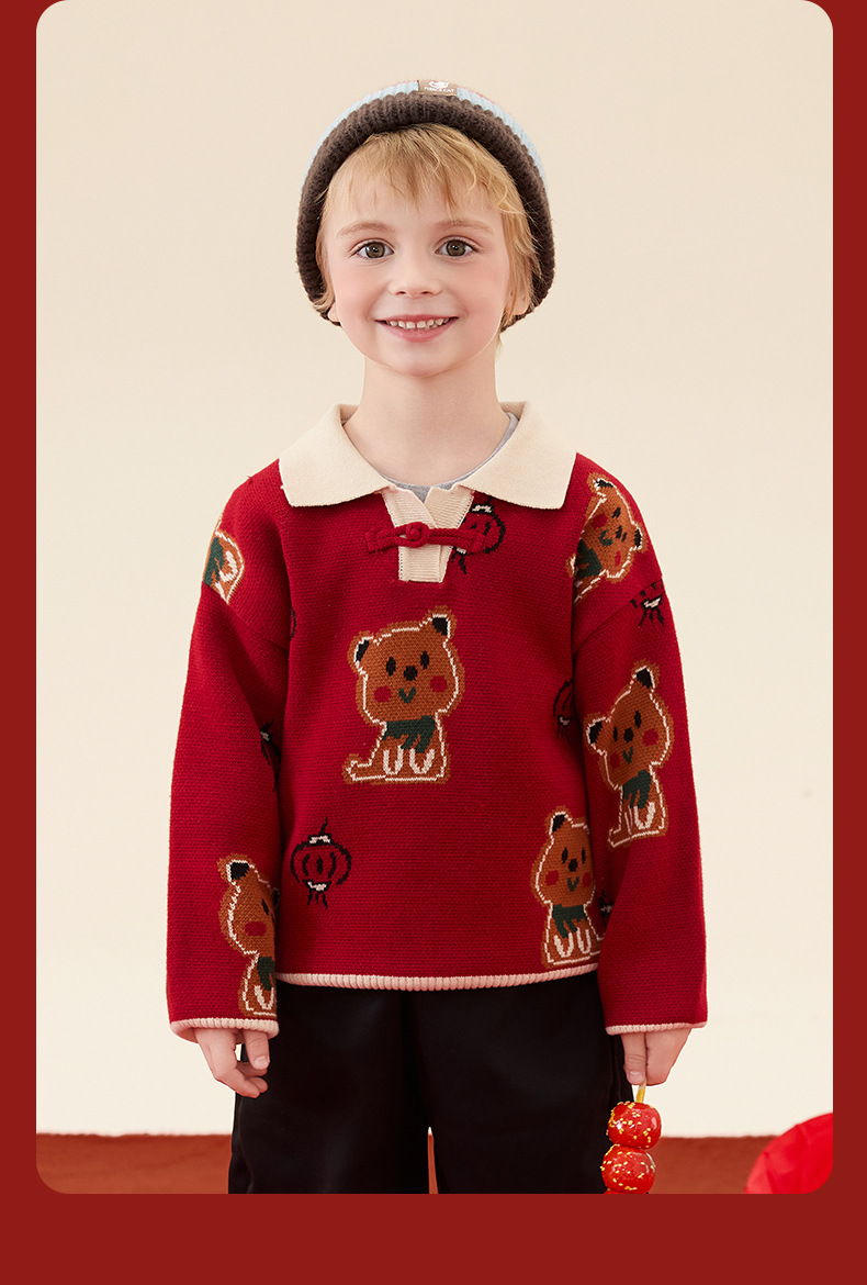 구와미 겨울 설날 중소형 어린이 색조 만화 랜턴 베어 새 중국 스타일 소년 니트 풀오버 스웨터