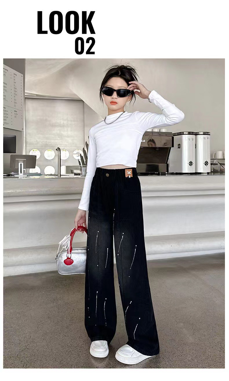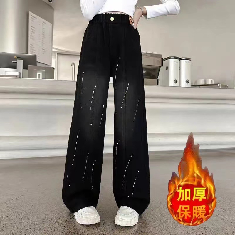 여아용 바지 청바지 2025 가을 겨울 신상 중대형 아동용 한국 스타일 플리스 안감 두꺼운 보온 스트레이트 와이드 팬츠