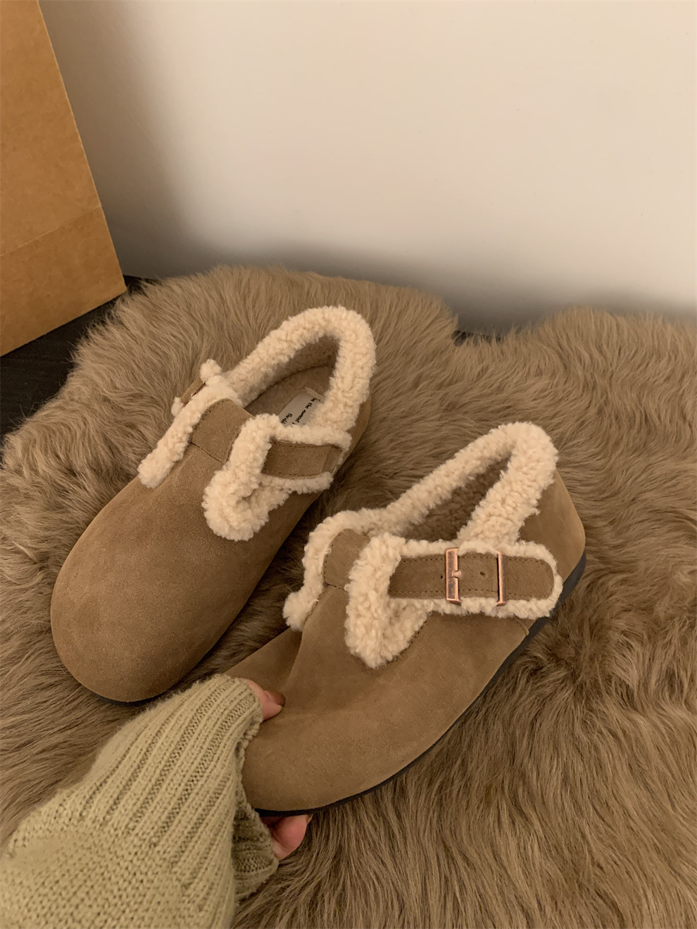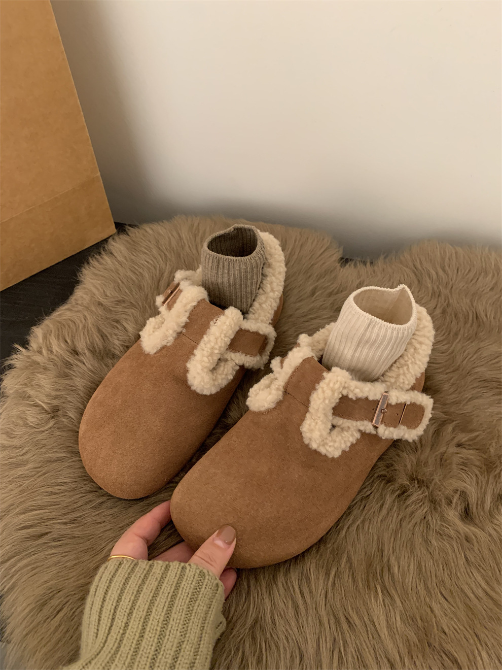 부드러운 가죽 버전! 두꺼운 밑창 다크 브라운 기모 Birkenstocks 신발 마오 마오 신발 여성 신발 외부 착용 가을 및 겨울 따뜻한 코튼 신발 스노우 부츠