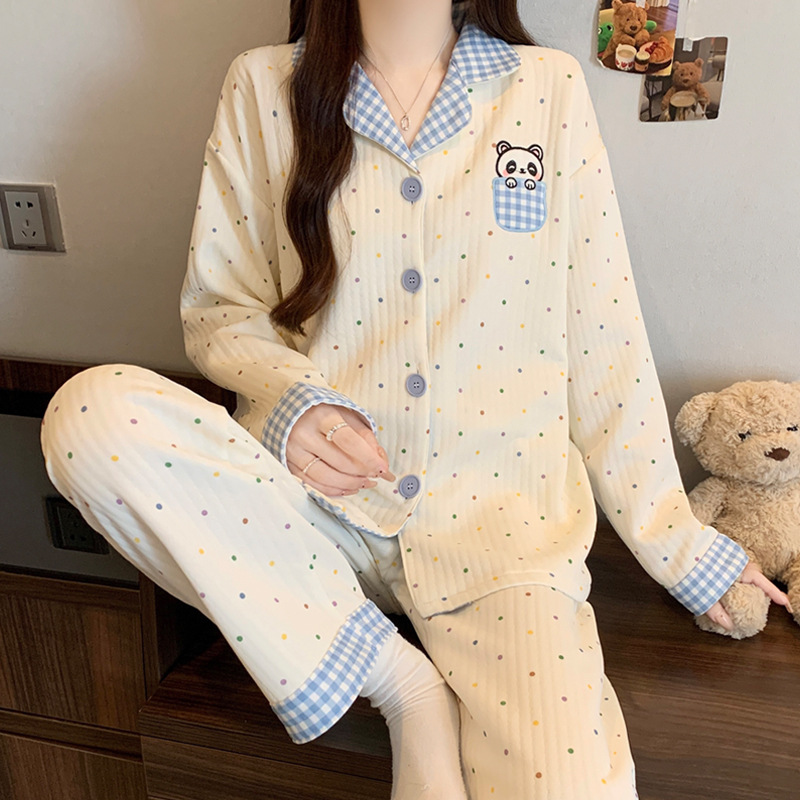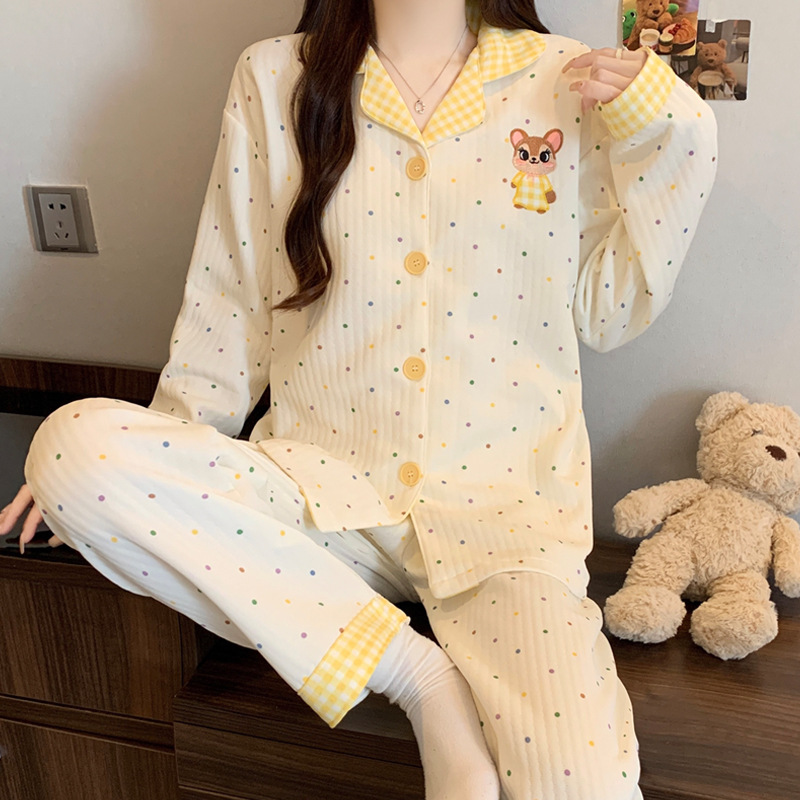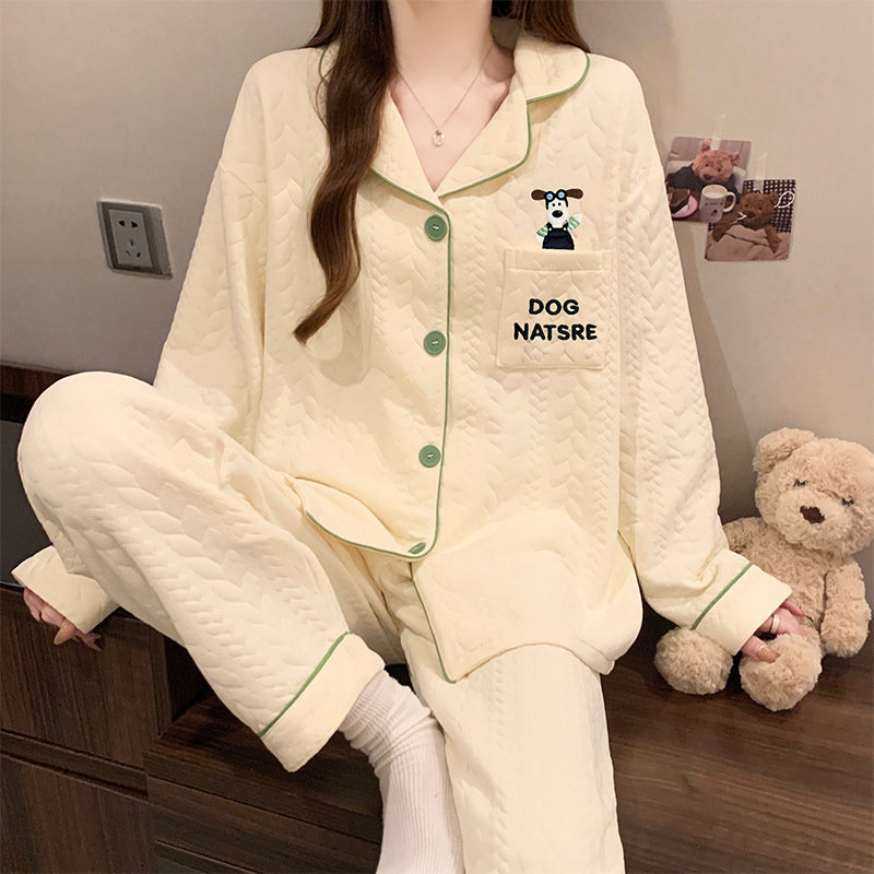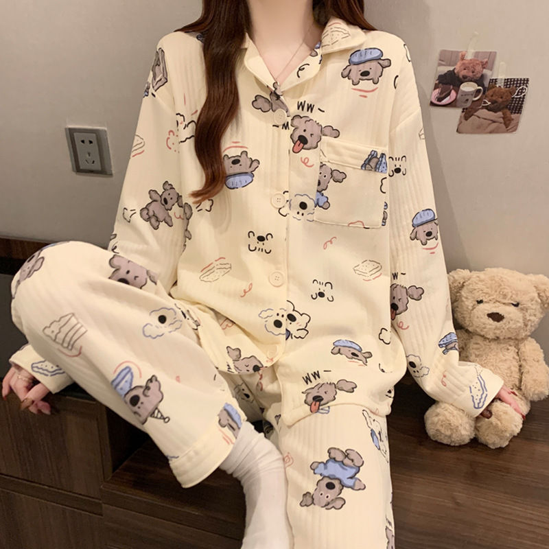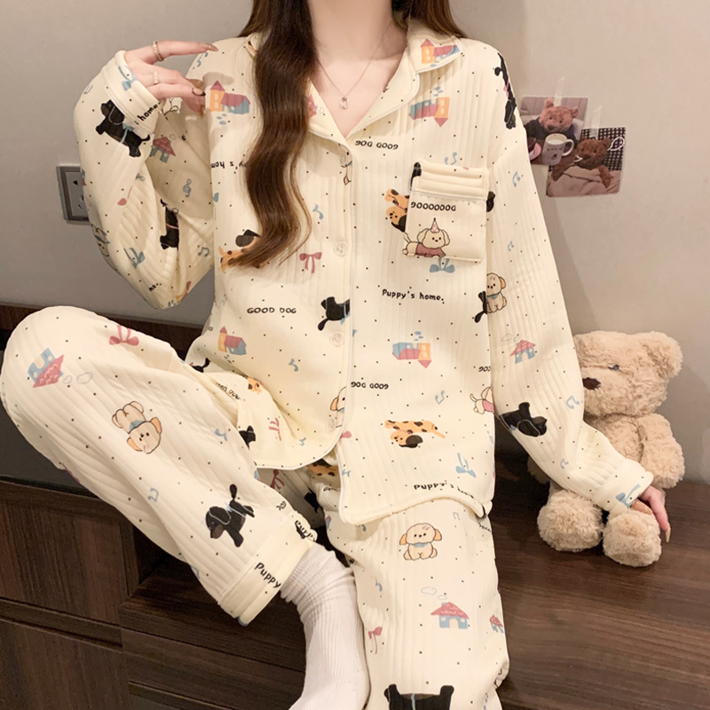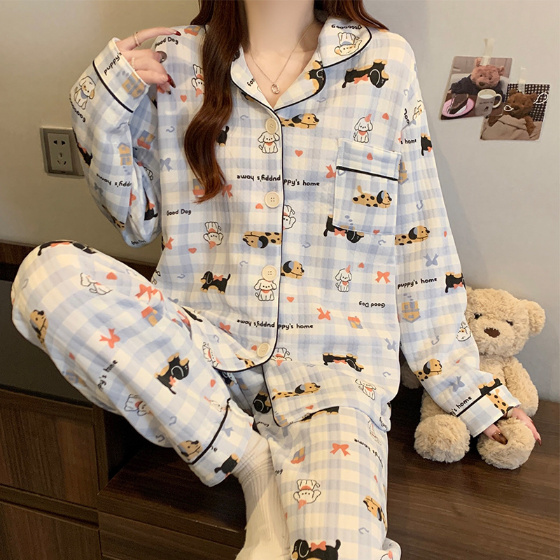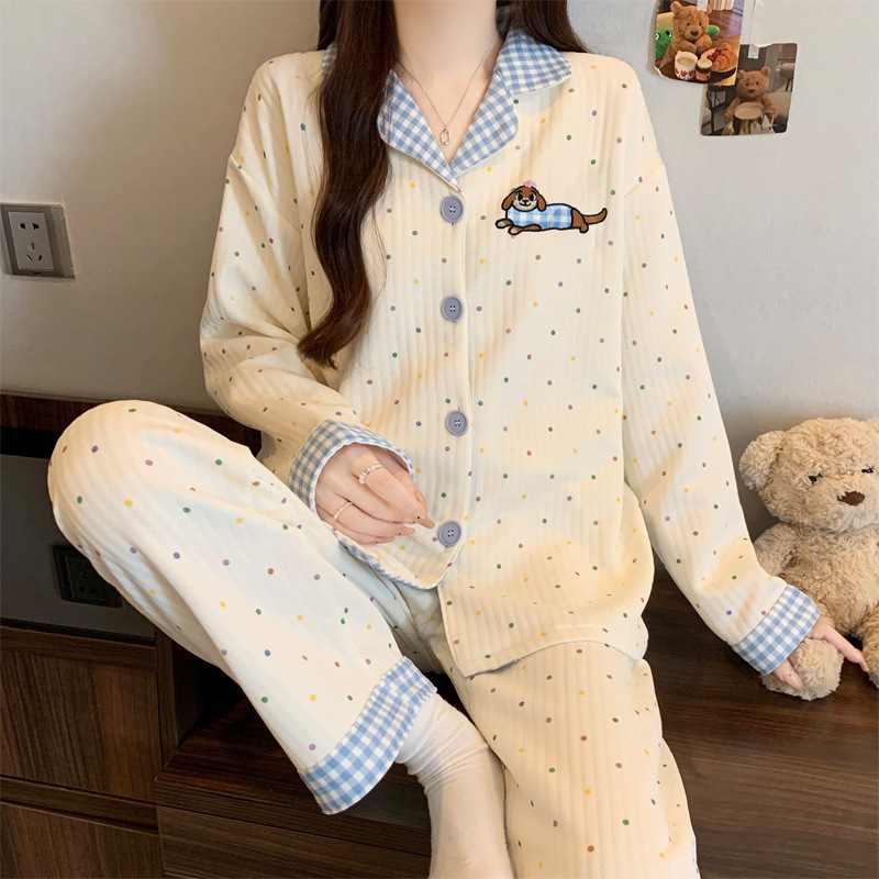 닥스훈트 잠옷 가을 겨울 여성용 따뜻하고 달콤한 체크무늬 에어 코튼 캐주얼 인기 만화 홈웨어 세트 도매스토어 가기