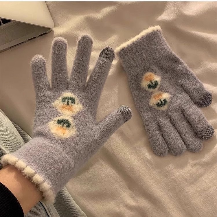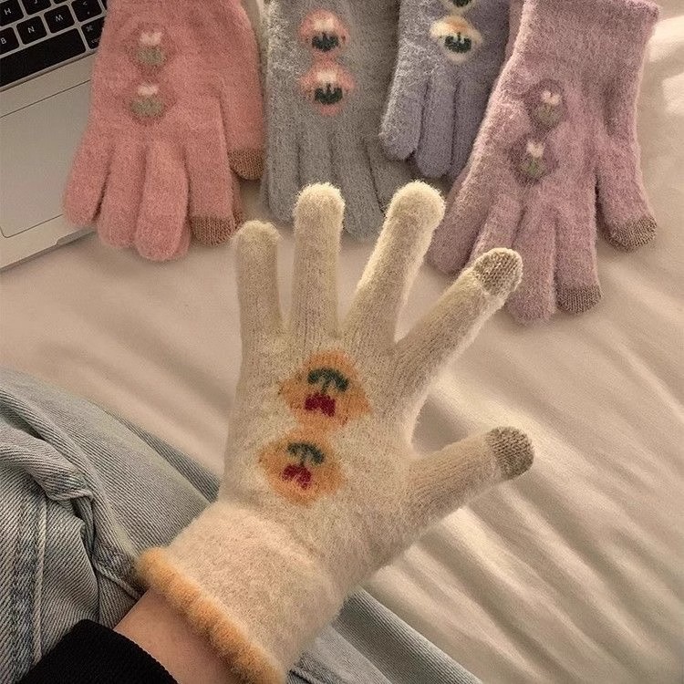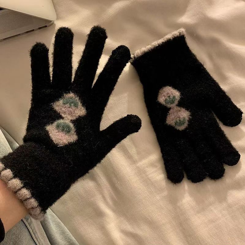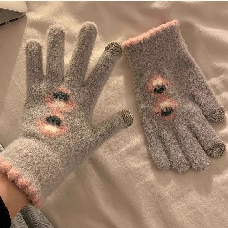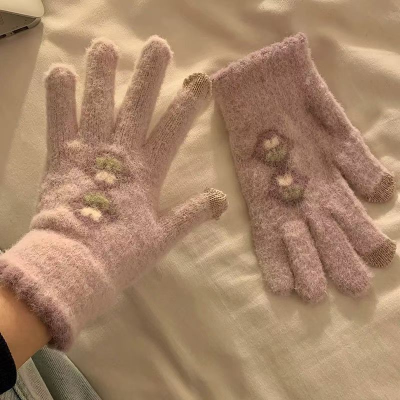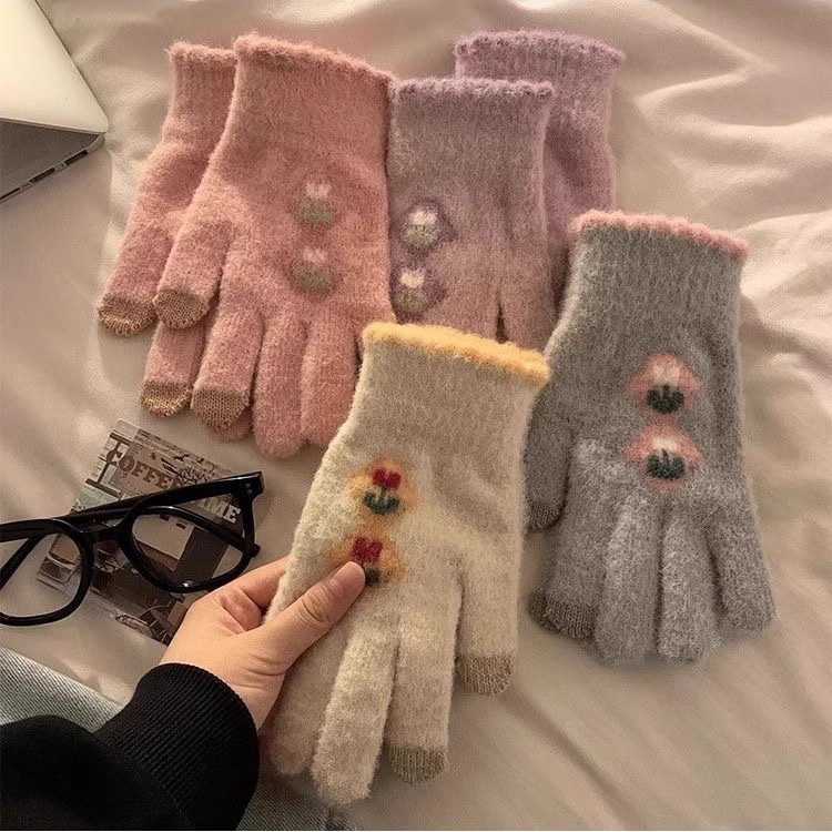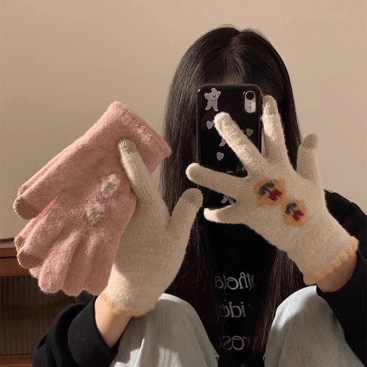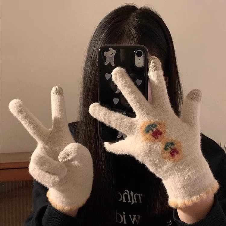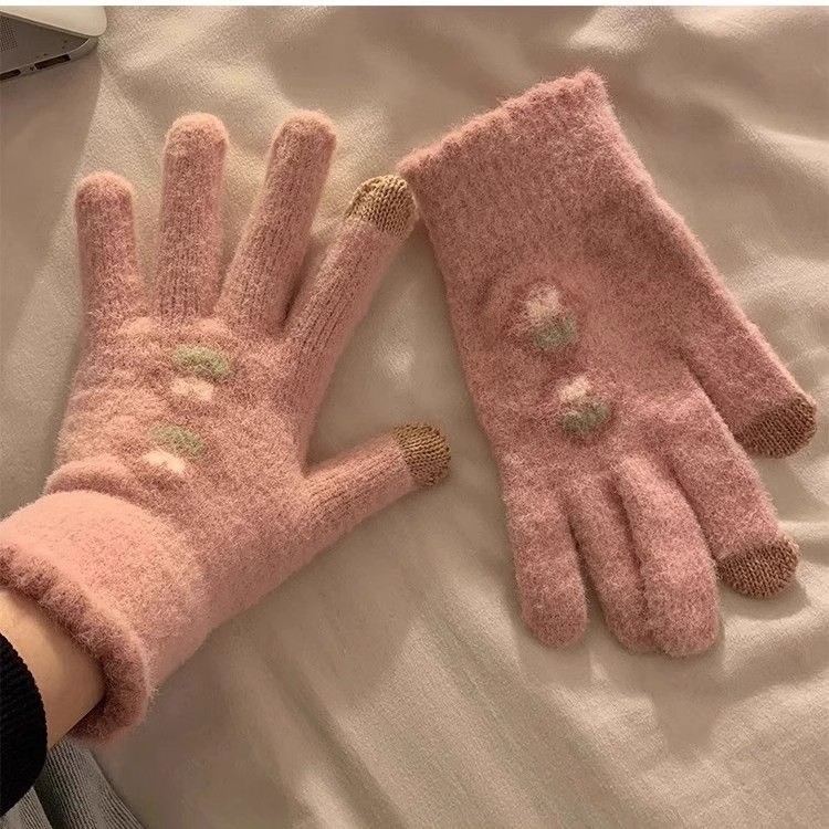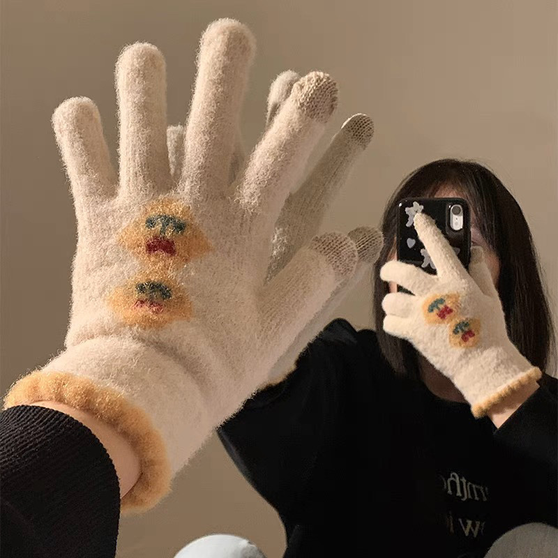 귀여운 터치 스크린 봉제 니트 5 손가락 장갑 여성의 겨울 따뜻한 기모 두꺼운 학생 자전거 냉기를 타고