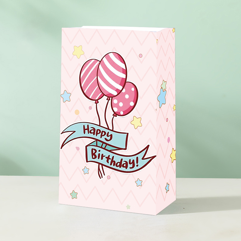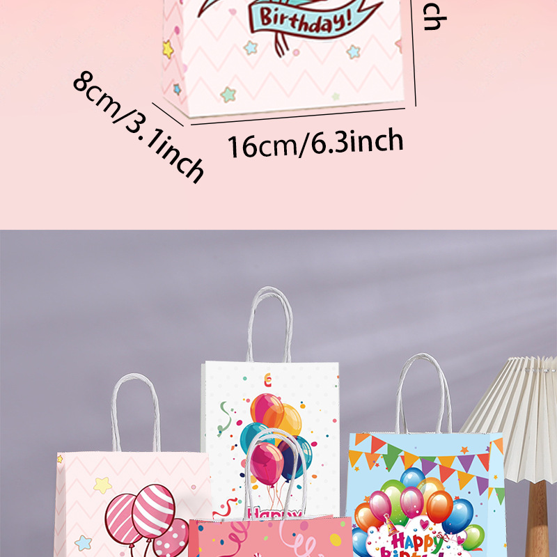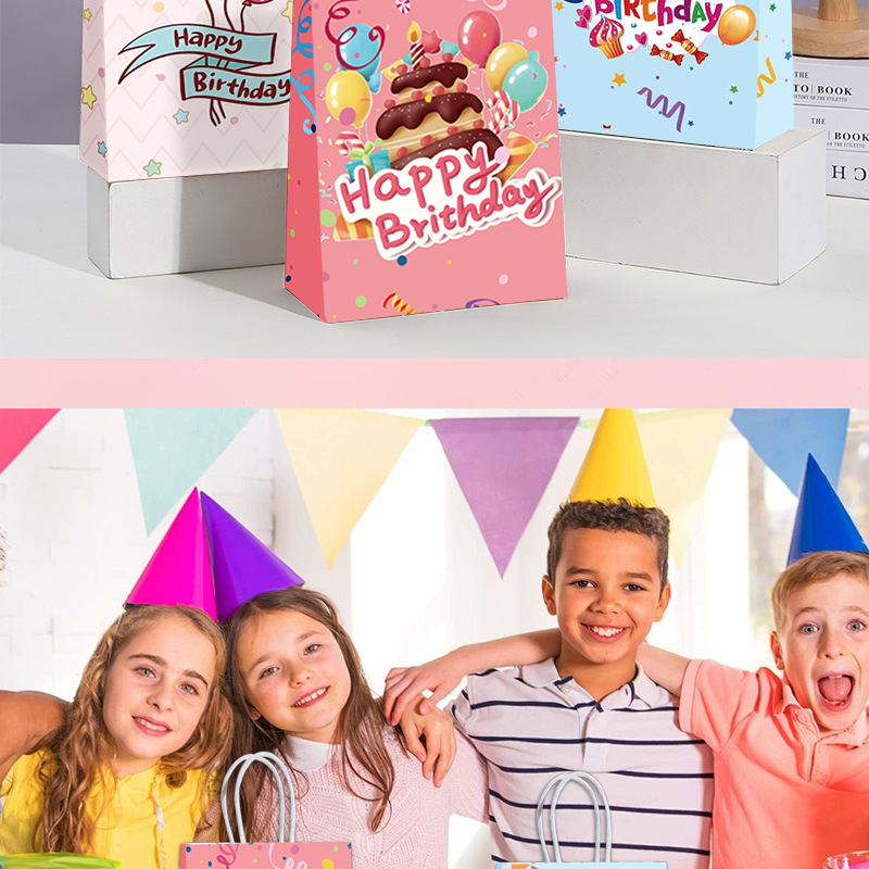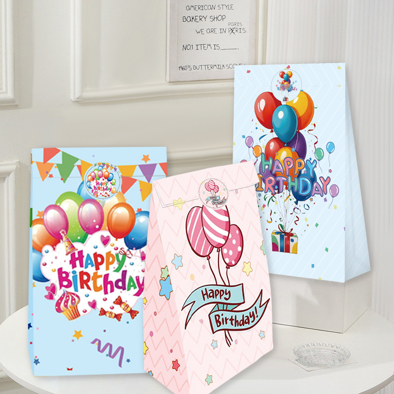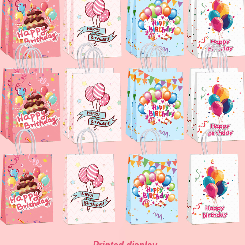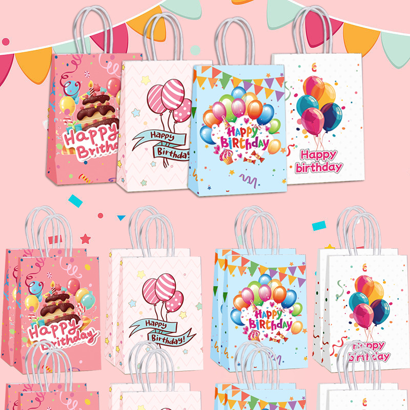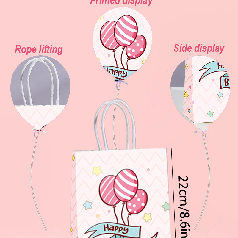 국경을 넘는 생일 파티 선물 가방, 만화 풍선 케이크, 스티커가 있는 크래프트 종이 핸드백, 휴대용 포장지 가방스토어 가기