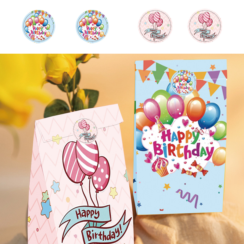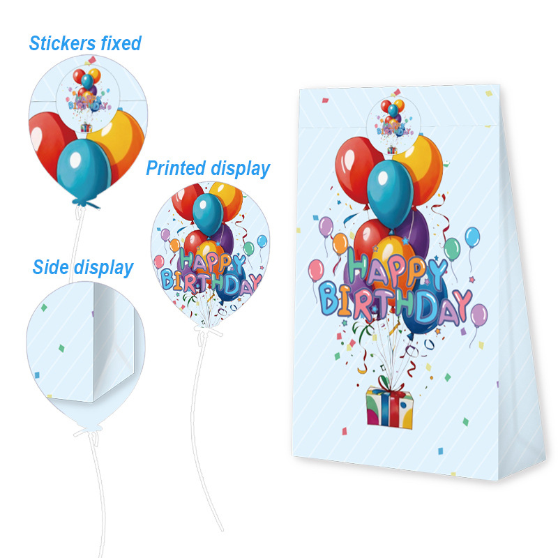 국경을 넘는 생일 파티 선물 가방, 만화 풍선 케이크, 스티커가 있는 크래프트 종이 핸드백, 휴대용 포장지 가방