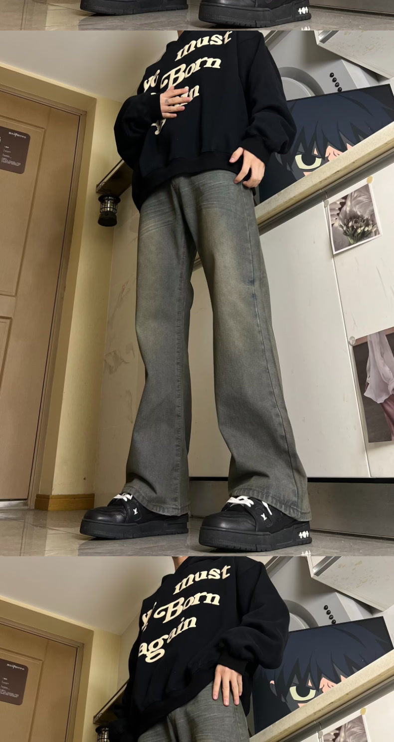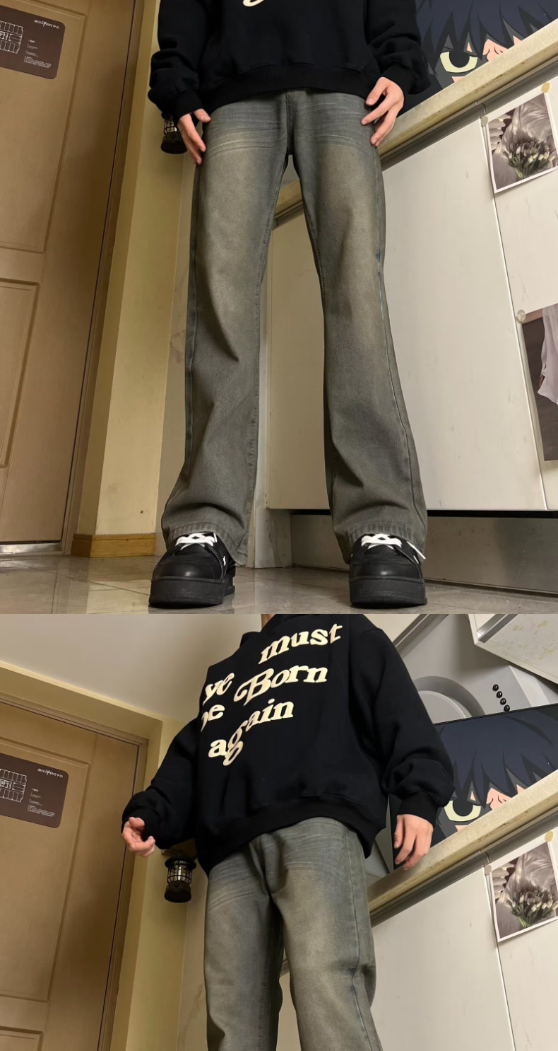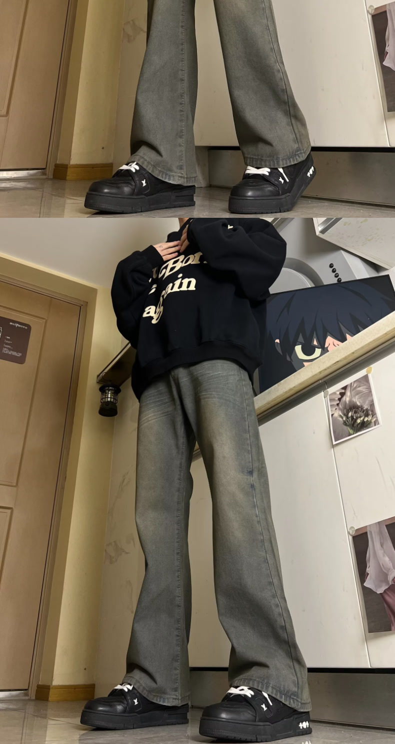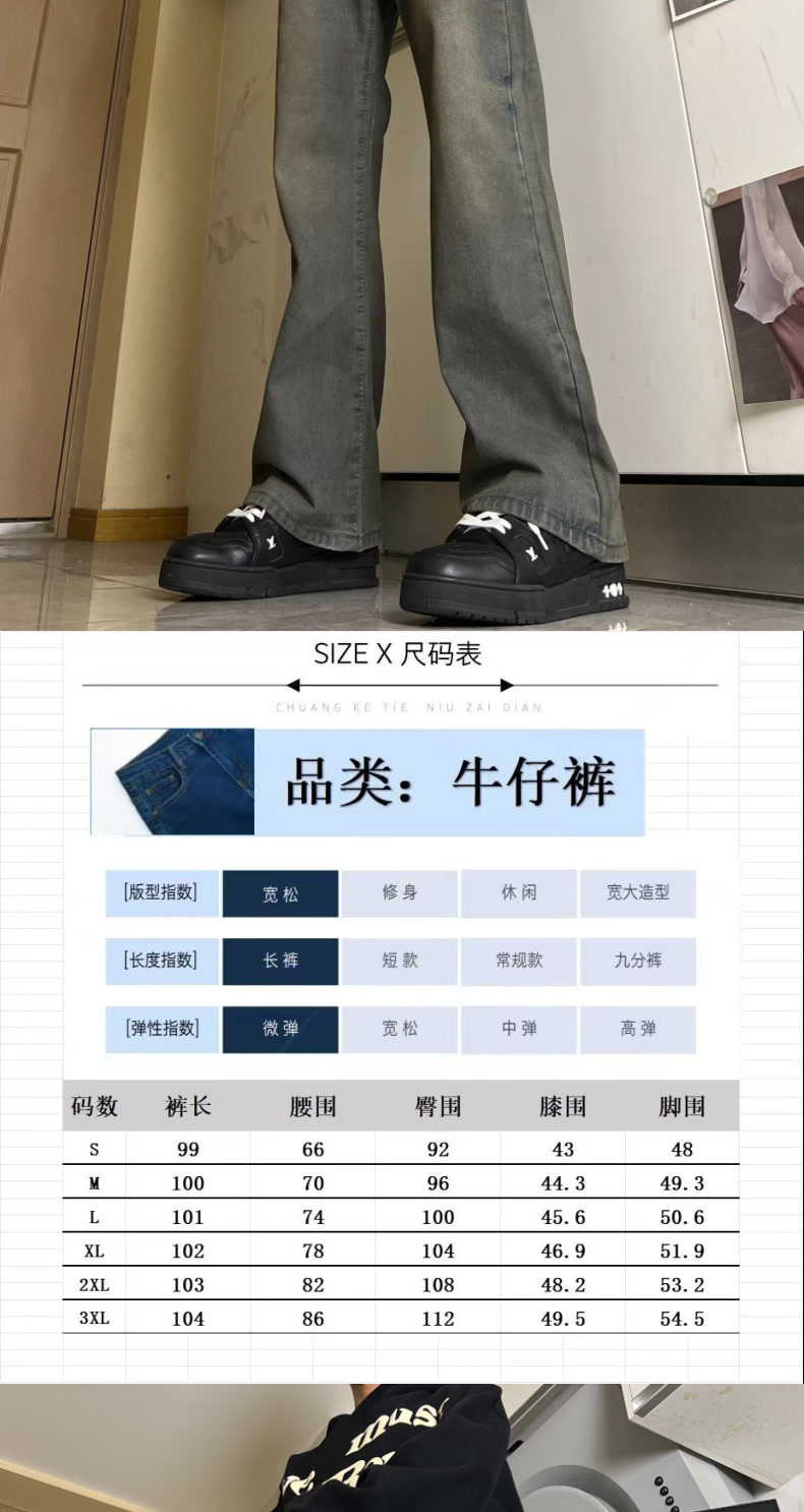 빈티지 블루 청바지 남성용 가을 키 큰 마이크로 플레어 바지 스트레이트 아메리칸 바이브 바지 하이 스트리트 세탁 가능스토어 가기