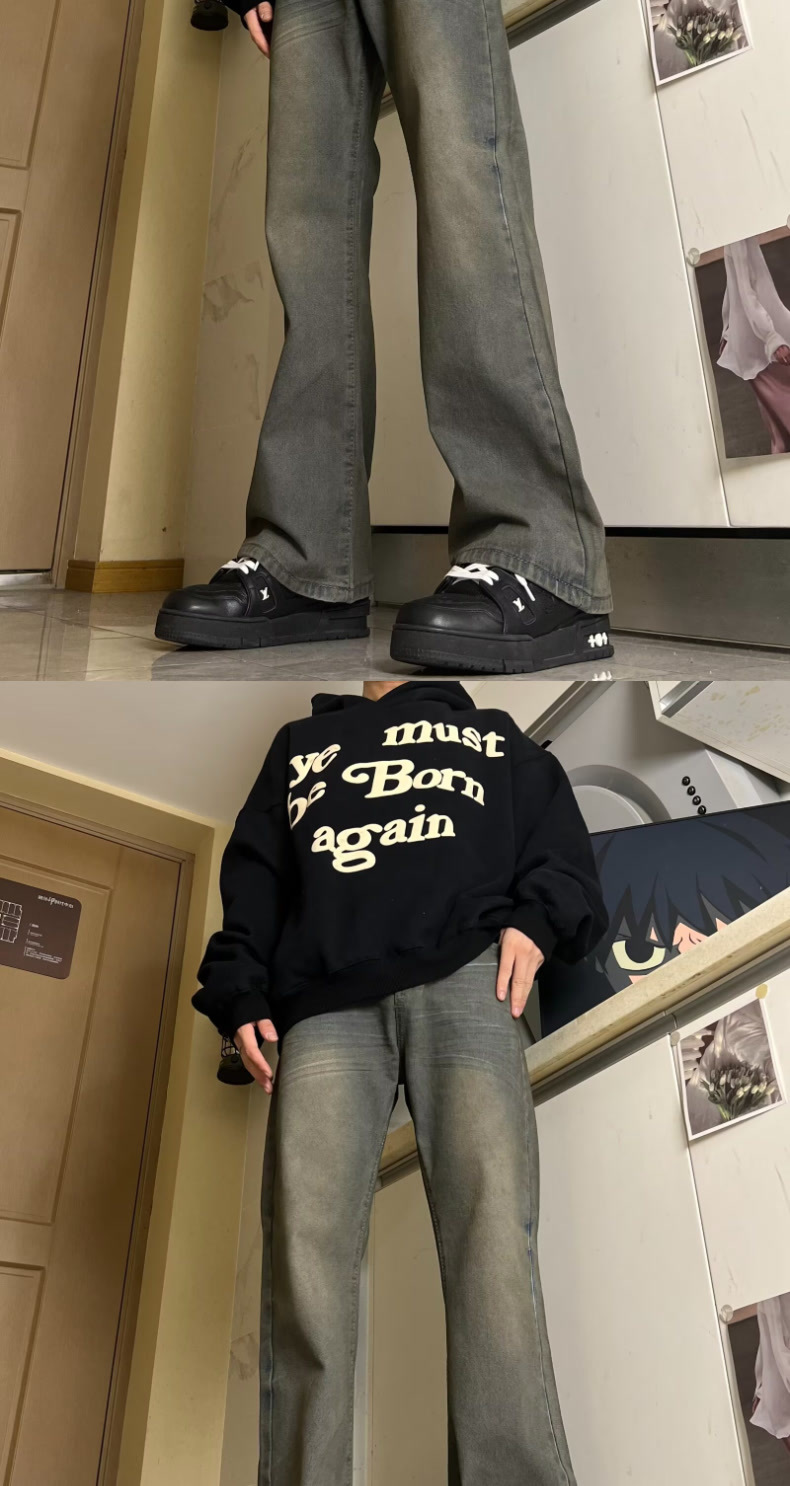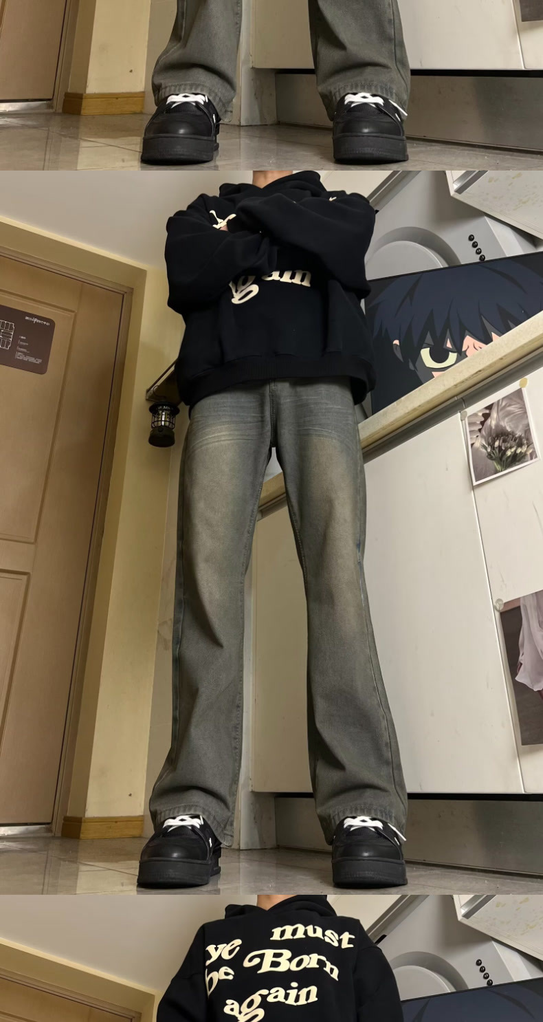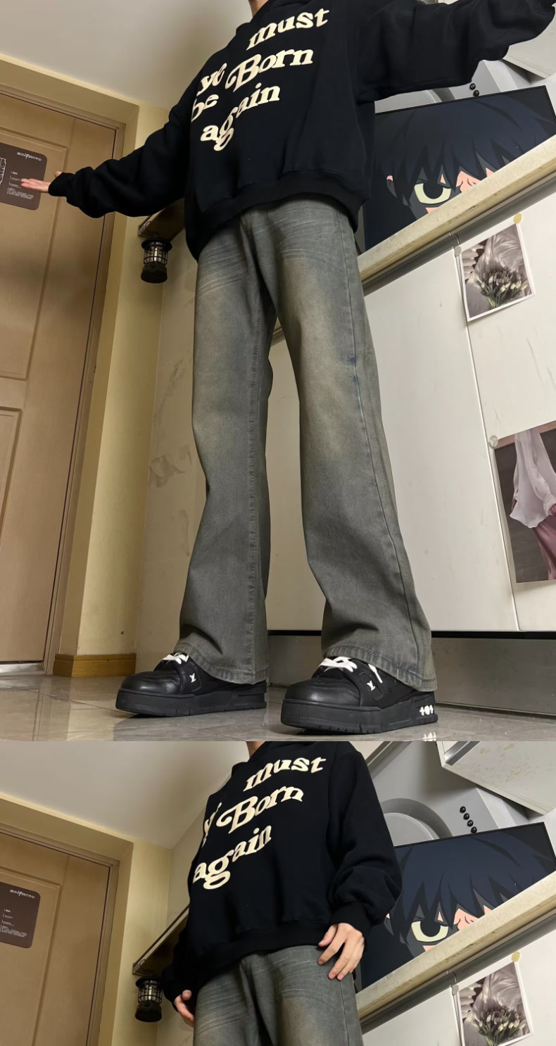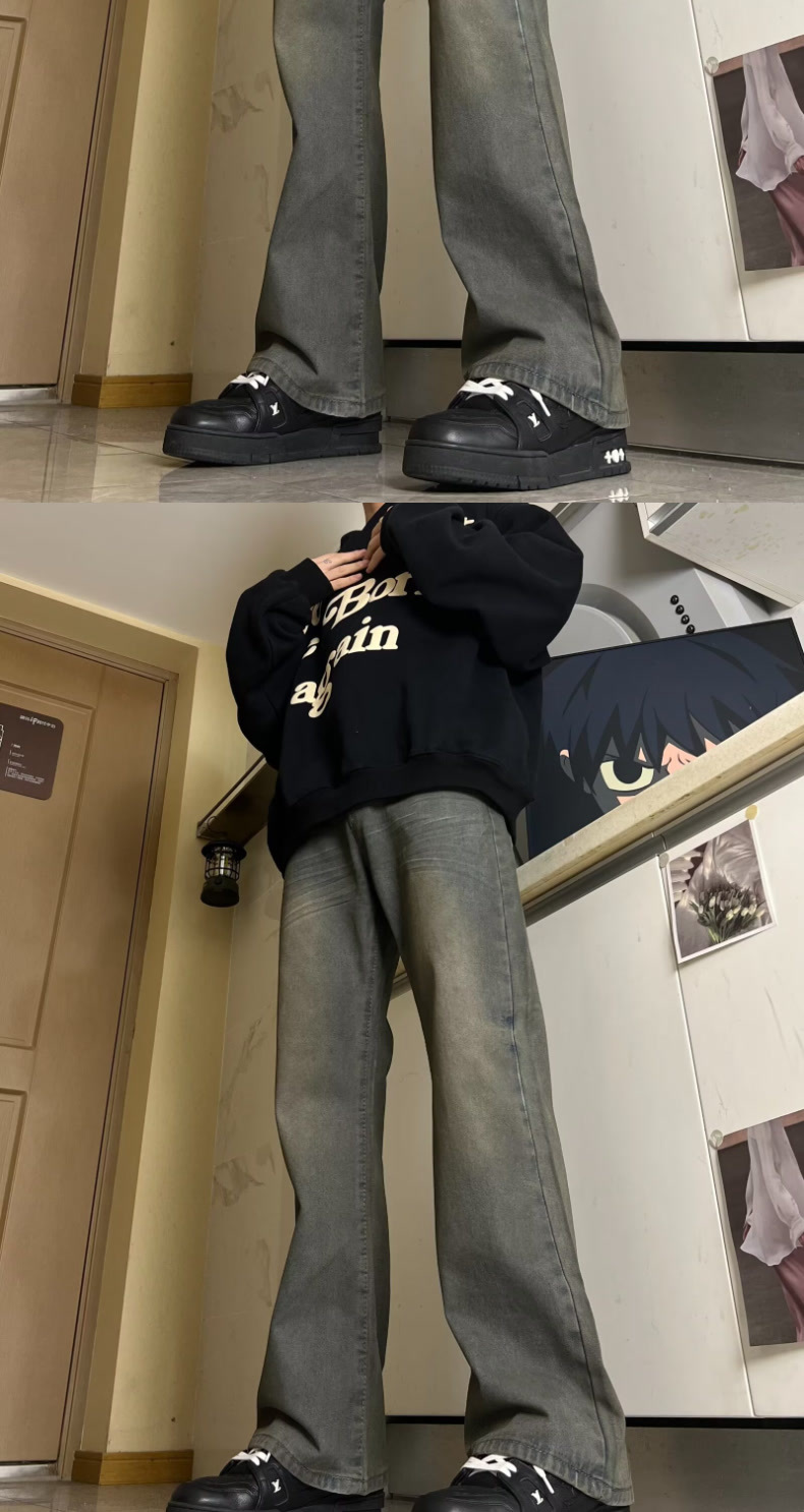 빈티지 블루 청바지 남성용 가을 키 큰 마이크로 플레어 바지 스트레이트 아메리칸 바이브 바지 하이 스트리트 세탁 가능스토어 가기