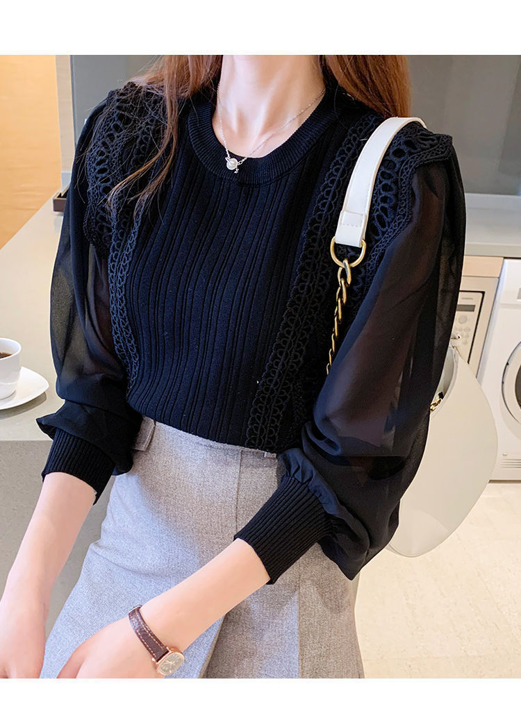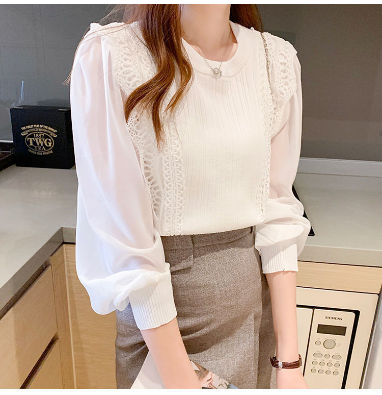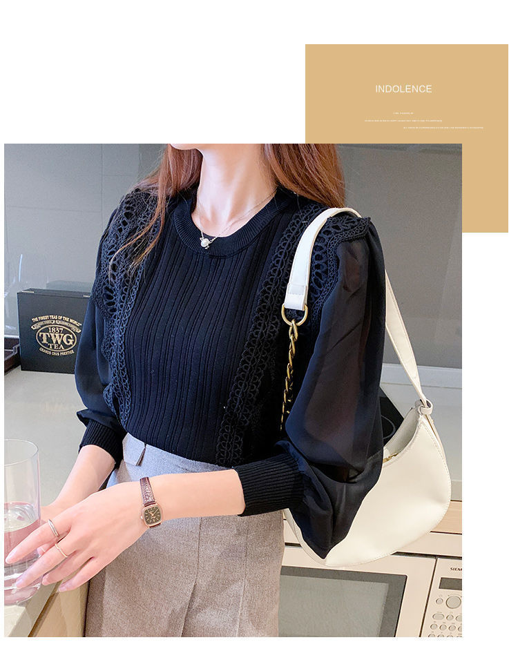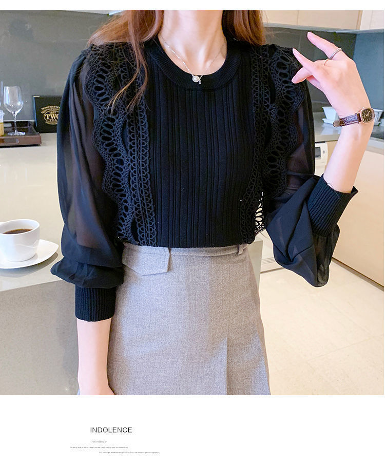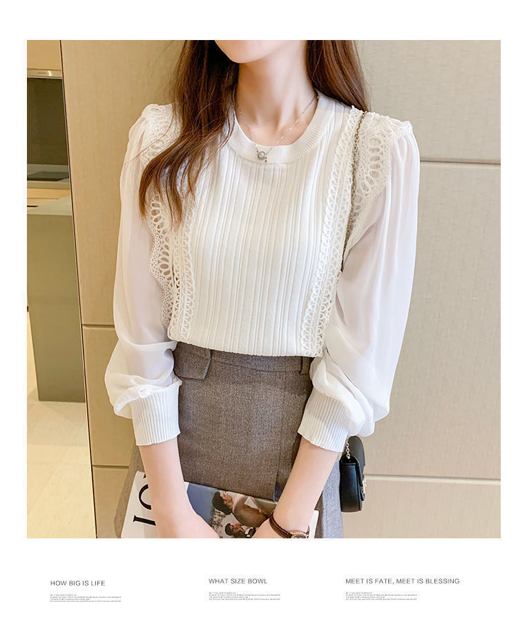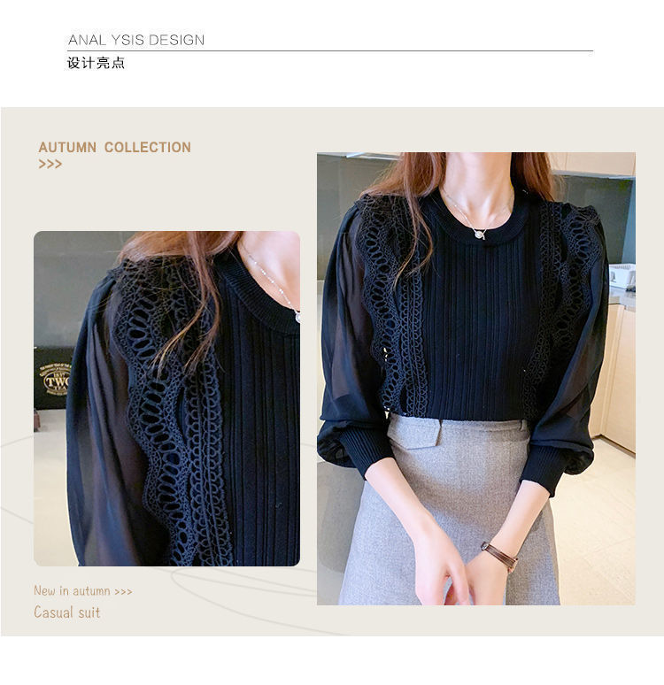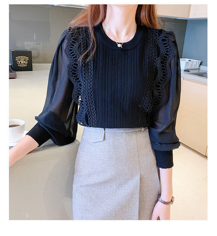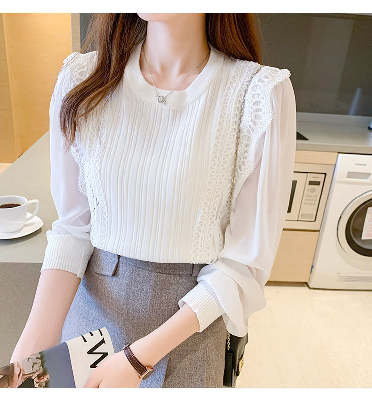 시폰 긴팔 바느질 레이스 니트웨어 여자 2021 년 새 슬림 핏 올매치 탑 가을 및 겨울 풀오버 스웨터스토어 가기