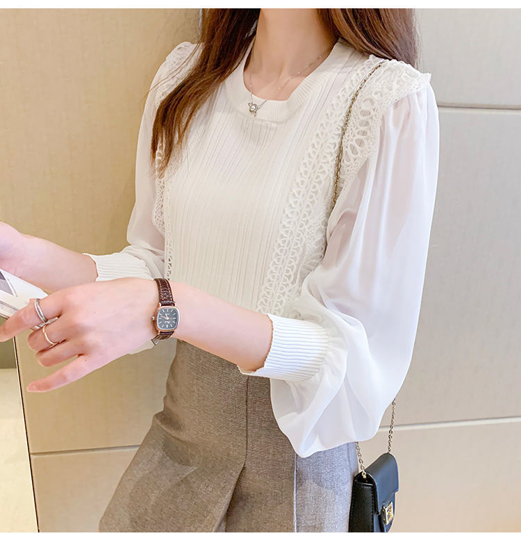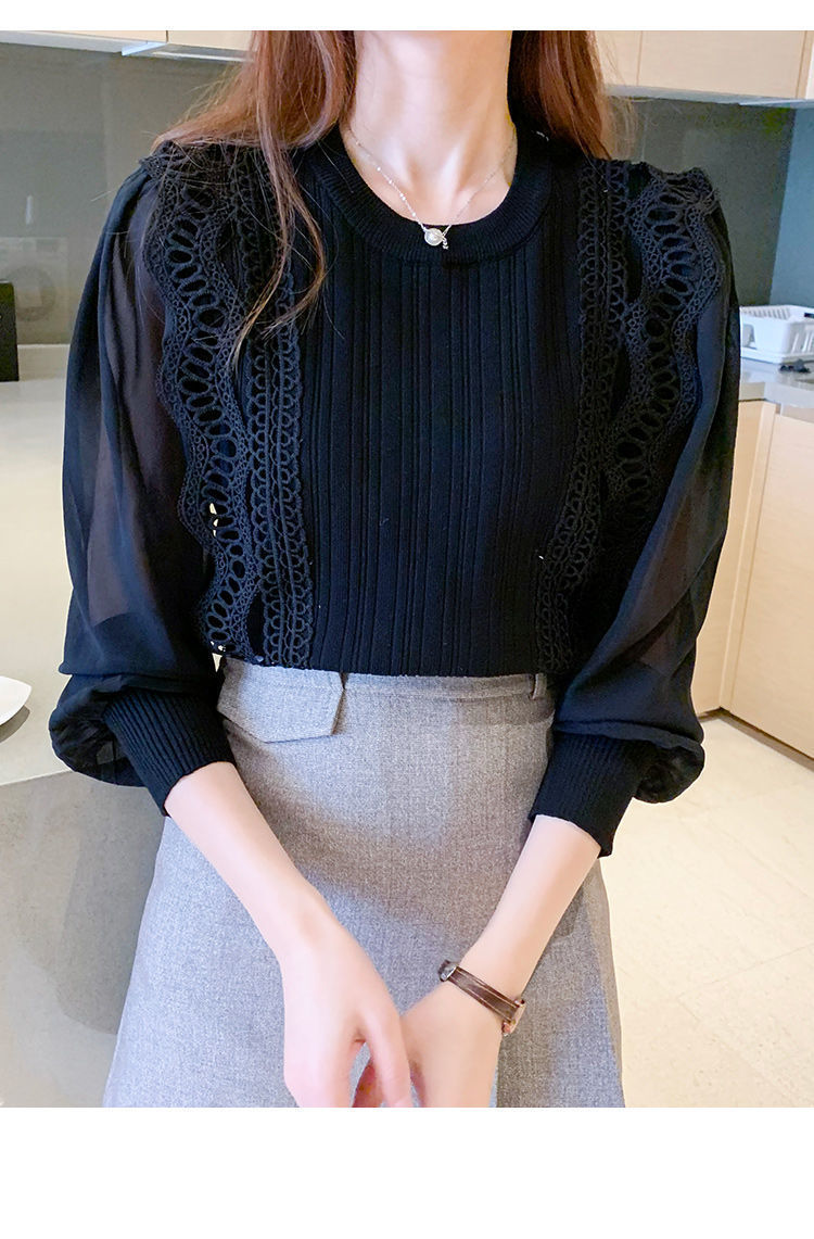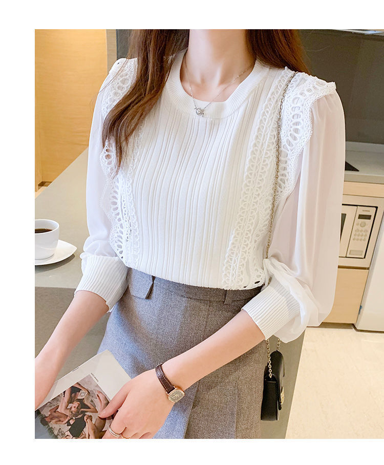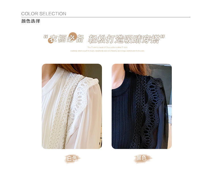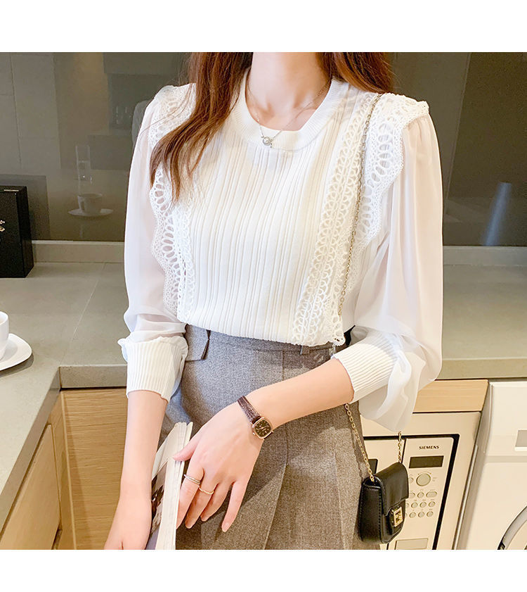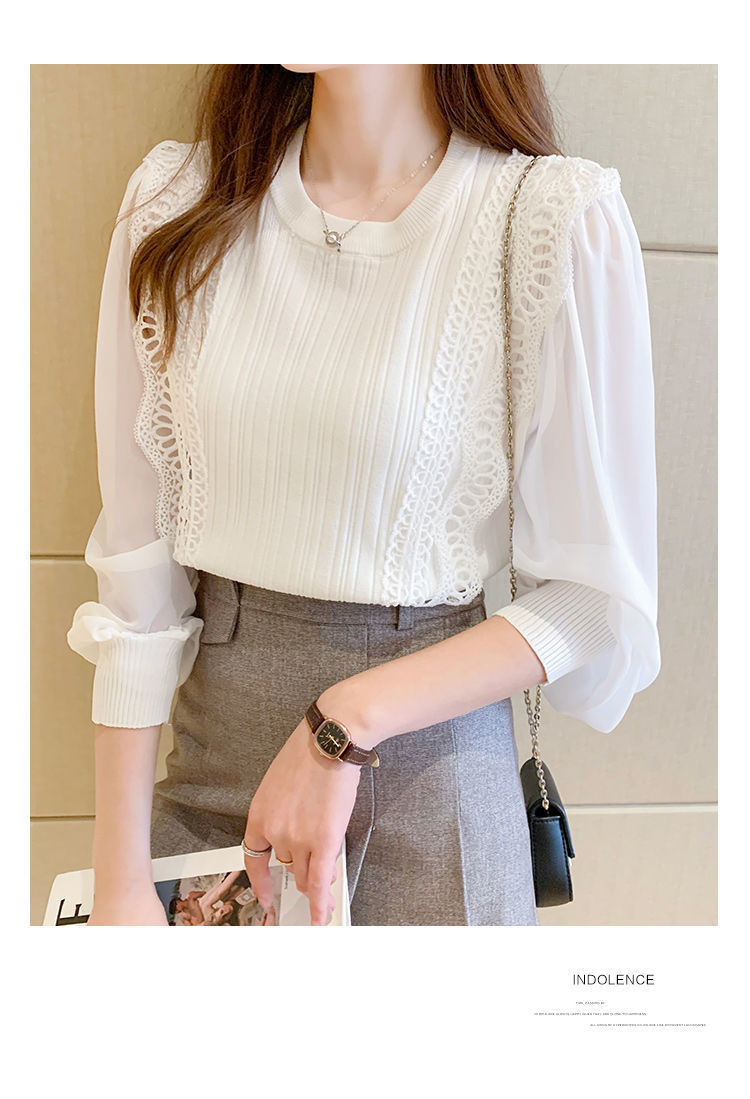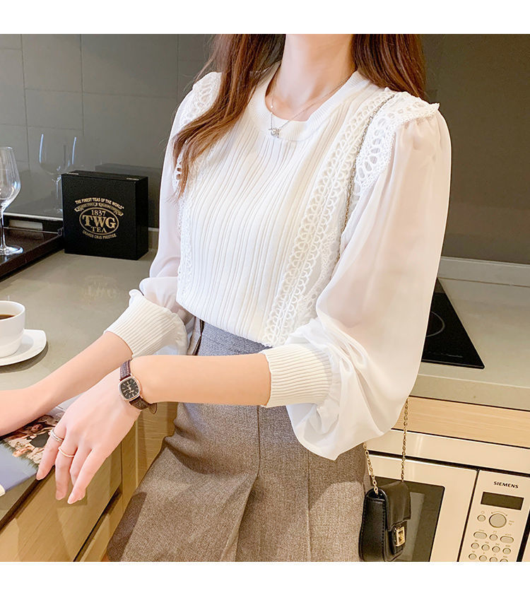 시폰 긴팔 바느질 레이스 니트웨어 여자 2021 년 새 슬림 핏 올매치 탑 가을 및 겨울 풀오버 스웨터스토어 가기