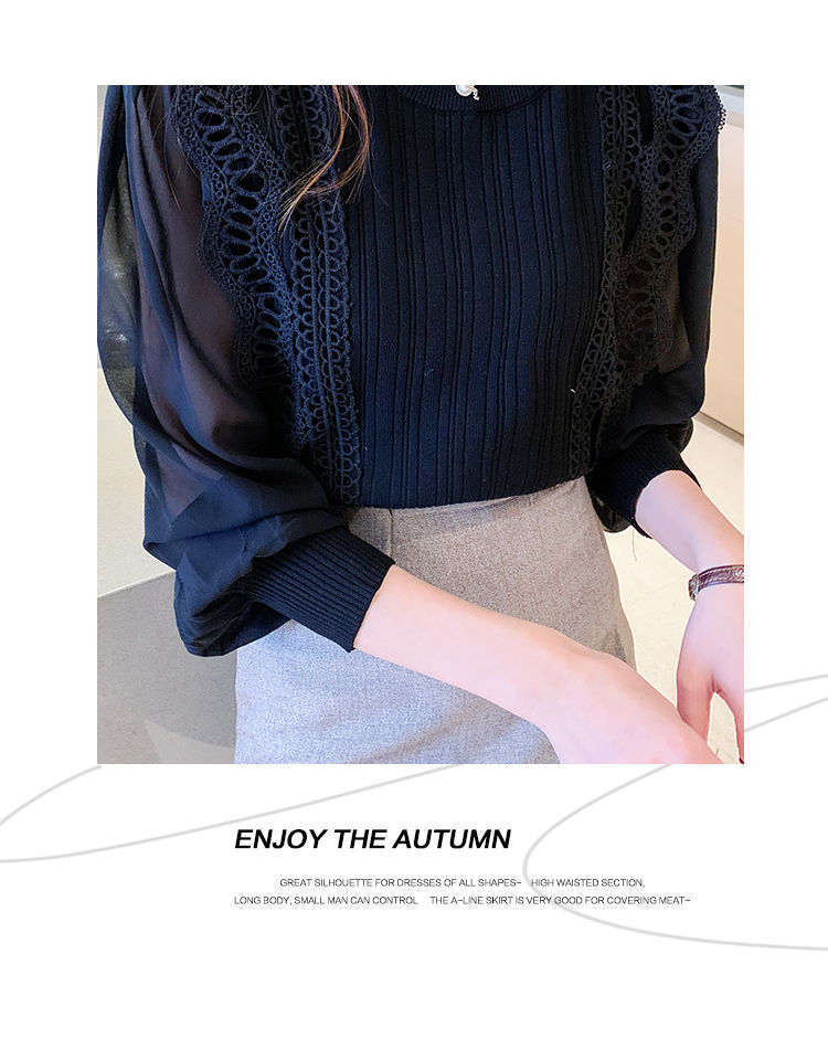 시폰 긴팔 바느질 레이스 니트웨어 여자 2021 년 새 슬림 핏 올매치 탑 가을 및 겨울 풀오버 스웨터