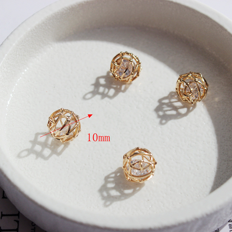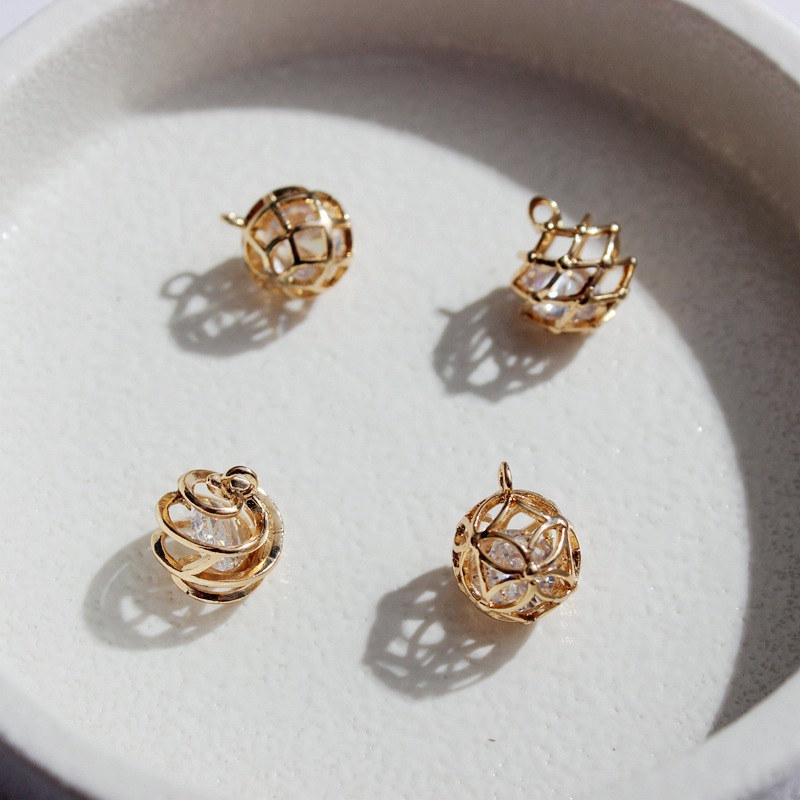 14K包金保色镂空球缠绕内嵌珍珠锆石吊坠绣球耳环耳饰DIY手工饰品
