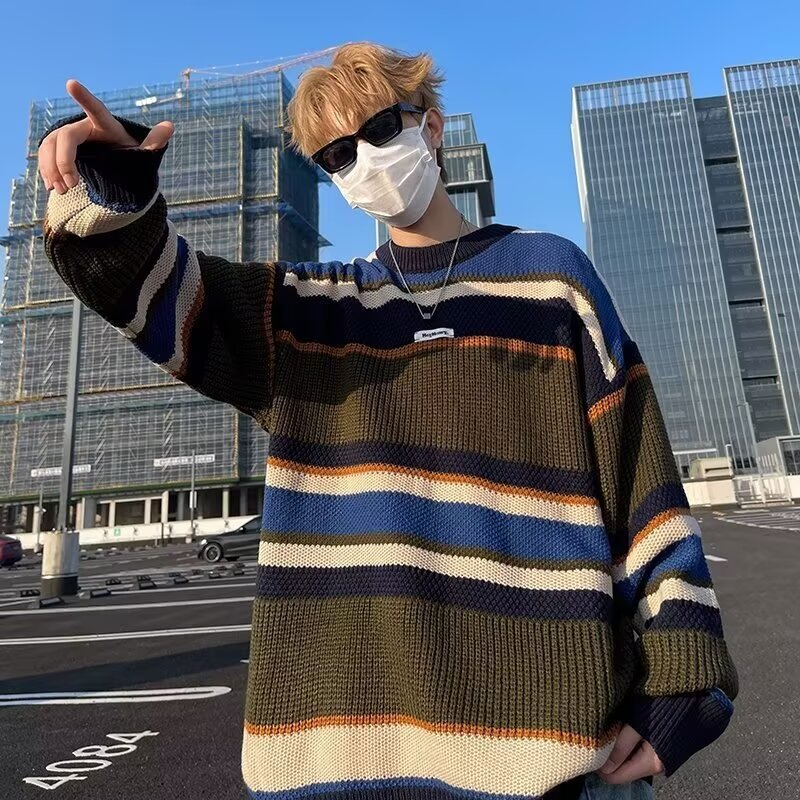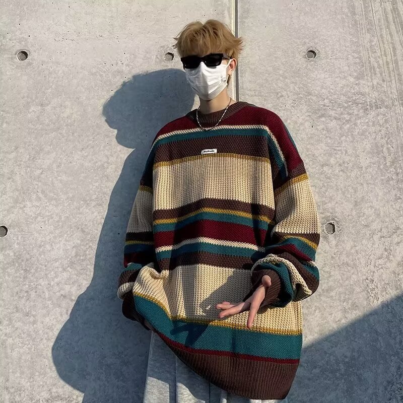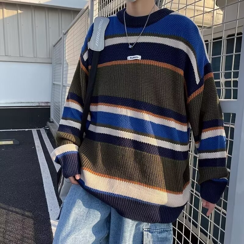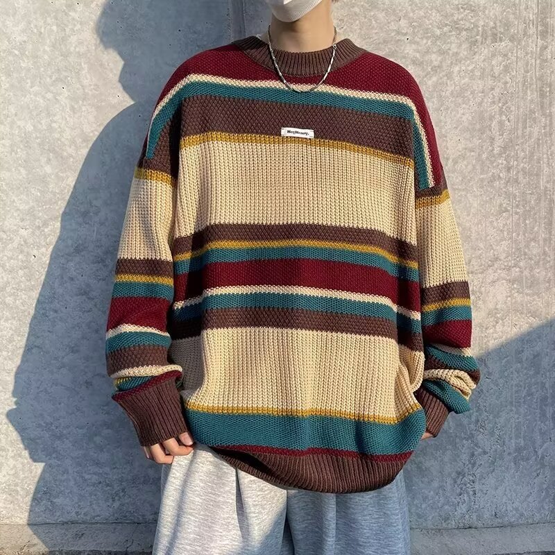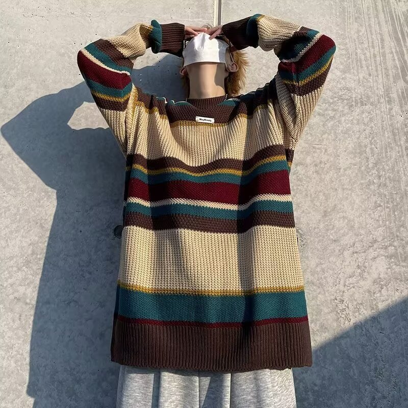 2024 새로운 빈티지 명암 줄무늬 크루 넥 스웨터 남성용 트렌디 브랜드 루즈 커플 캐주얼 올 매치 풀오버 헤어스토어 가기