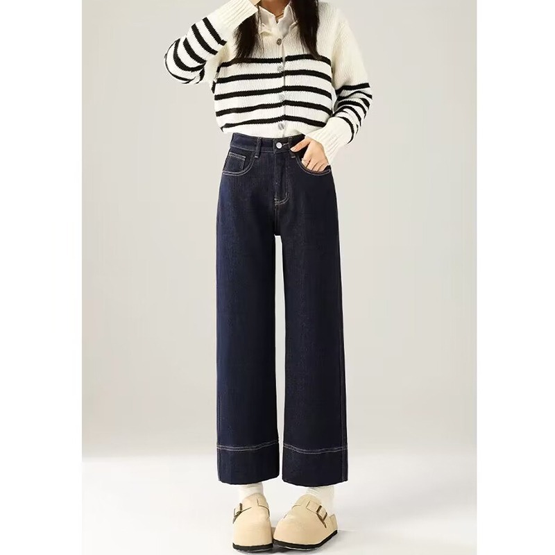 빈티지 심플 스타일 4 면 탄성 와이드 레그 스트레이트 청바지 올 매치 뉴 도착 짧은 길이 바지 2024 겨울스토어 가기