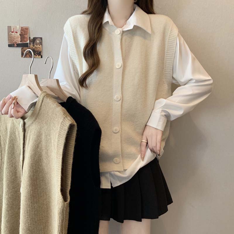 가을 2024 새로운 칼라 대비 니트 카디건 재킷 그레이 니트 주름 치마 2 피스 세트스토어 가기