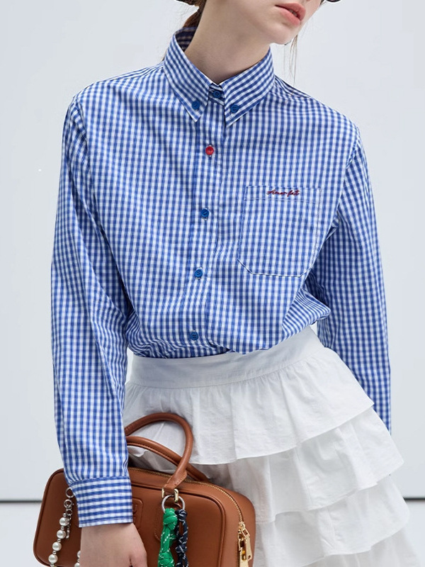 파란 격자 무늬 셔츠 여자의 가을 2024 새로운 예술적 복고풍 Miu 긴 소매 탑스토어 가기