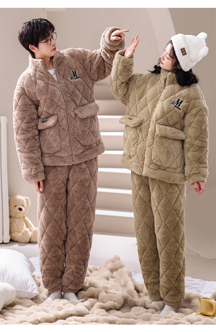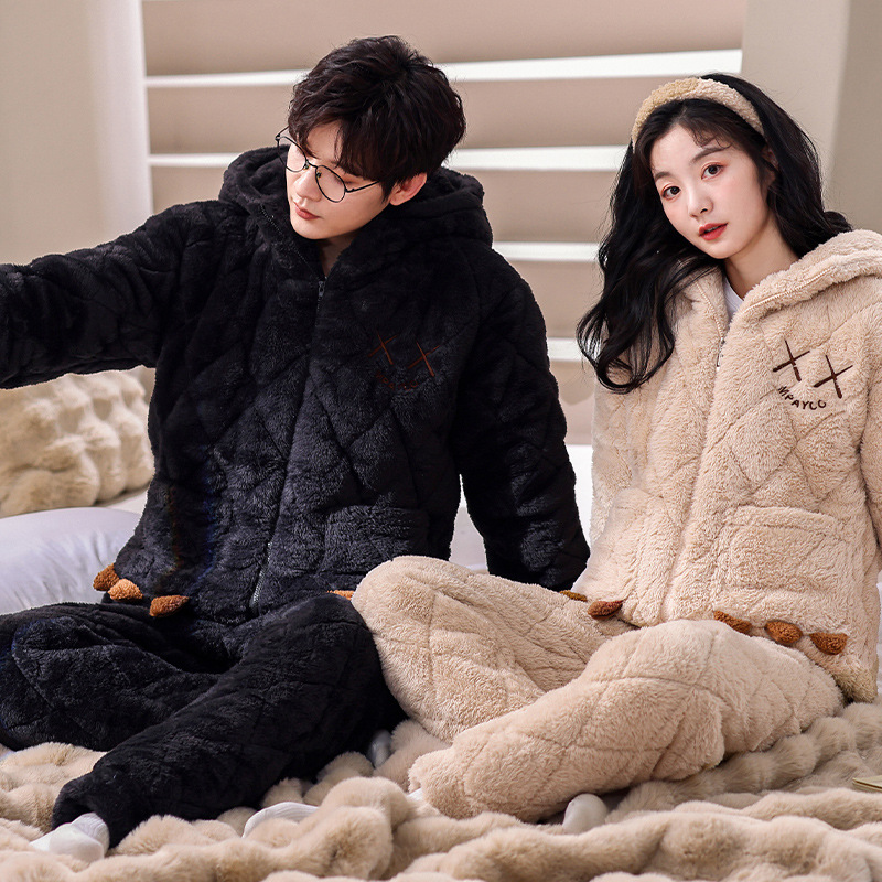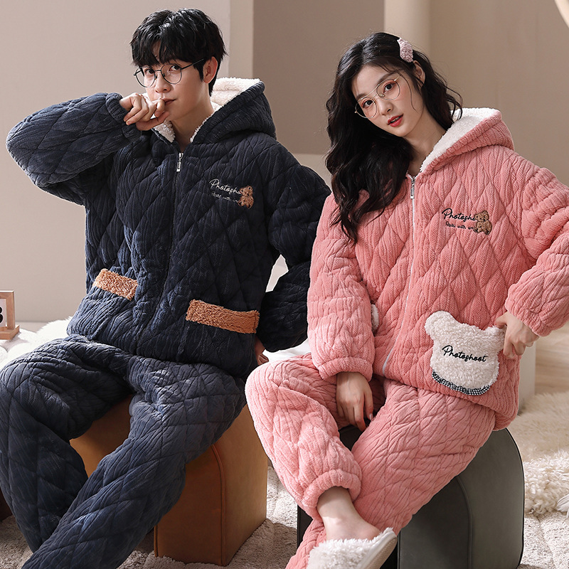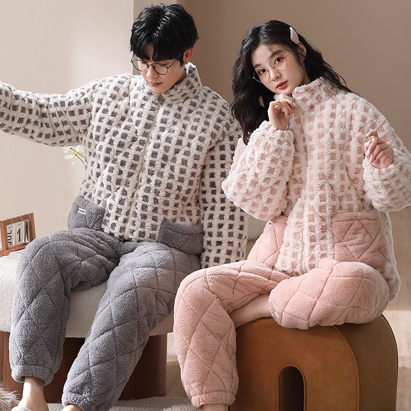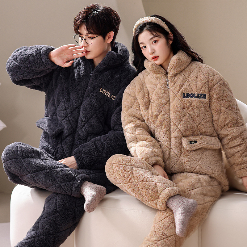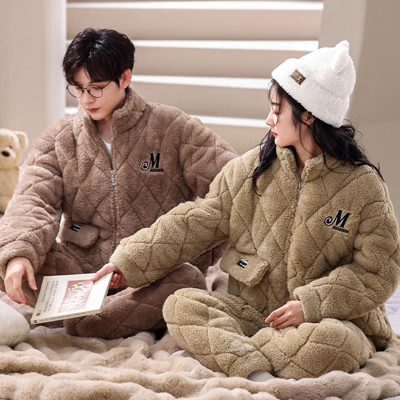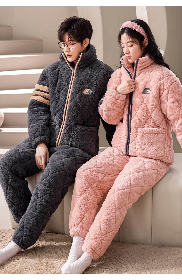 겨울 산호 양털 퀼트 커플 파자마 여성 지퍼 카디건 3 층 두꺼운 코튼 패딩 자켓 남성복스토어 가기