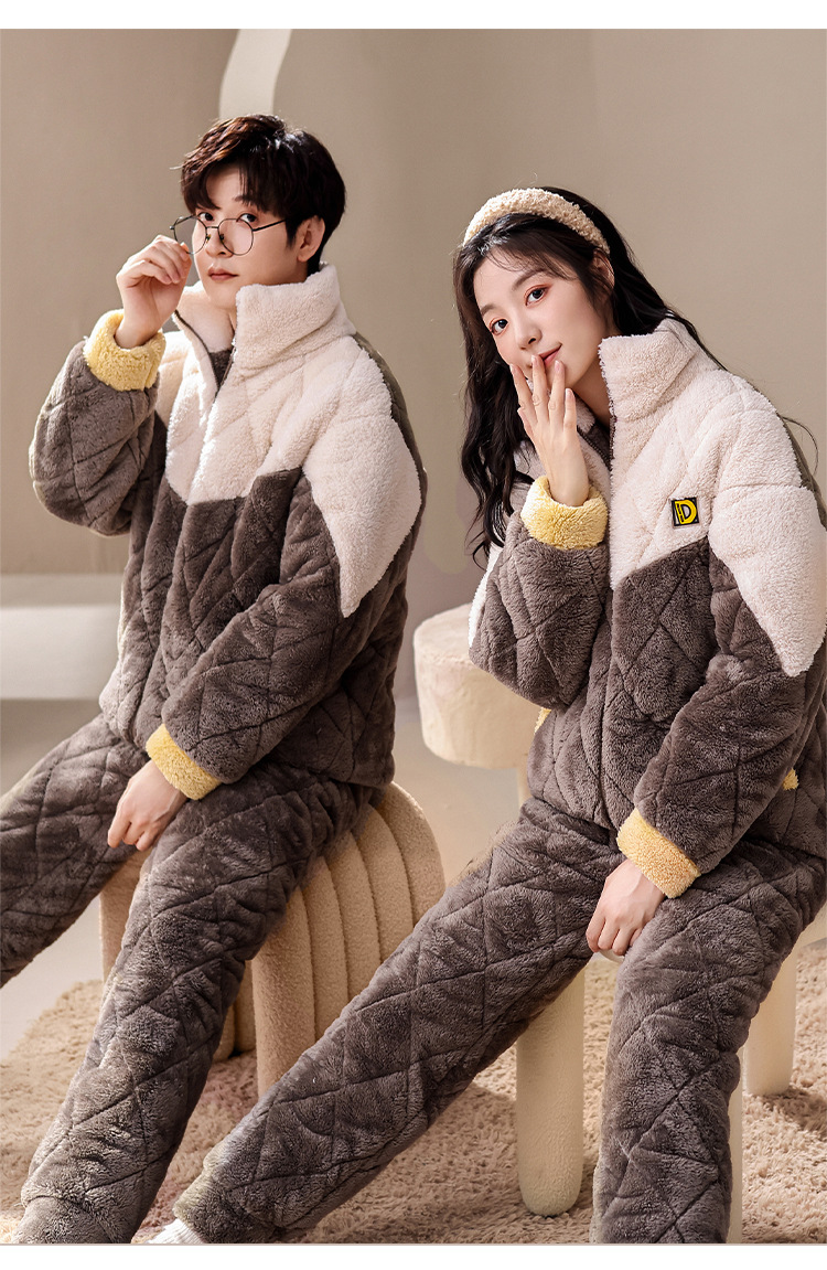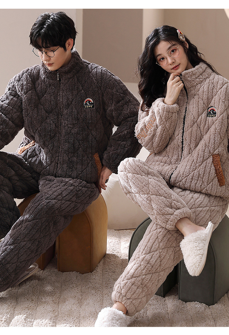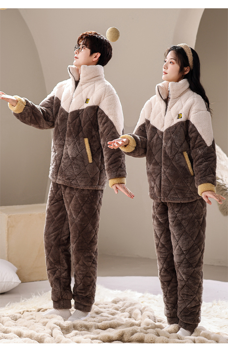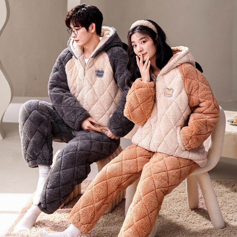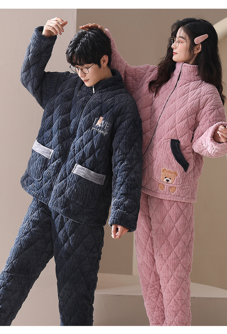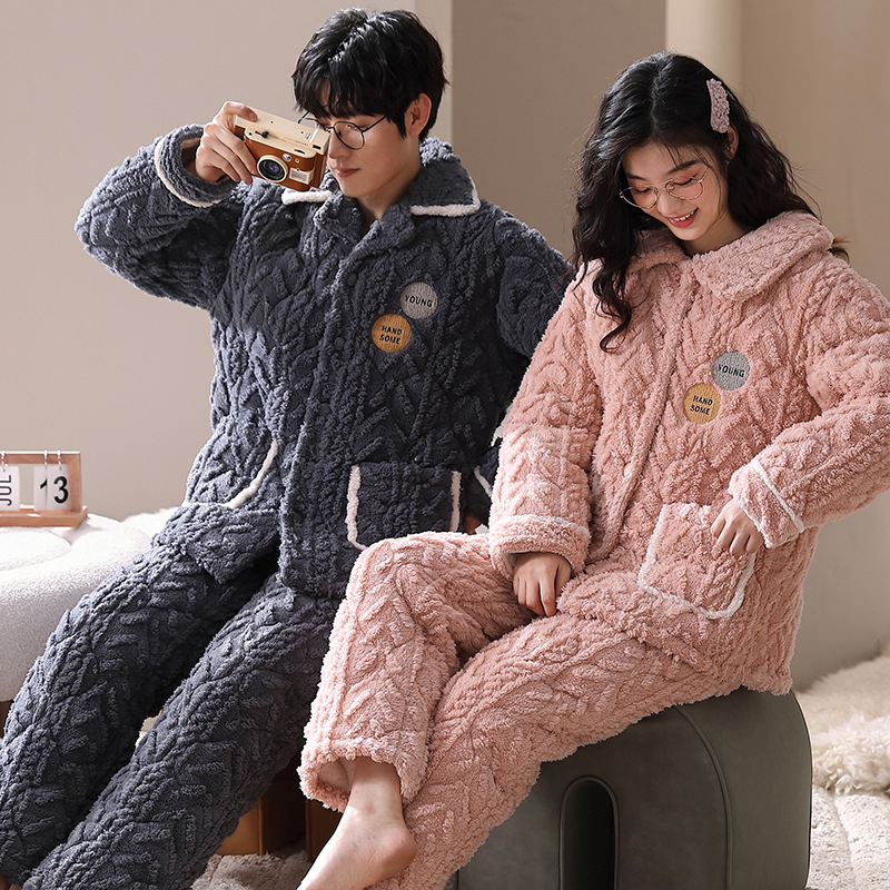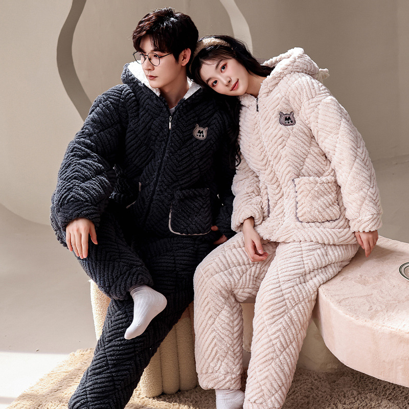 겨울 산호 양털 퀼트 커플 파자마 여성 지퍼 카디건 3 층 두꺼운 코튼 패딩 자켓 남성복스토어 가기