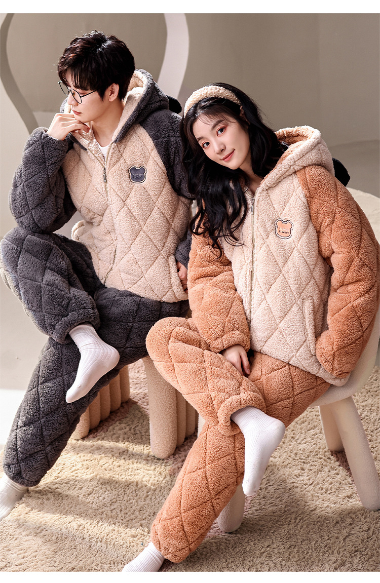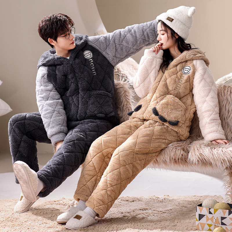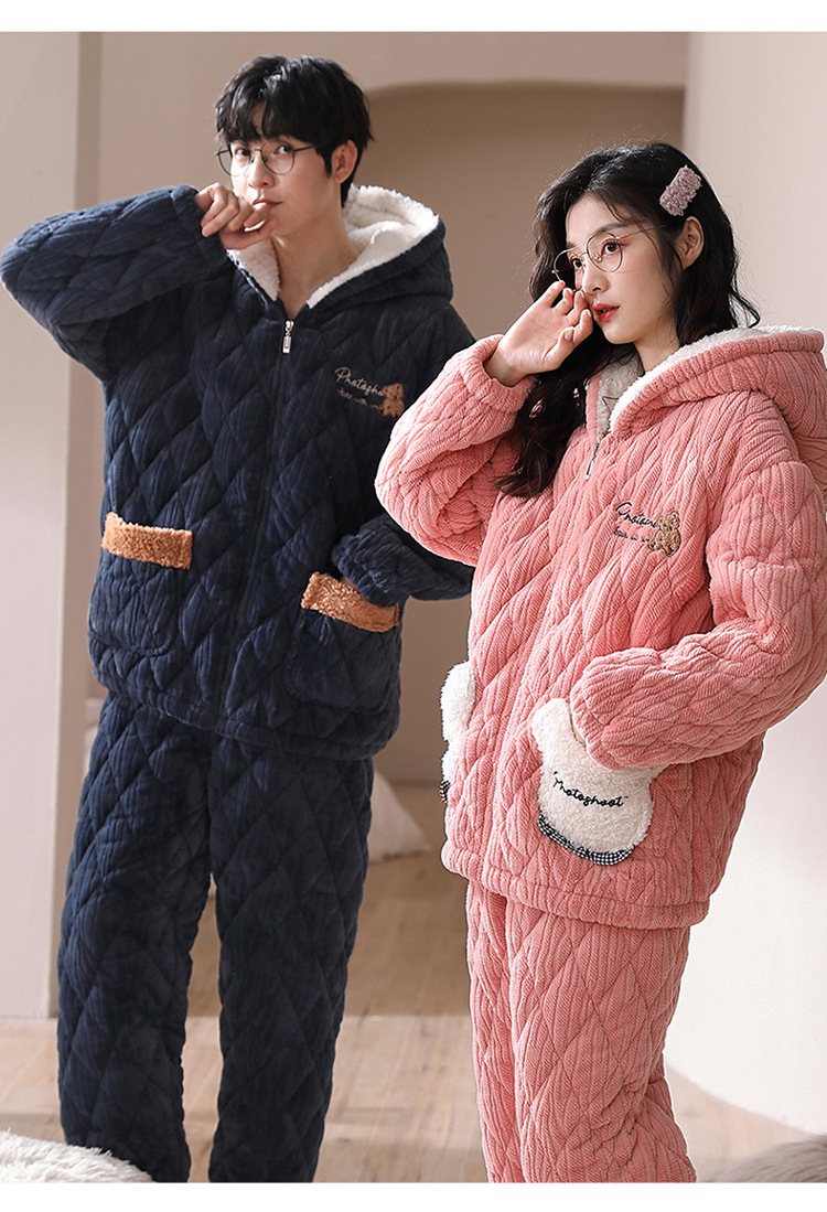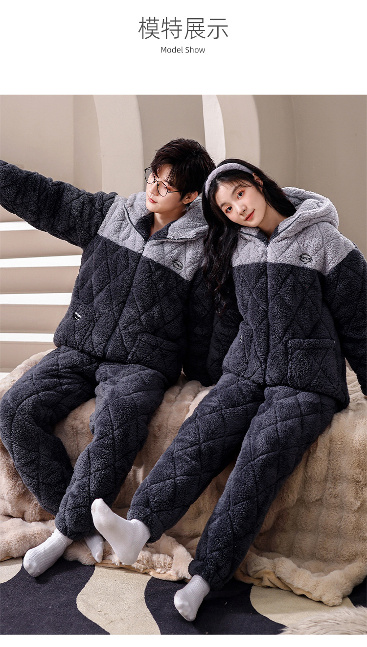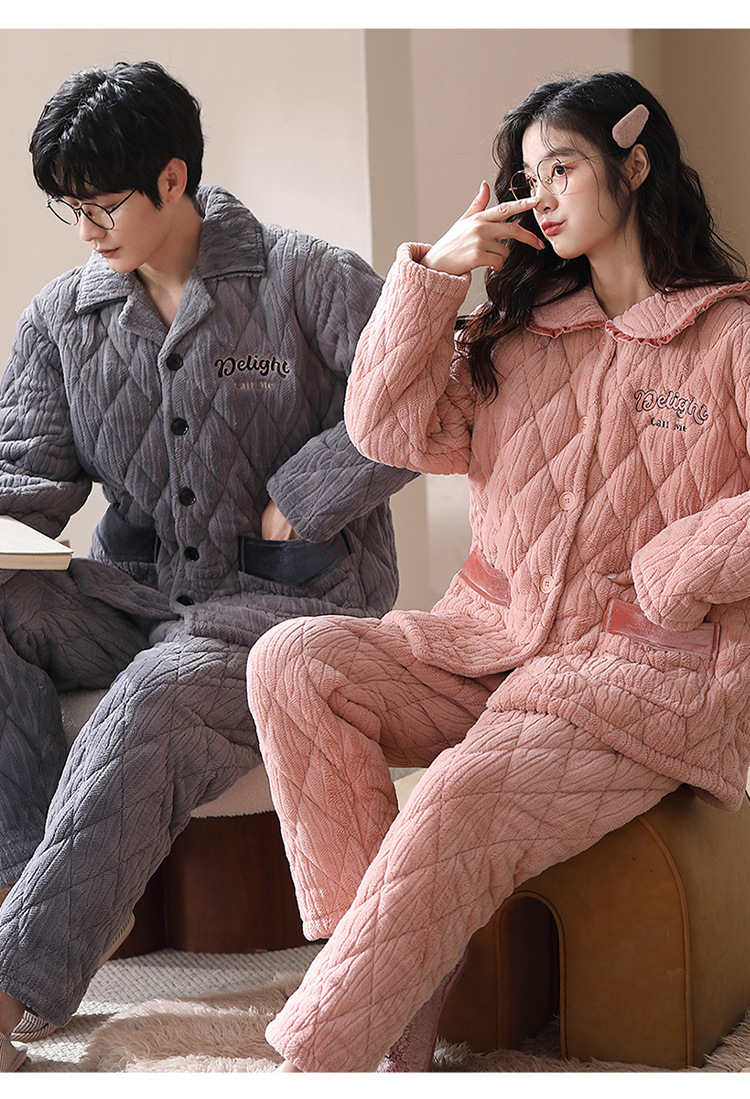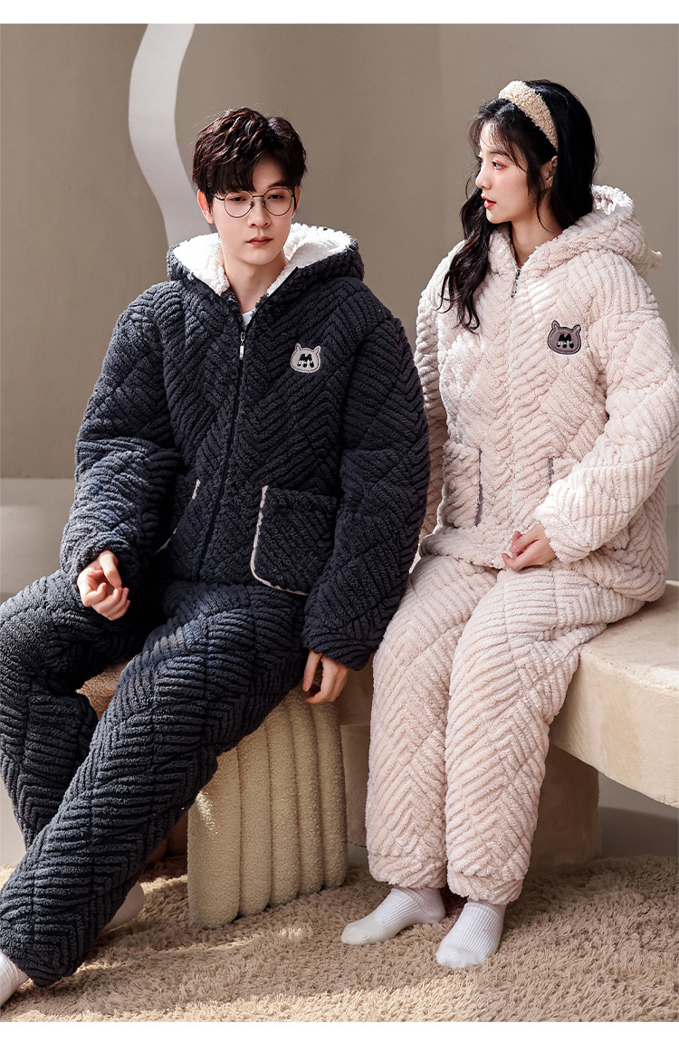 겨울 산호 양털 퀼트 커플 파자마 여성 지퍼 카디건 3 층 두꺼운 코튼 패딩 자켓 남성복스토어 가기