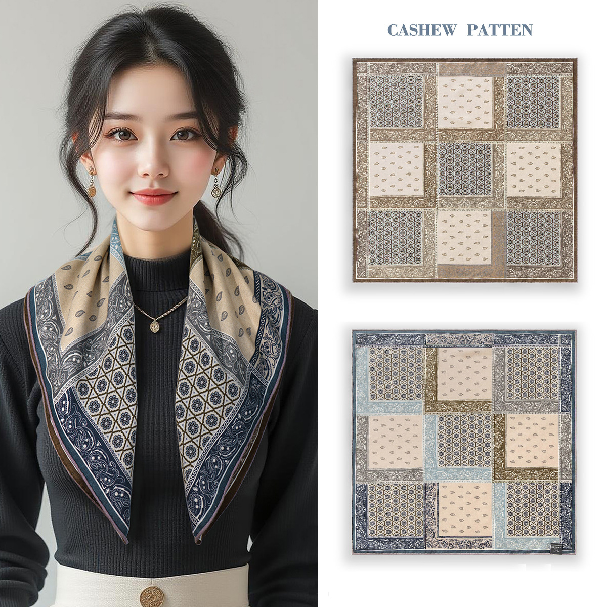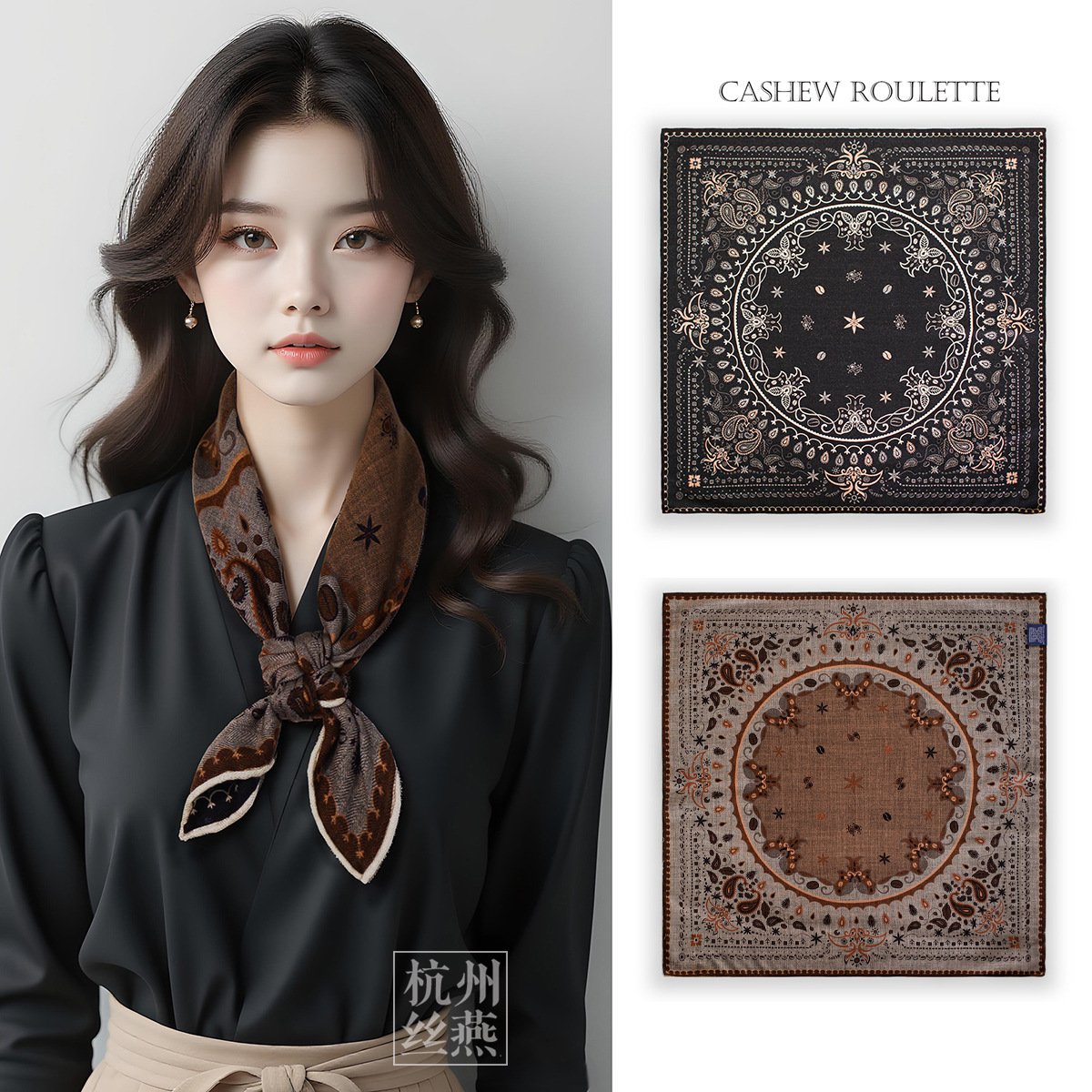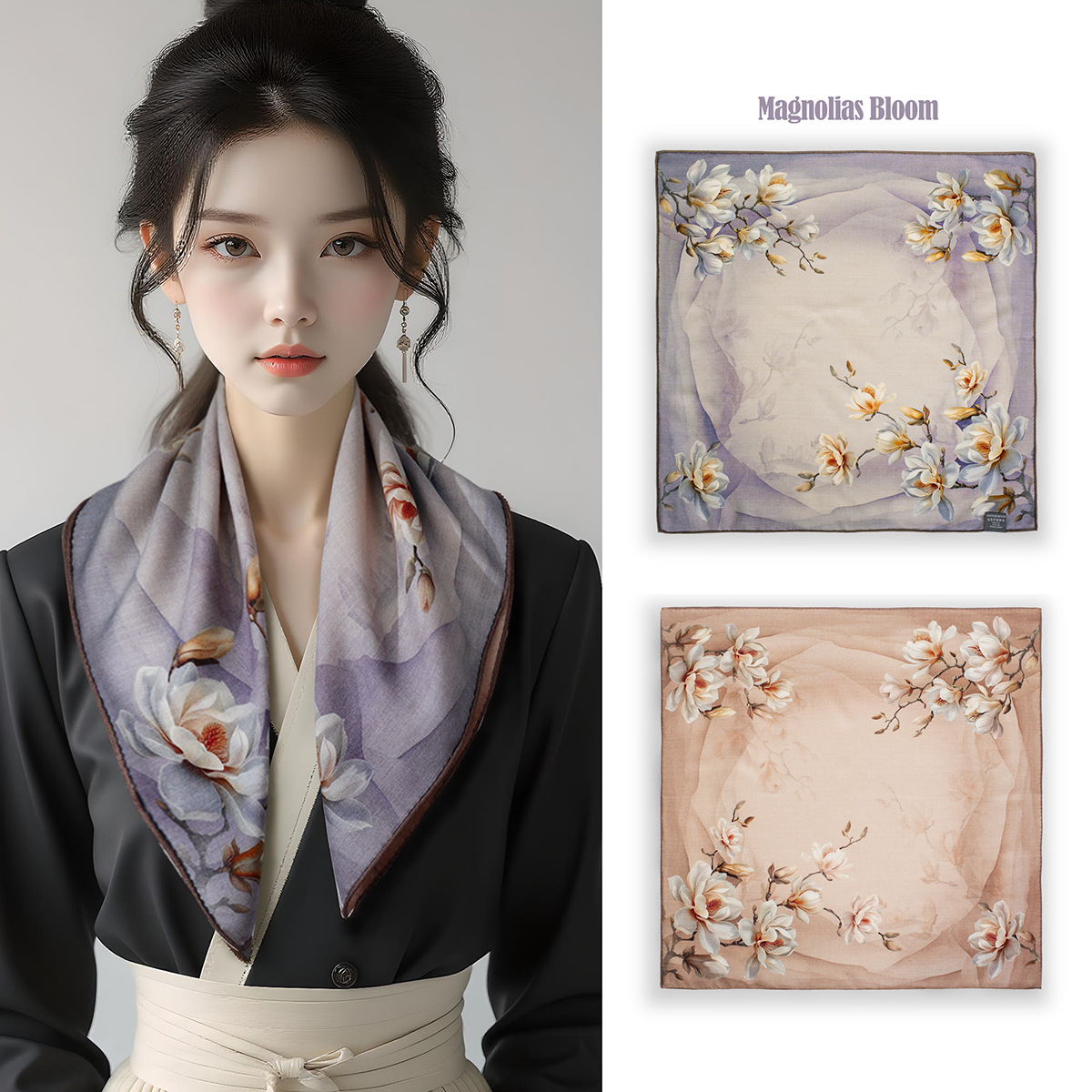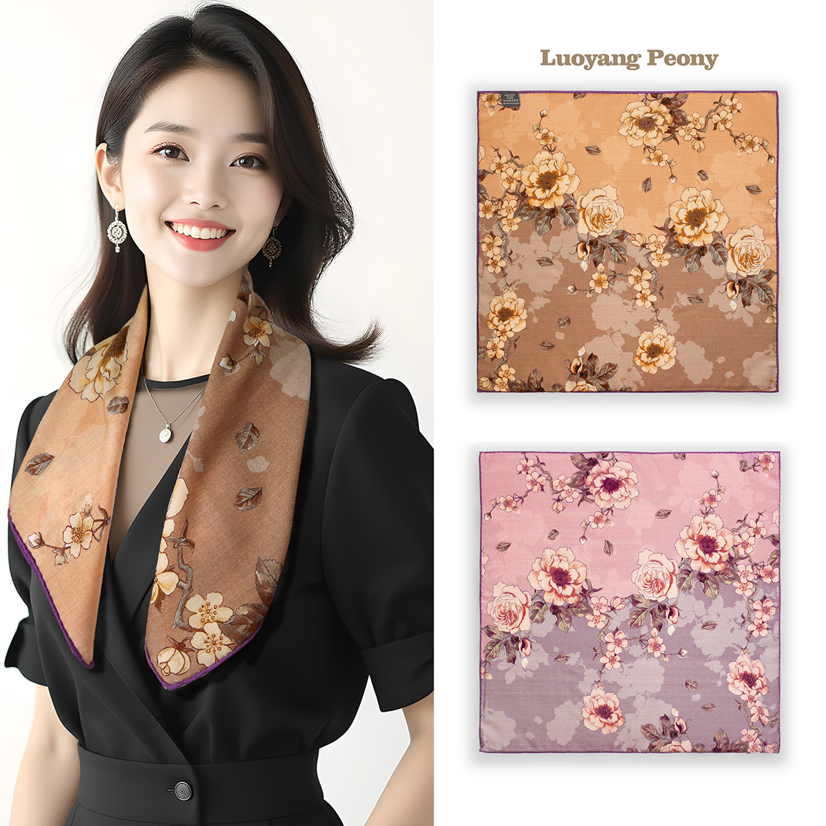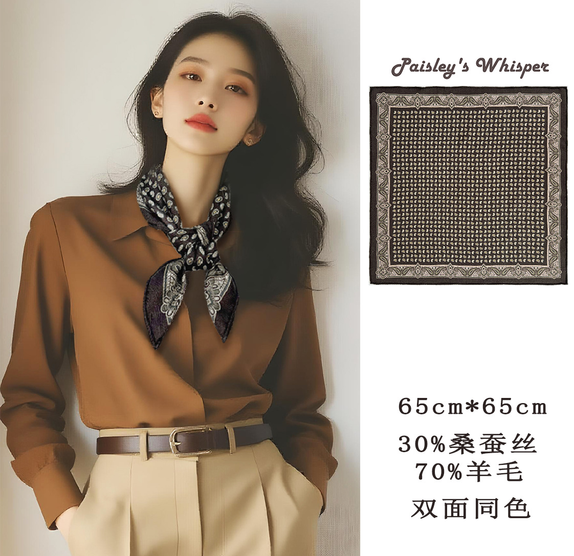 25가지 새로운 스타일의 패셔너블한 실크 스카프, 양면 이색 실크와 울 소재, 수제 롤 엣지 중국식 스카프 컬렉션