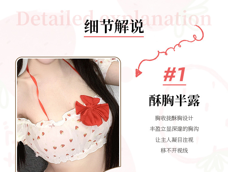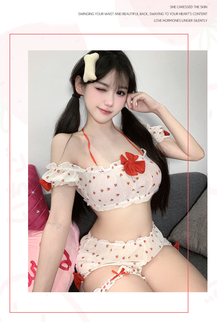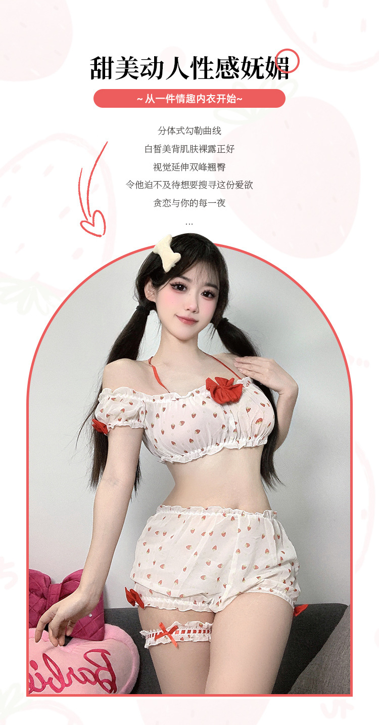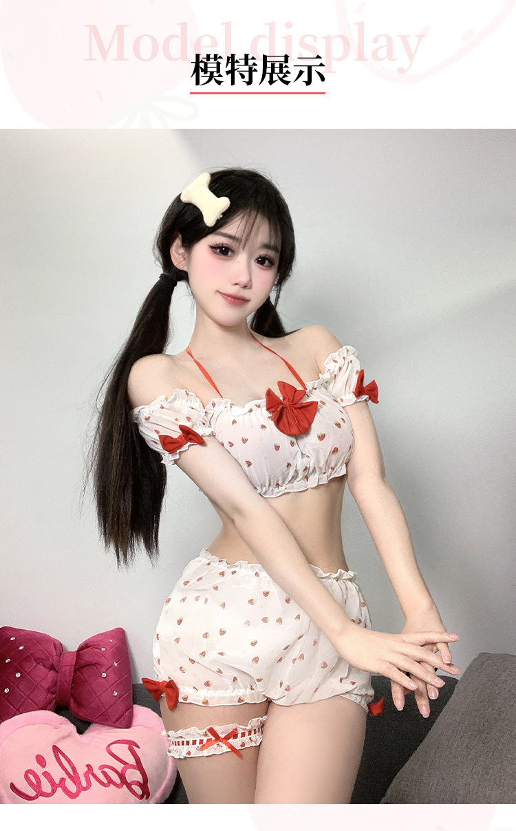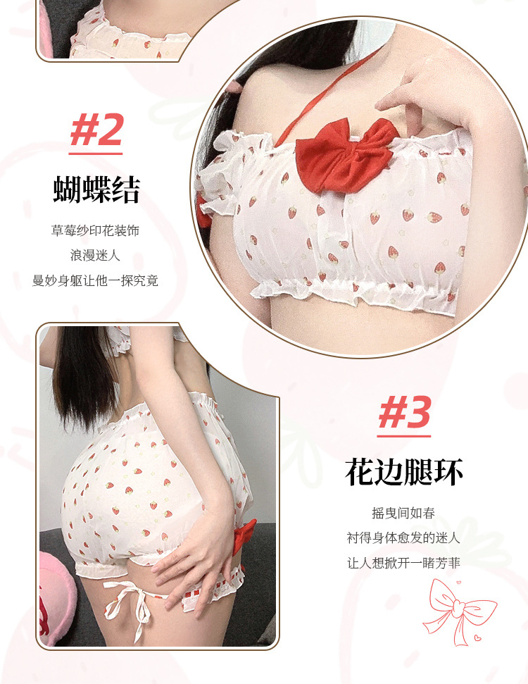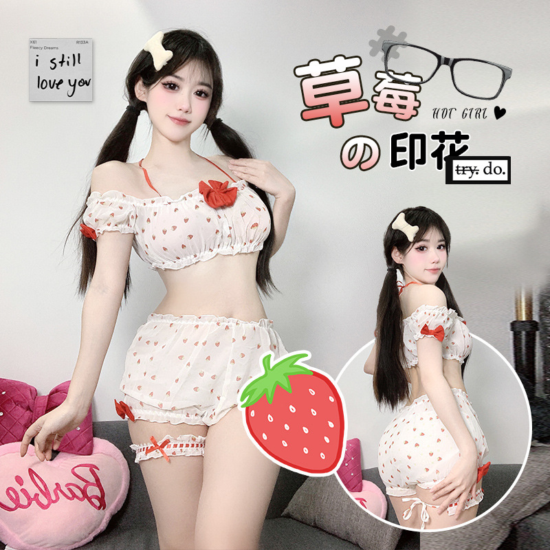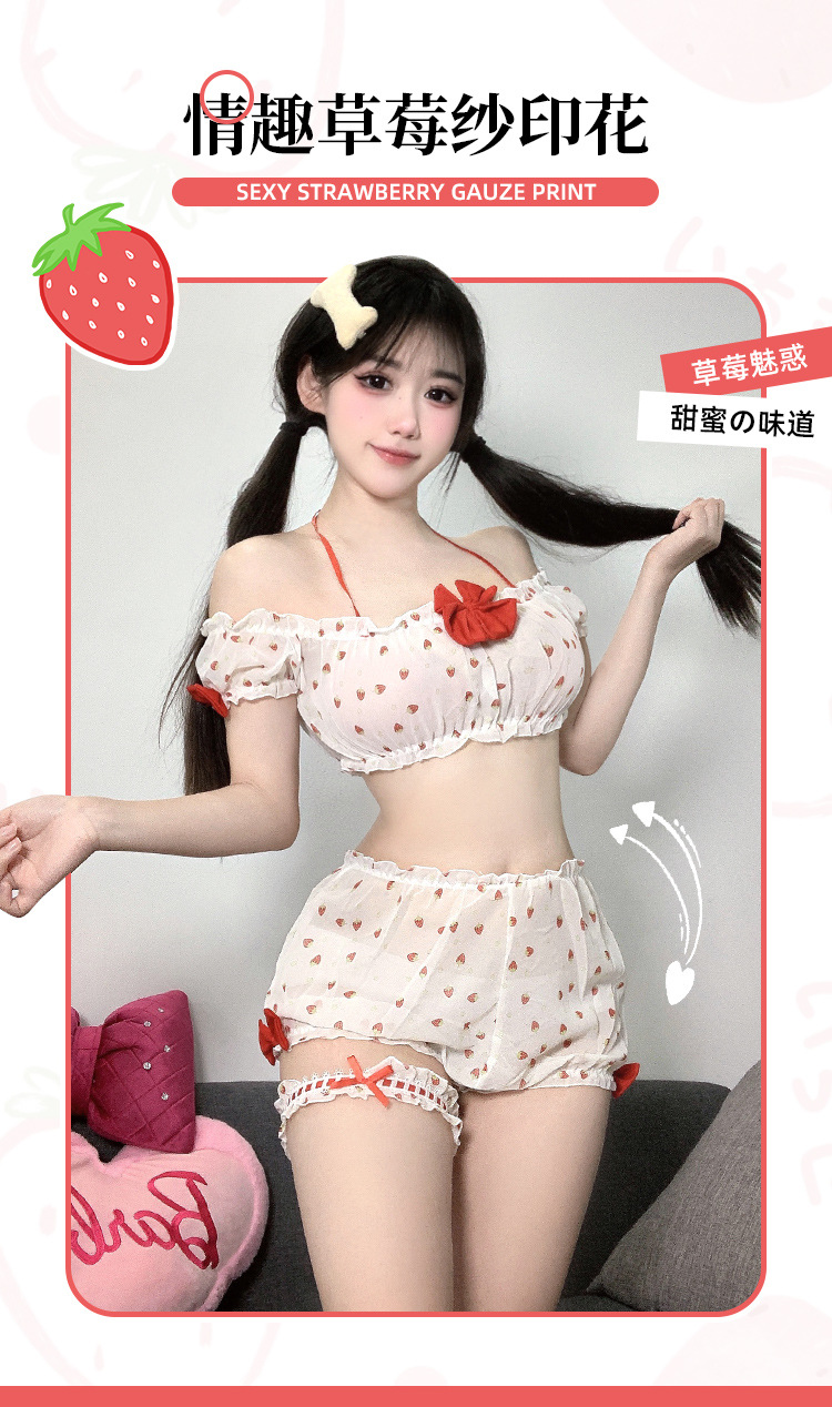 부드러운 소녀 달콤한 딸기 인쇄 소녀의 여름 일본 귀여운 섹시한 분할 짧은 치마 슬링 파자마 세트스토어 가기