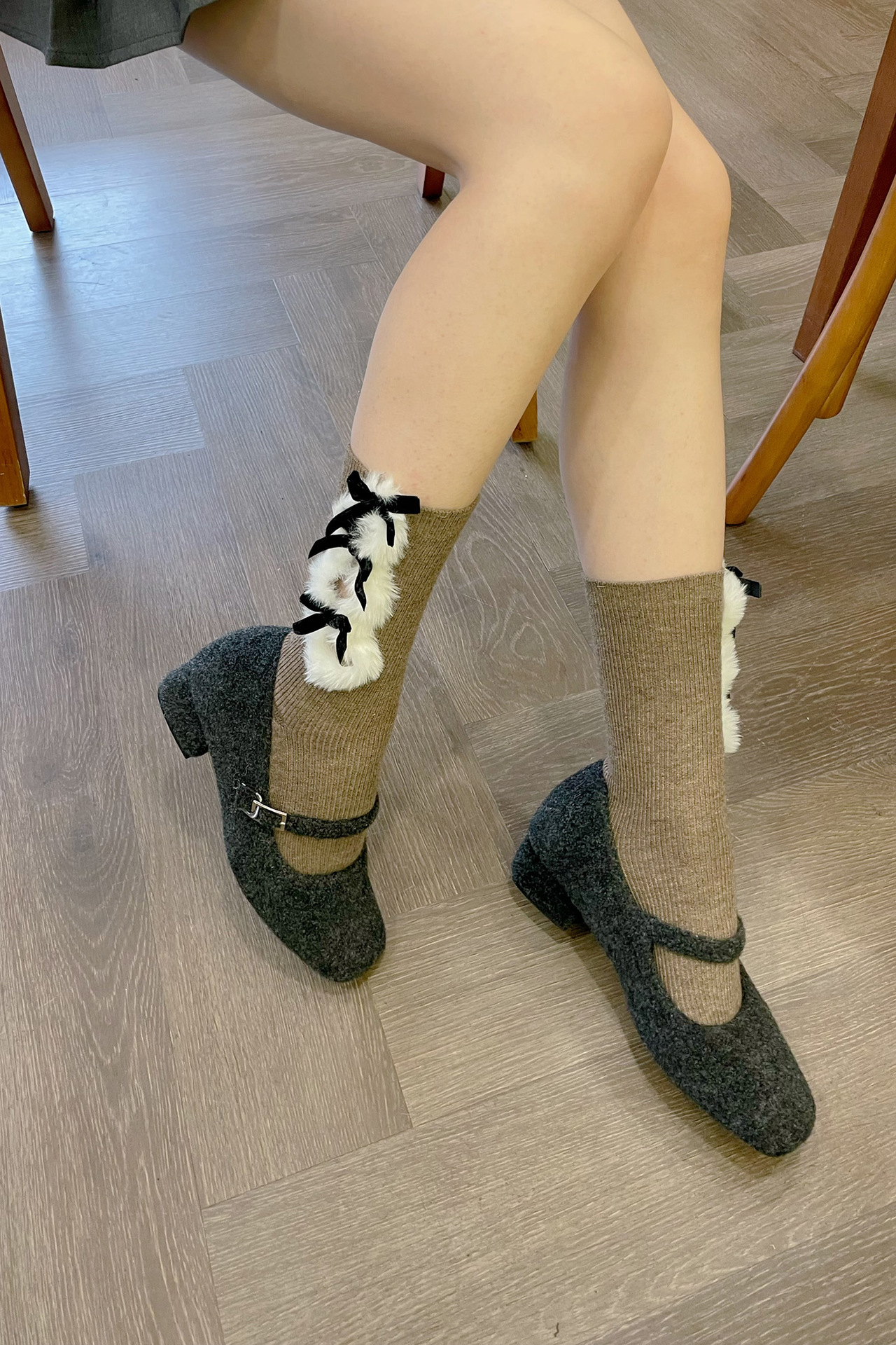 가을과 겨울 신제품 측면 오픈 거친 가장자리 여러 무리 활 따뜻한 양모 양말 달콤한 소녀 중간 튜브 쌓인 양말스토어 가기