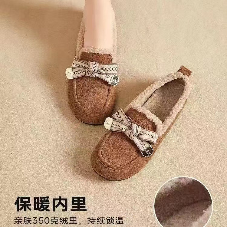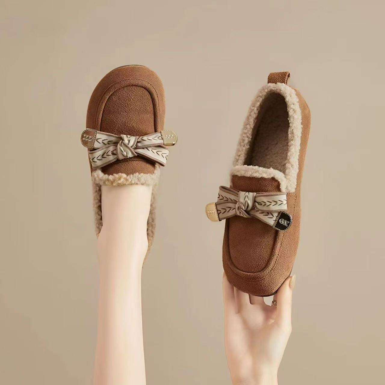 샤넬 스타일 활 기모 콩 신발 여성의 2024 새로운 낮은 발 뒤꿈치 편안한 코튼 슈즈 어머니를위한 미끄럼 방지 슬립 온 슈즈