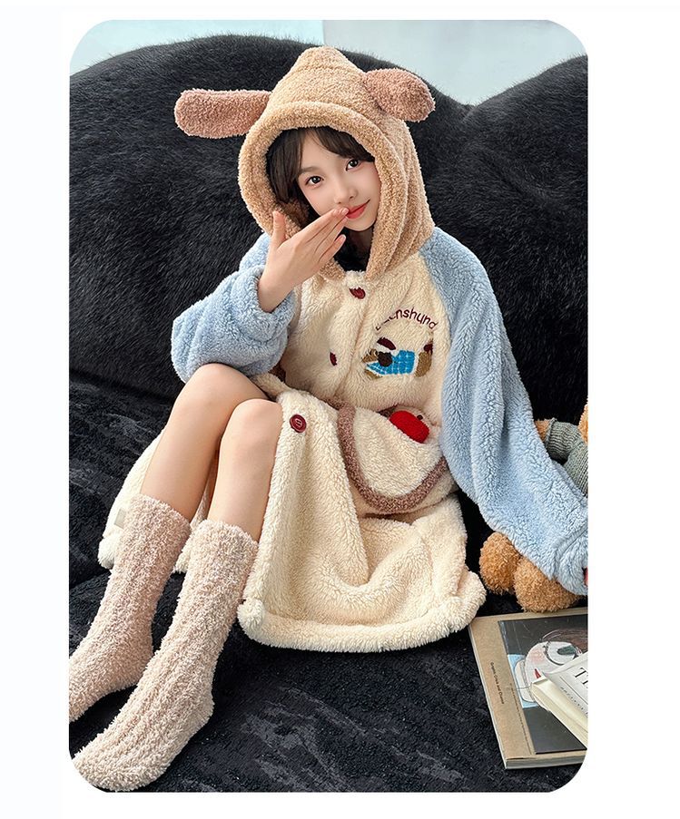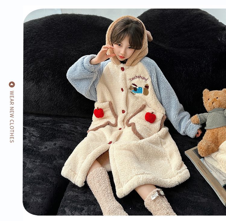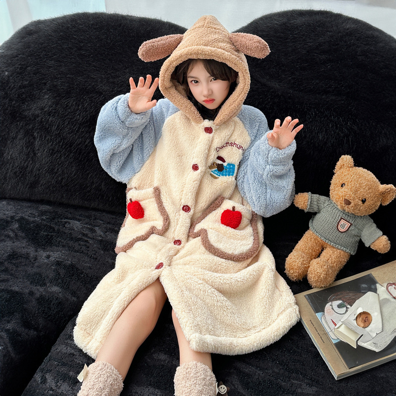 소녀 잠옷 가을과 겨울 후드 산호 양털 나이트 가운 두꺼운 따뜻한 집 옷 소녀 달콤한 잠옷 투피스 세트