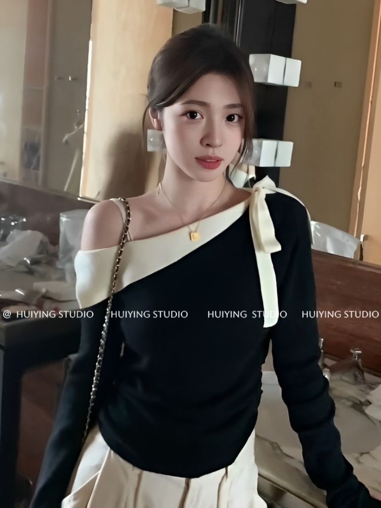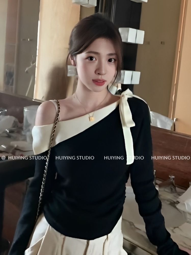 검은 경사 어깨 오픈 어깨 니트 최고 여성 하이 엔드 가을 새로운 내면베이스 셔츠 가을과 겨울 틈새 디자인 감각