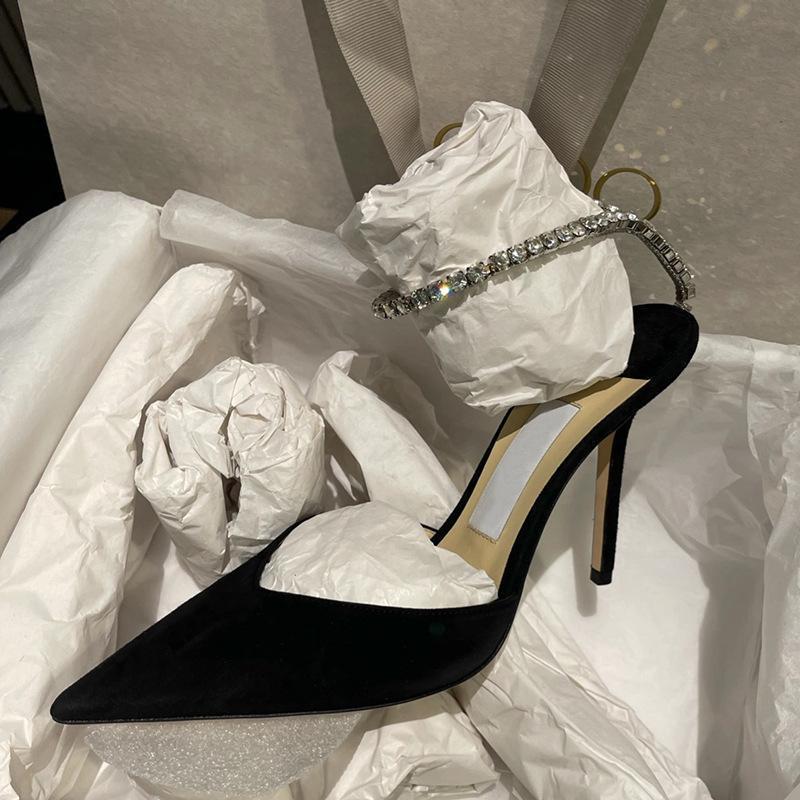 국경 간 하이힐 2023 새로운 재고 유럽과 미국의 스웨이드 뾰족한 여성 신발 샌들 블랙 라인 스톤 체인 힐