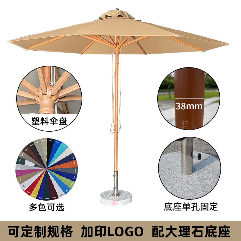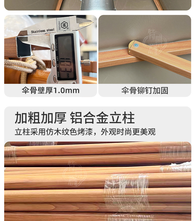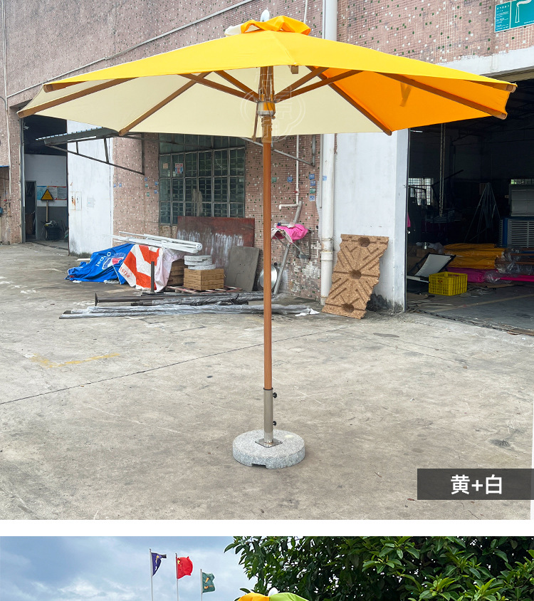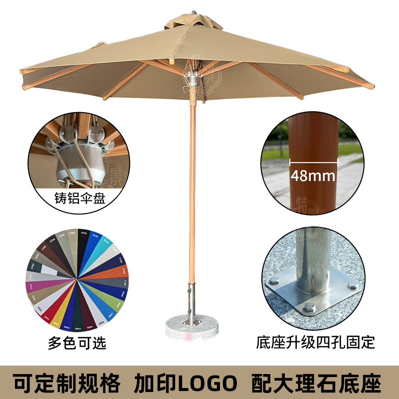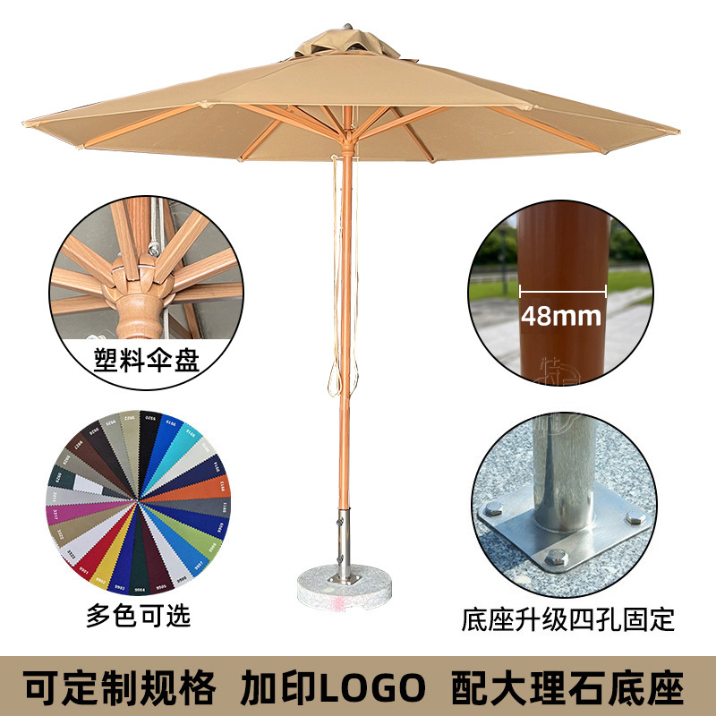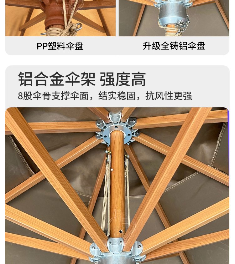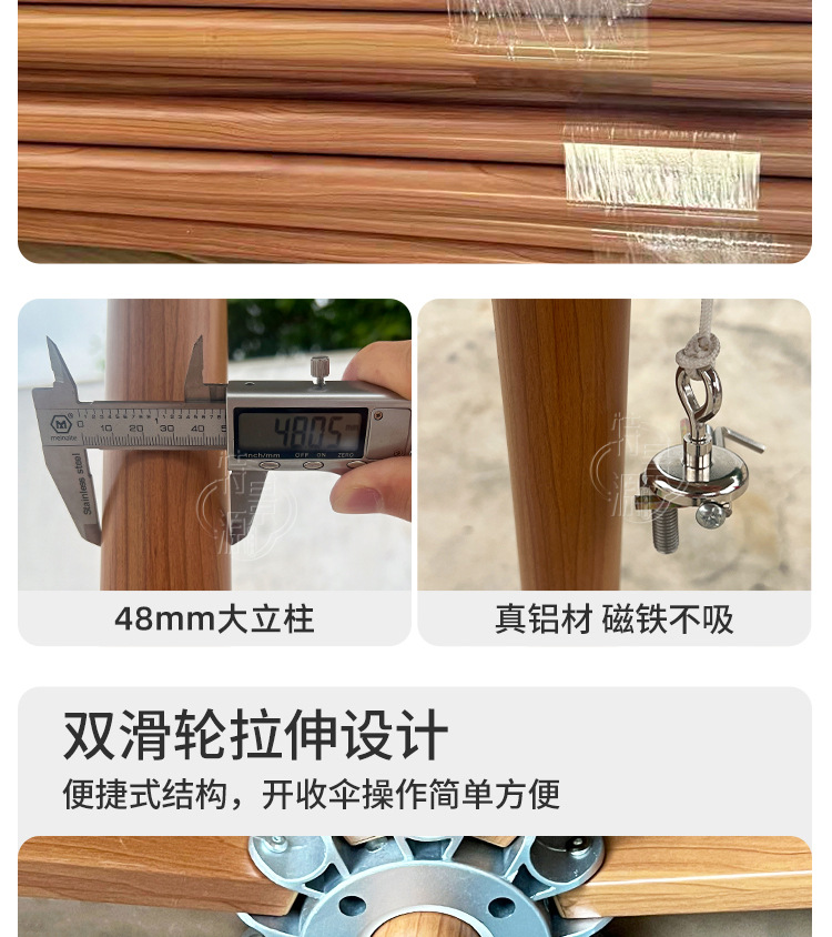 야외용 차양 알루미늄 합금 이중 휠 우드 그레인 중간 기둥 우산, 고급 상업 거리 커피숍용, 방풍 비치 우산스토어 가기