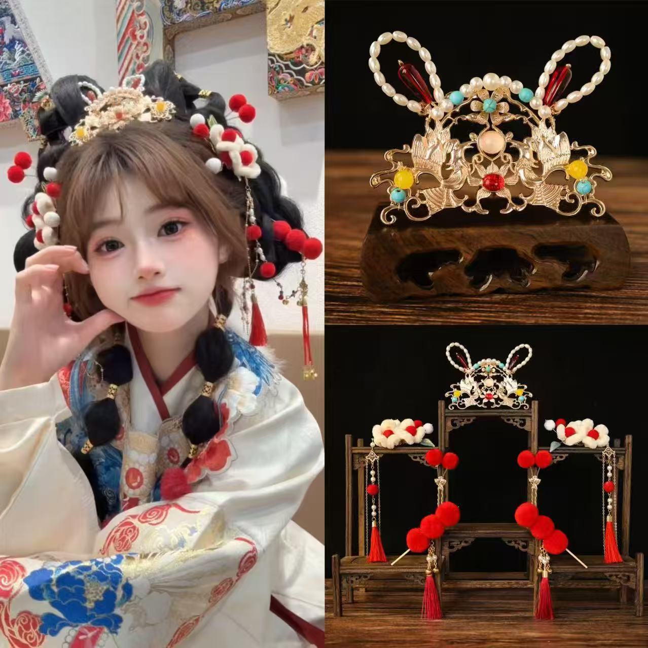 한푸 토끼 헤어 크라운 골동품 헤어 액세서리 헤어 볼 헤어 클립 레드 술 헤어 스타일 헤어핀 페어 클립 액세서리 국가 스타일 신년 세트