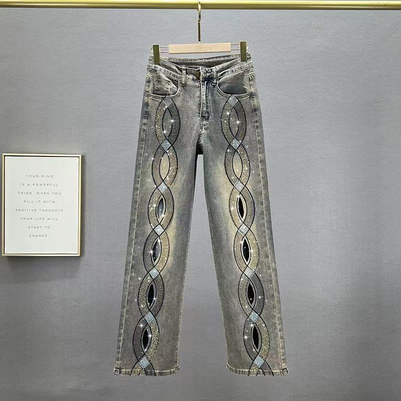 무거운 자수 뜨거운 시추 데님 빈 다리 바지 2024 새로운 겨울 높은 허리 느슨한 슬리밍 유럽 제품 바지스토어 가기