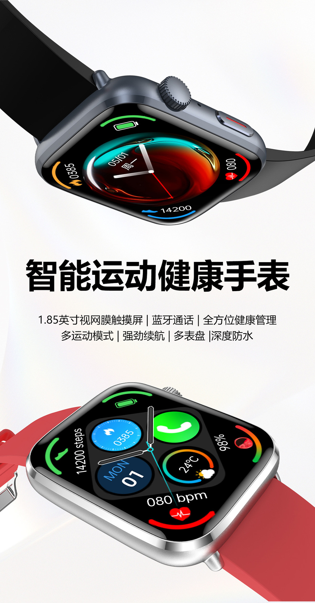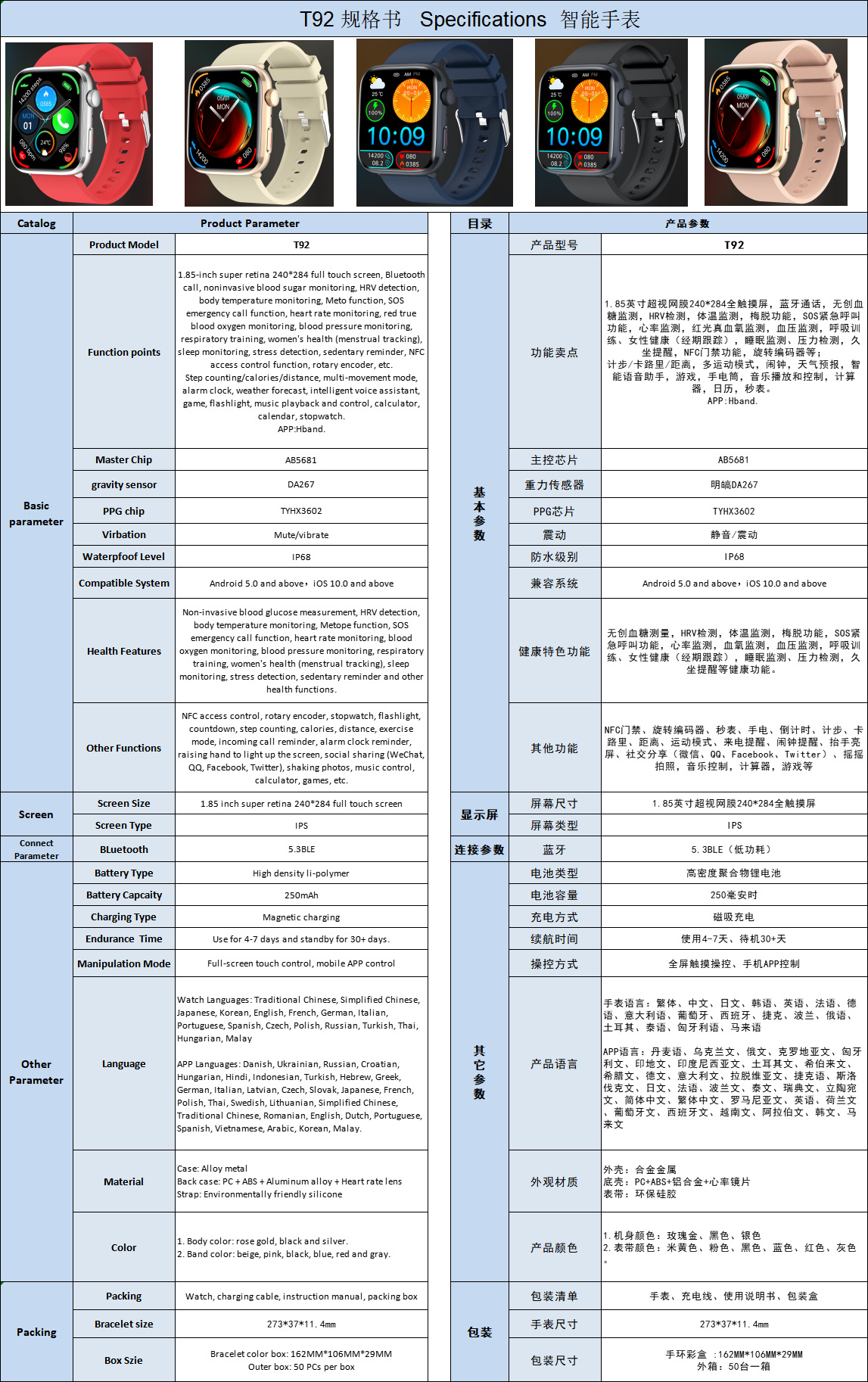 국경 간 새로운 T92 스마트 시계 블루투스 통화 심박수 혈액 산소 체온 건강 모니터링 스포츠 방수 HBand
