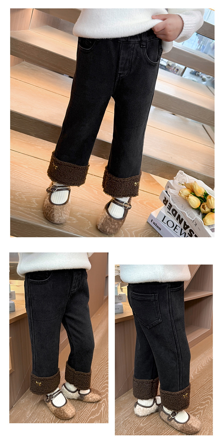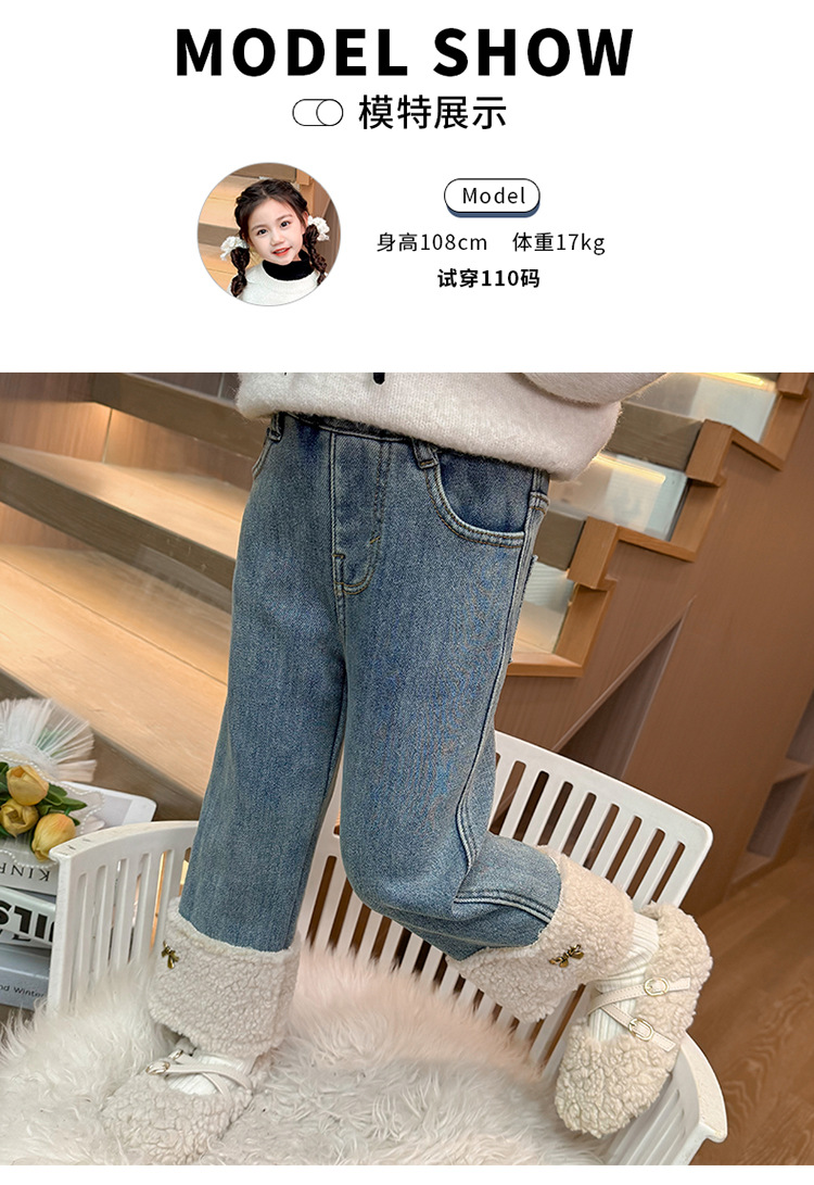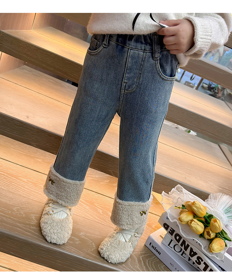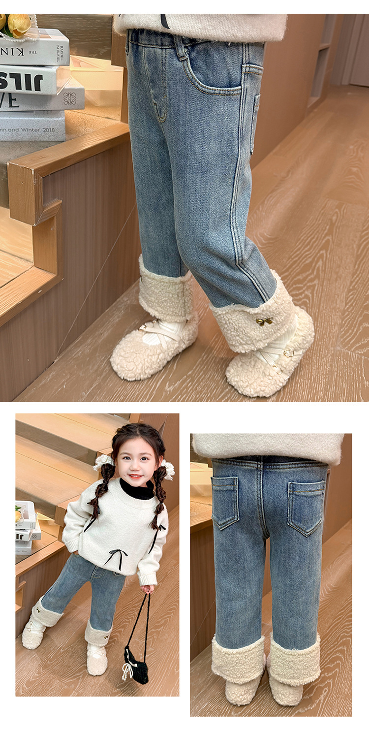 여아용 플리스 데님 팬츠 가을 겨울 2025 신상 아동 한국 스타일 겨울 스플라이스 두꺼운 일자 바지스토어 가기