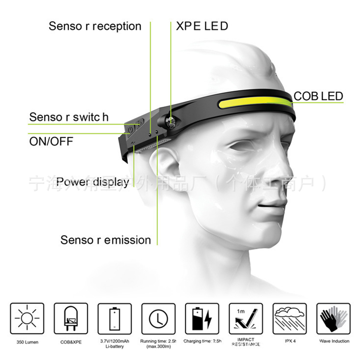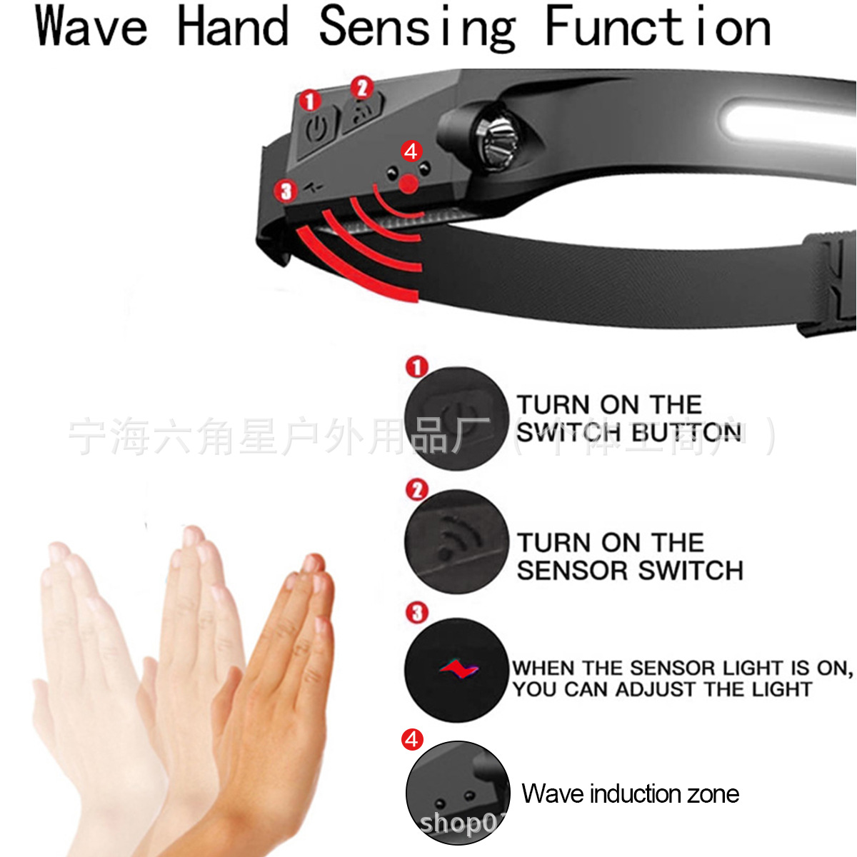 轻触开关:强光 -> 中光 -> 长按快闪,感应开关
