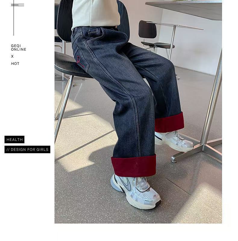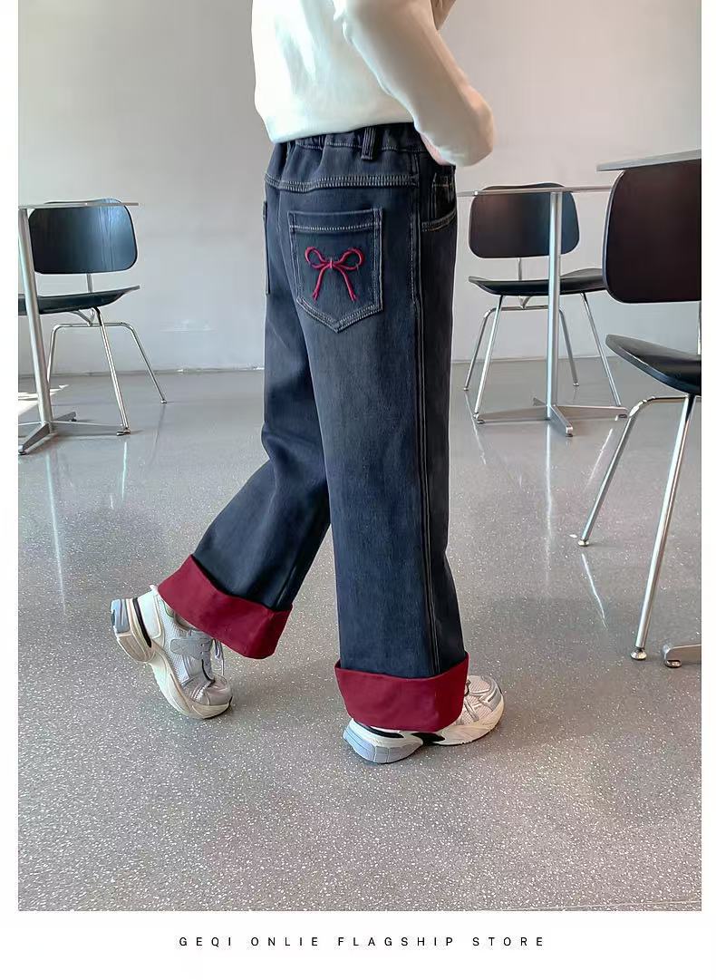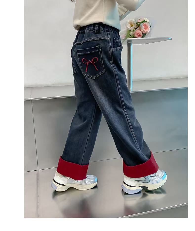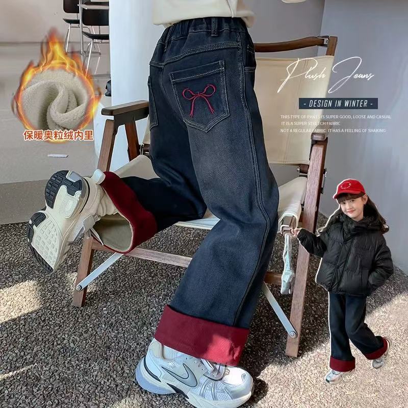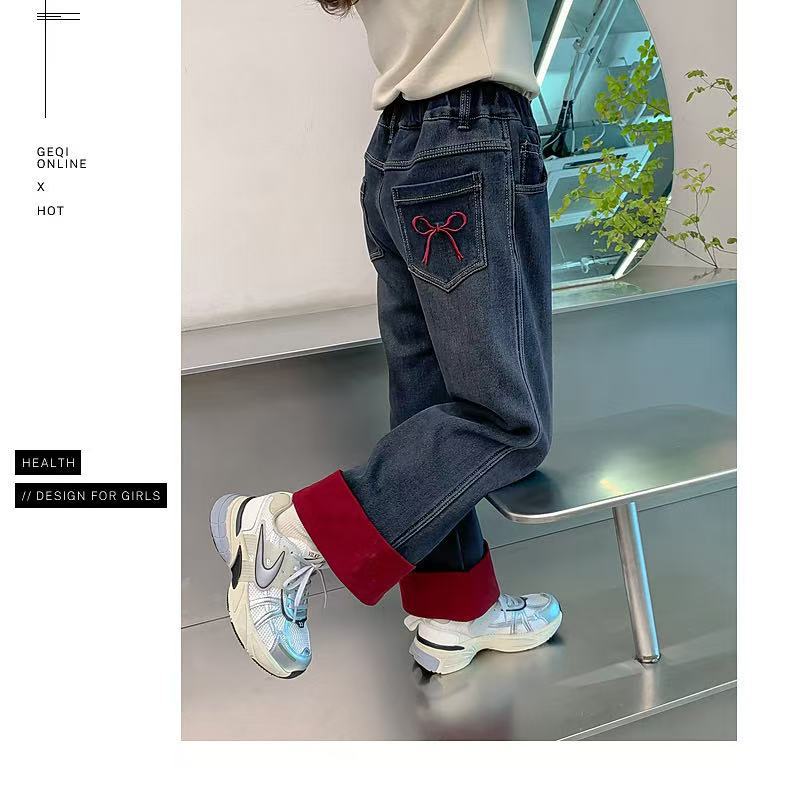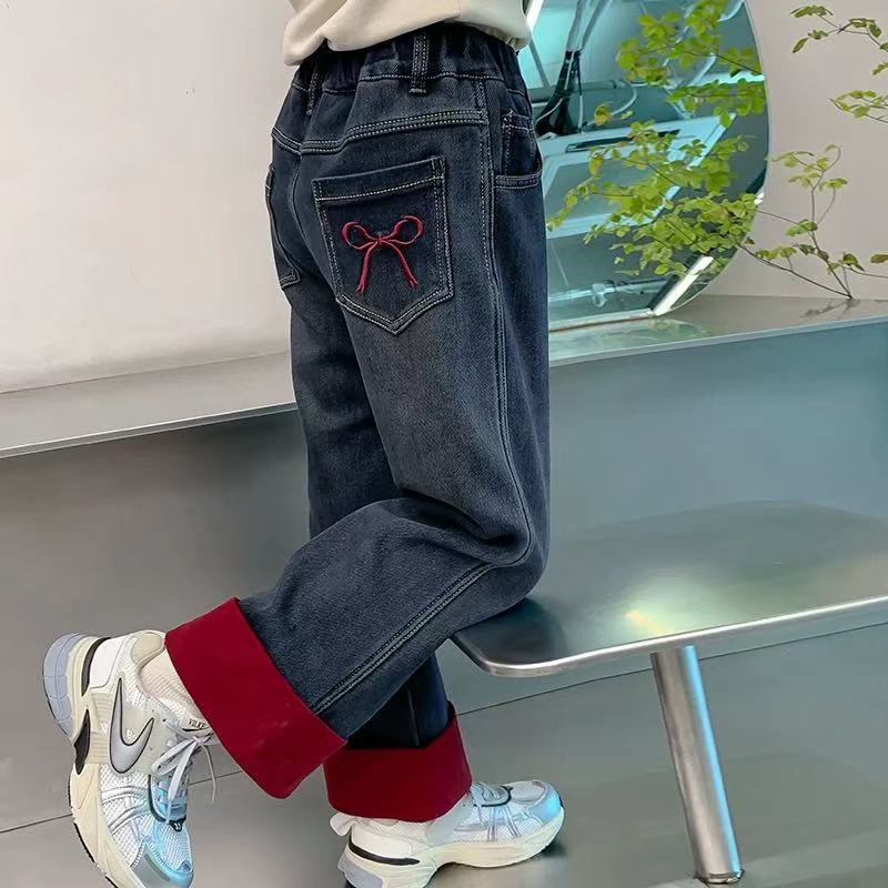 여자 겨울 착용 기모 바지 2024 새로운 어린이 가을 겨울 청바지 두꺼운 어린 소녀의 겨울 캐주얼 바지
