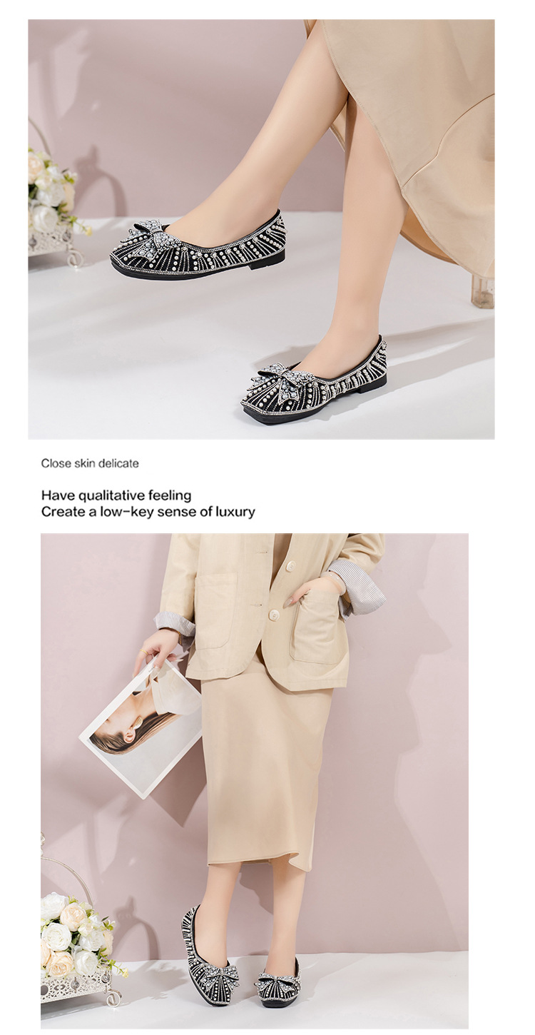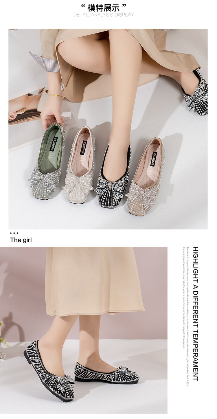 2024 봄과 여름 새로운 진주 풀 다이아몬드 로우 힐 스퀘어 발가락 신발 여성 한국 스타일 플랫 얕은 활 패션 여성 신발스토어 가기