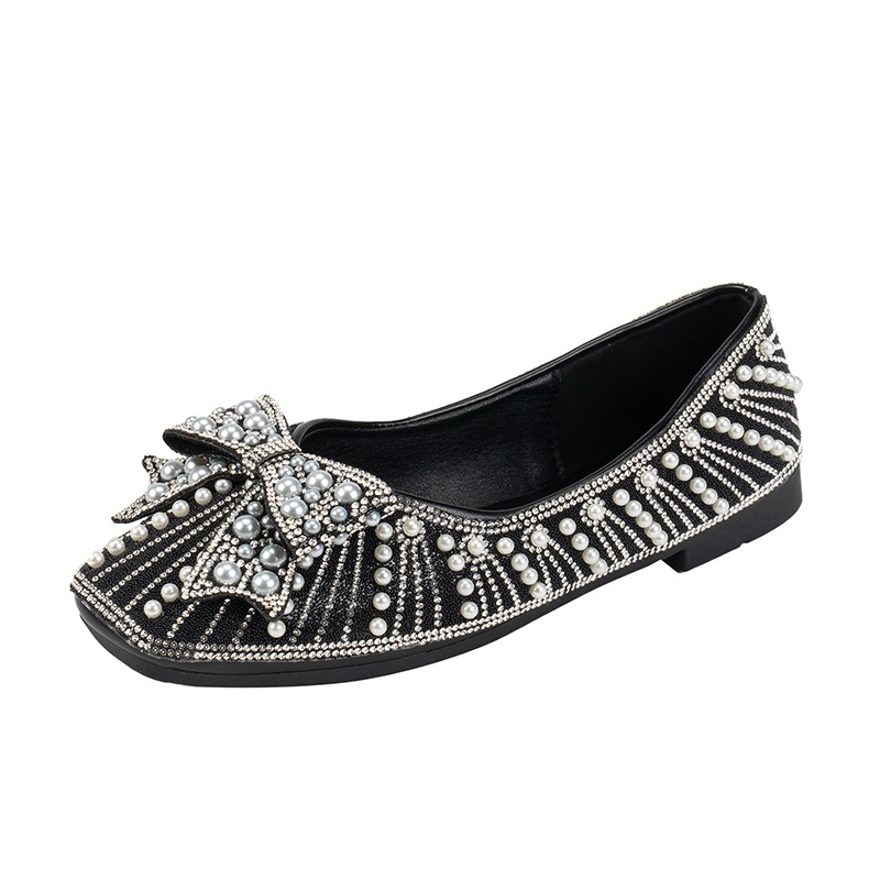 2024 봄과 여름 새로운 진주 풀 다이아몬드 로우 힐 스퀘어 발가락 신발 여성 한국 스타일 플랫 얕은 활 패션 여성 신발