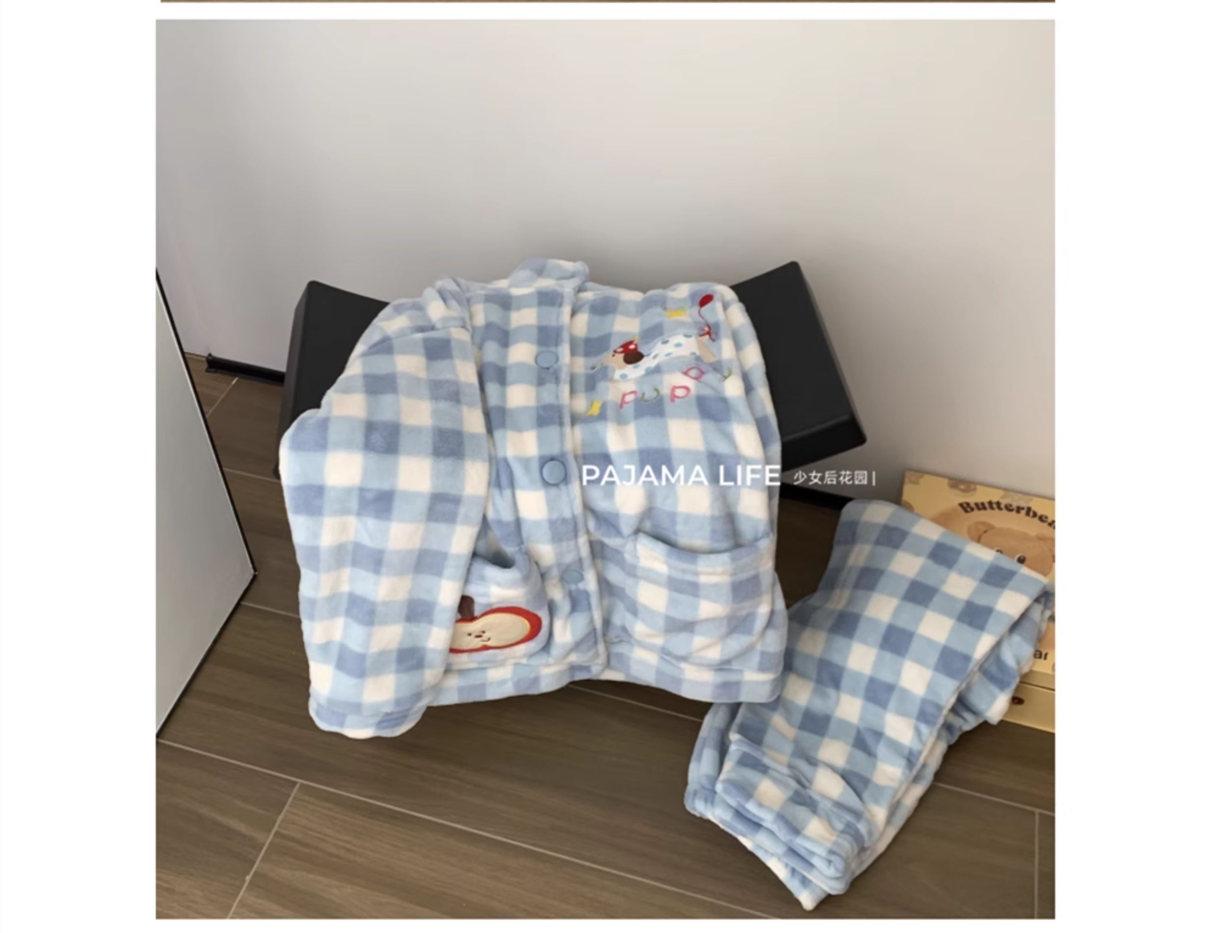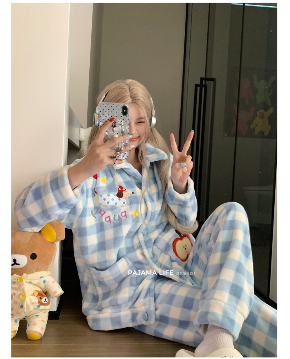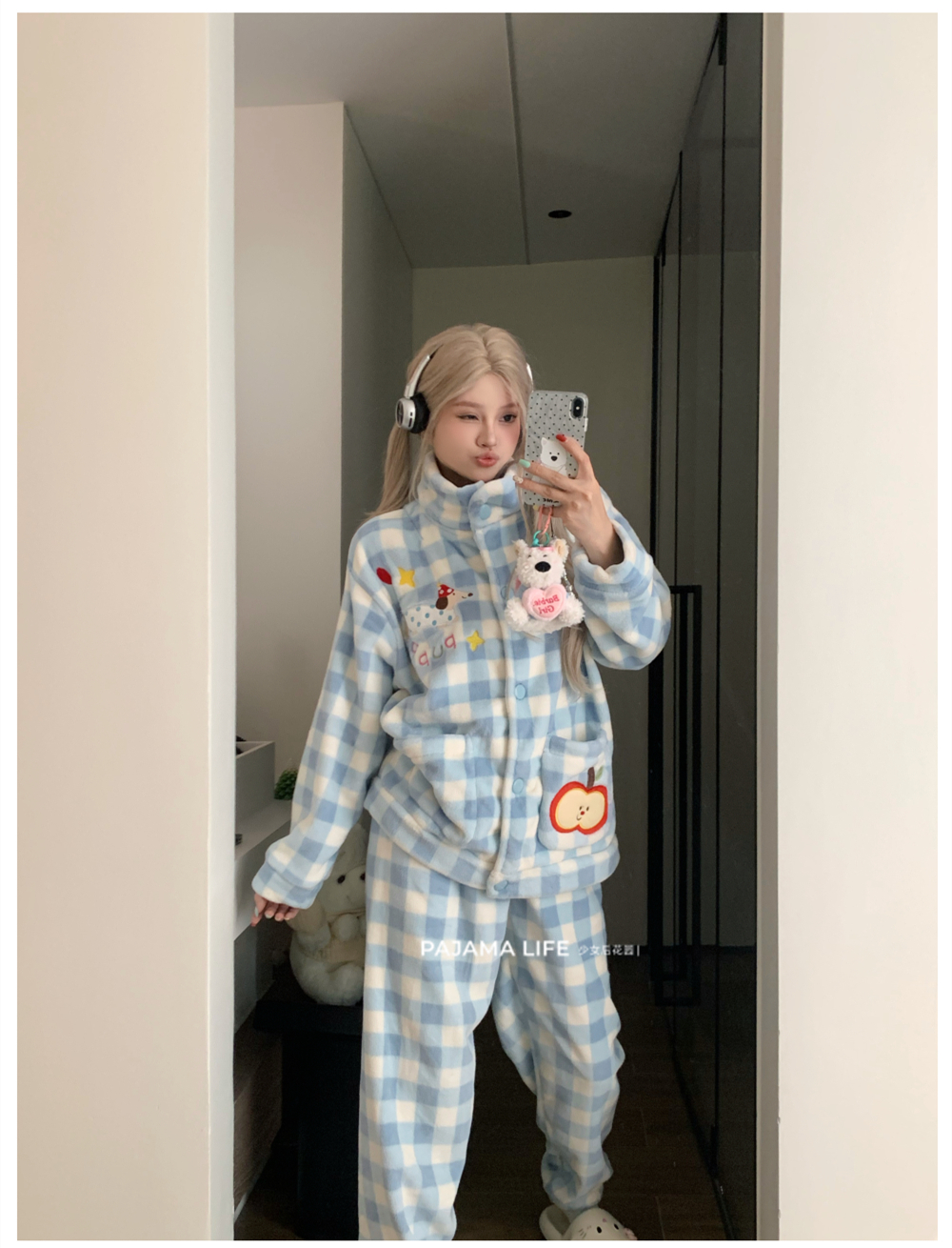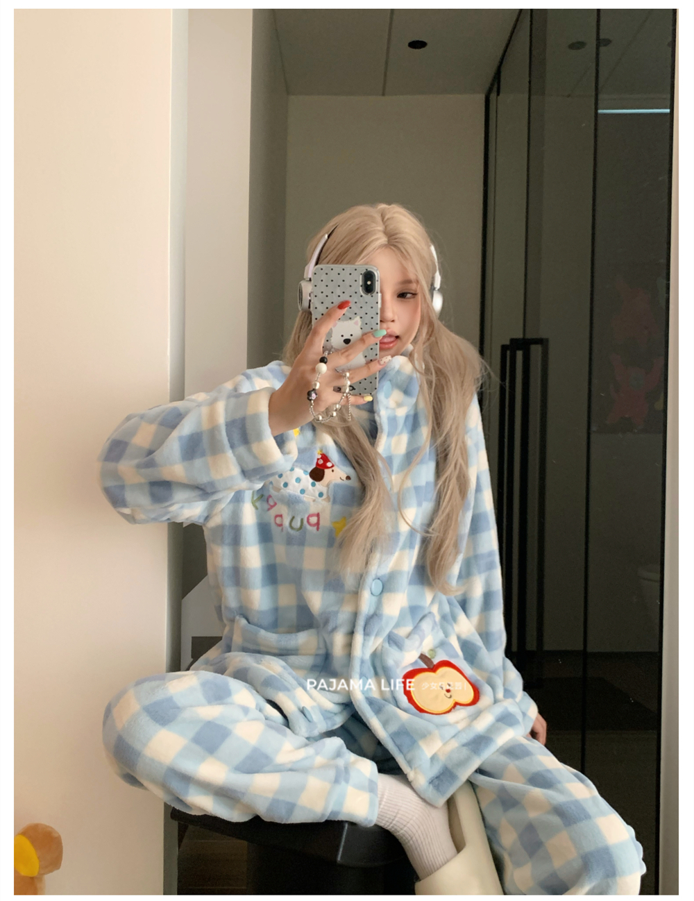 귀여운 사과 파이 강아지 산호 양털 잠옷 여성의 가을과 겨울 기모 따뜻한 높은 칼라 홈 옷 세트스토어 가기