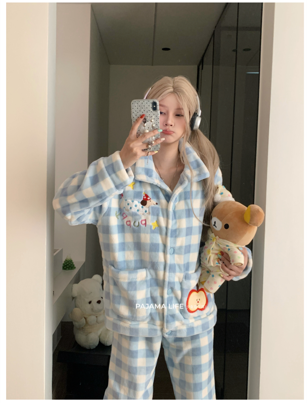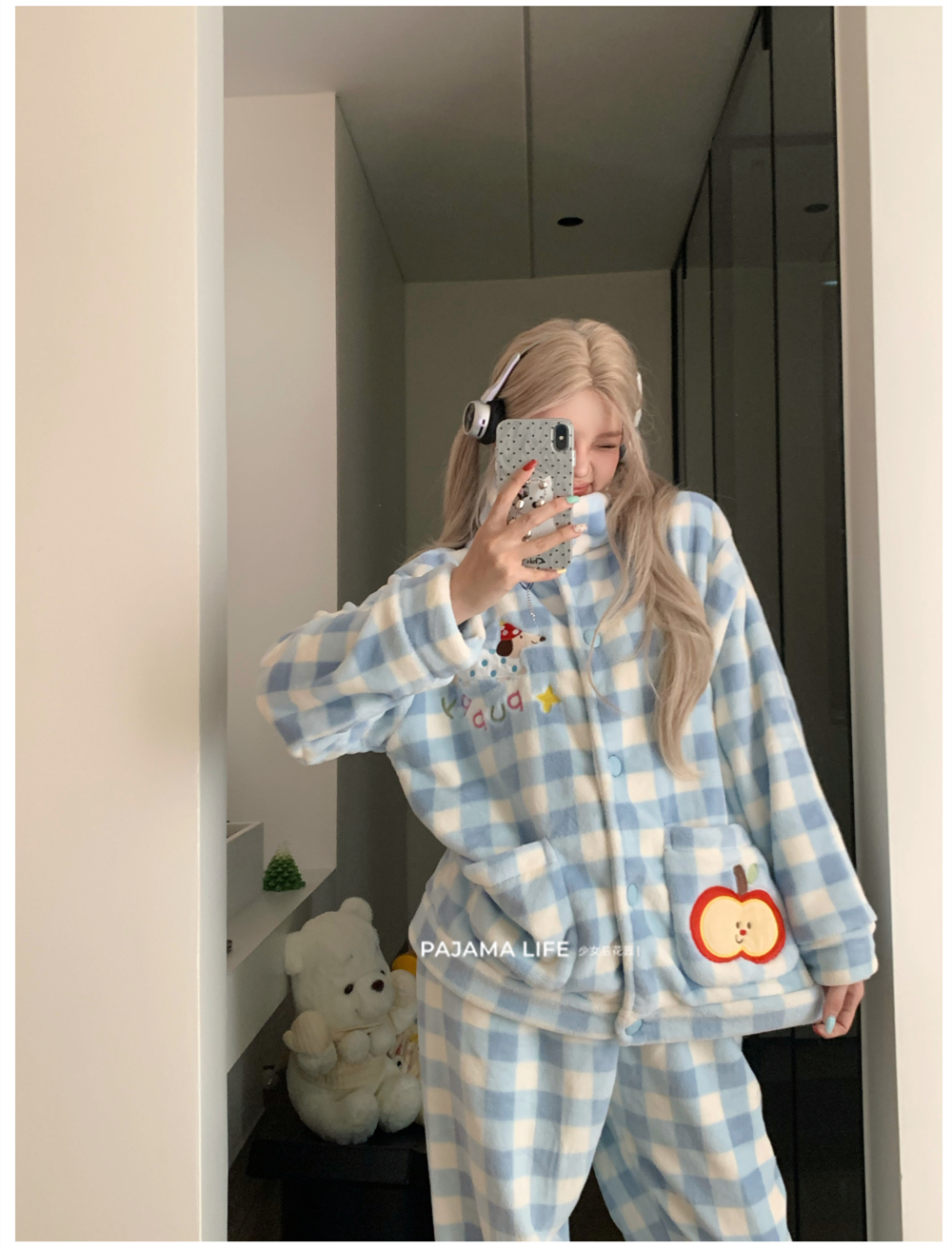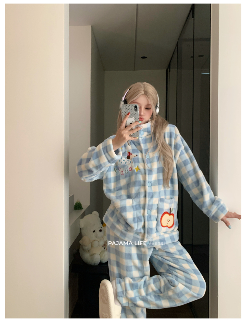 귀여운 사과 파이 강아지 산호 양털 잠옷 여성의 가을과 겨울 기모 따뜻한 높은 칼라 홈 옷 세트스토어 가기
