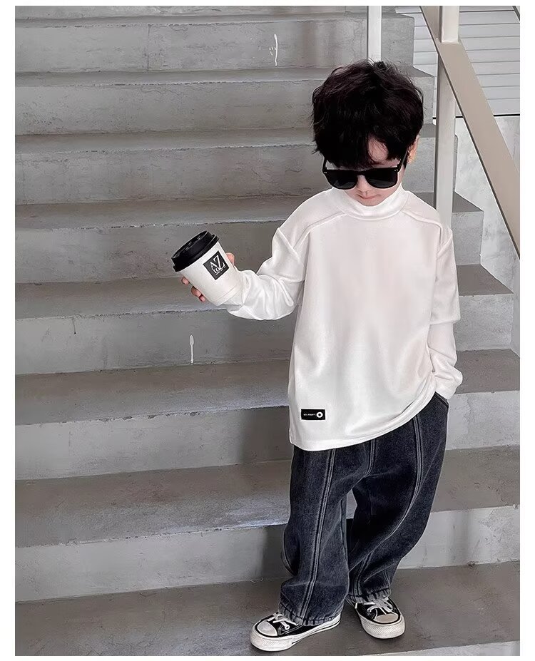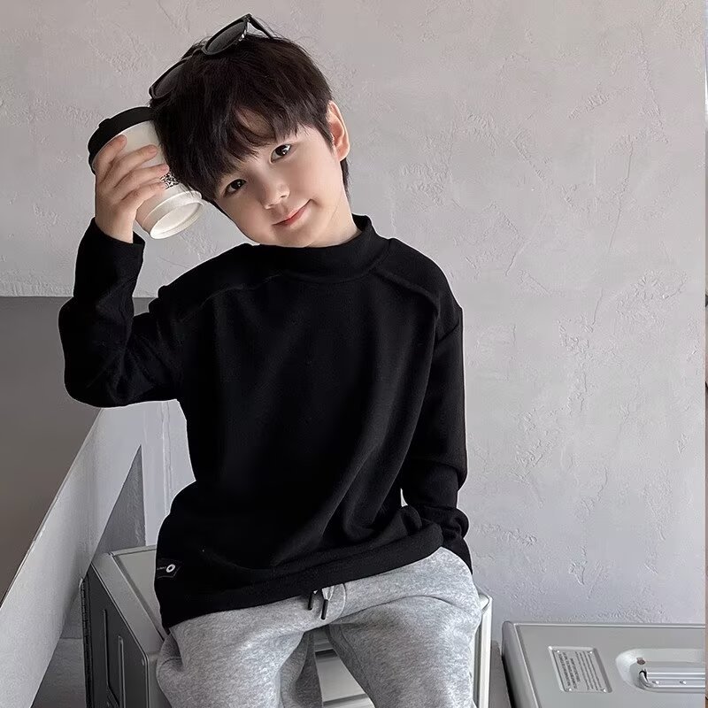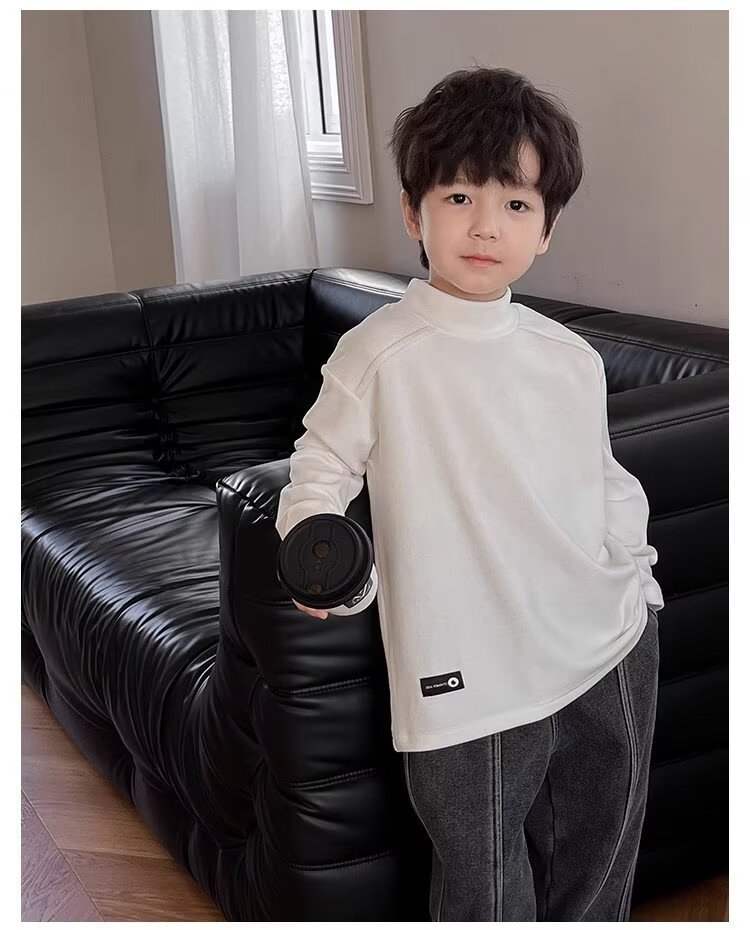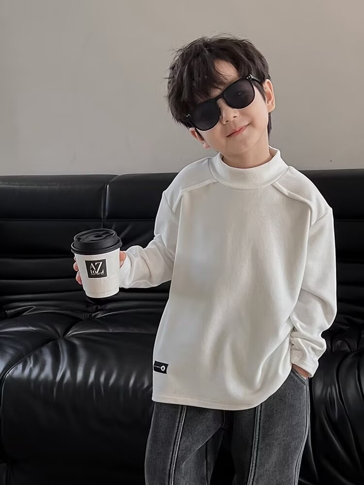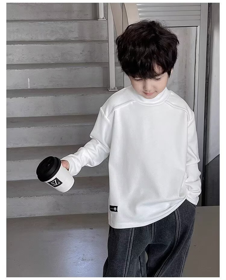 소년 화이트 하프 하이 칼라 베이스 셔츠 가을과 겨울 2024 새로운 스타일 탑 어린이 겨울 긴 소매 내부 따뜻한 티셔츠스토어 가기