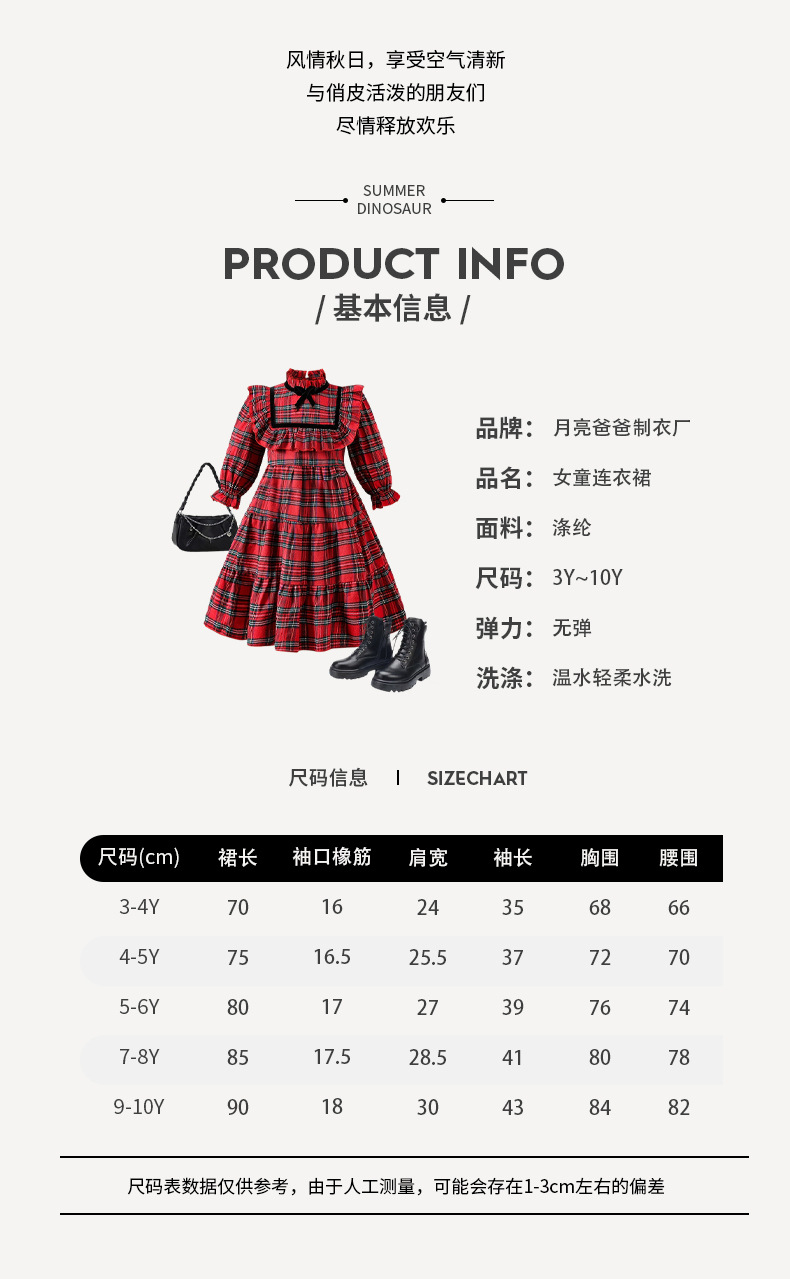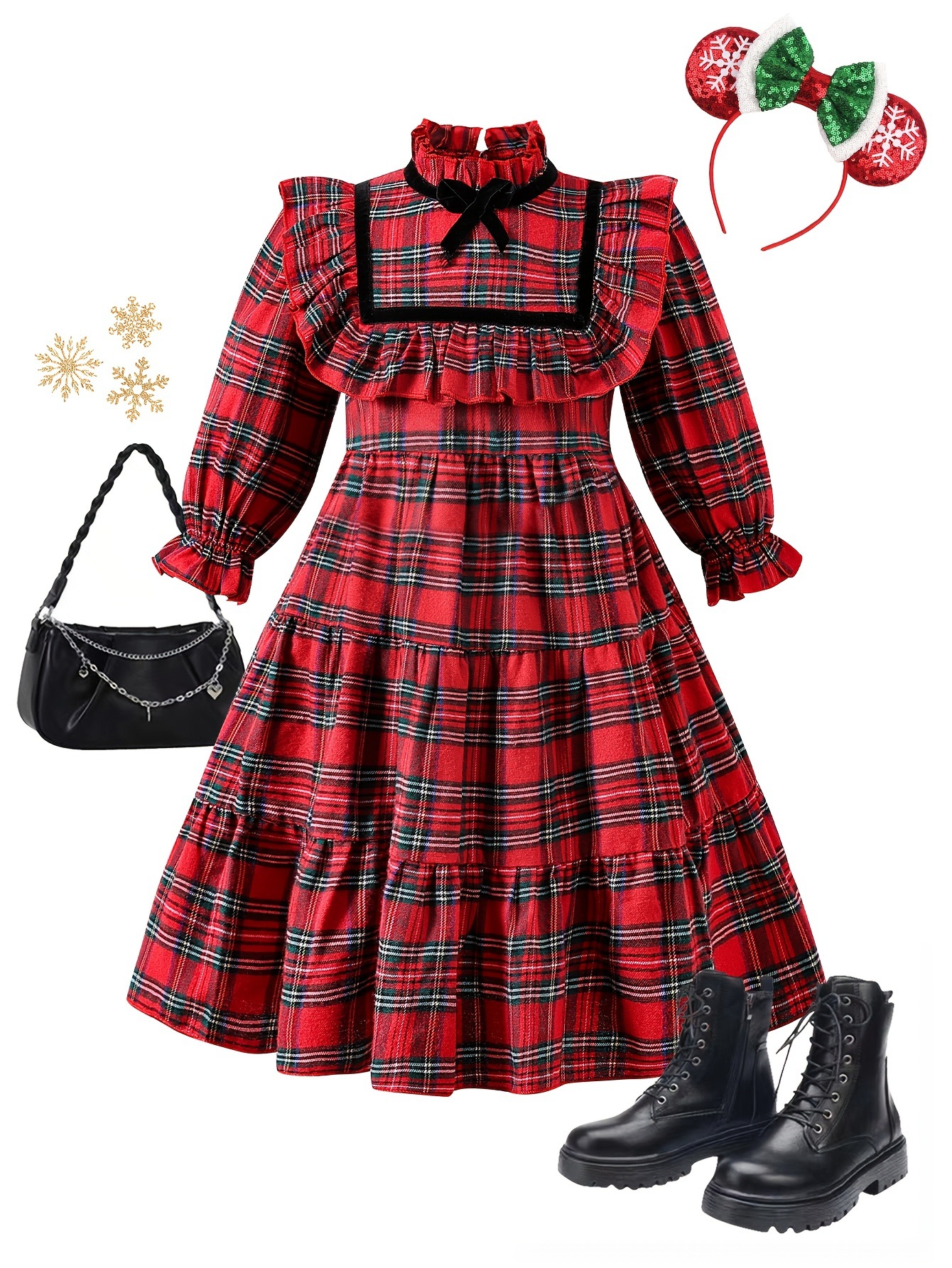 크로스 오버 소녀의 크리스마스 레드 원피스 로리타 스타일 격자 무늬 레이스 하이 넥 활 긴 소매 A-라인 원피스