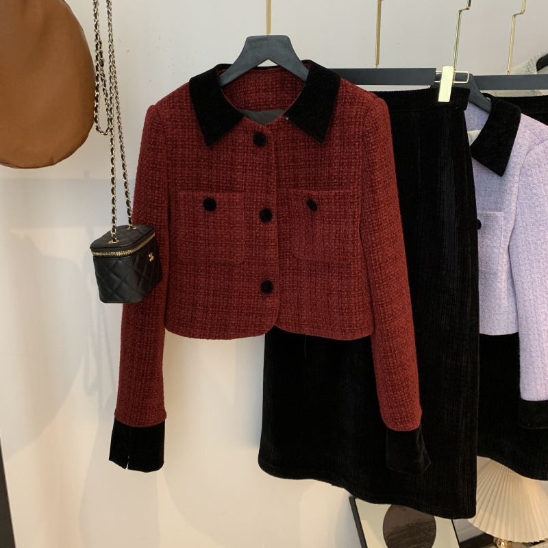 크리스마스 레드 미디 원피스 샤넬 스타일 세트 여성의 2024 겨울 하이 엔드 슬림 울 재킷 투피스 세트