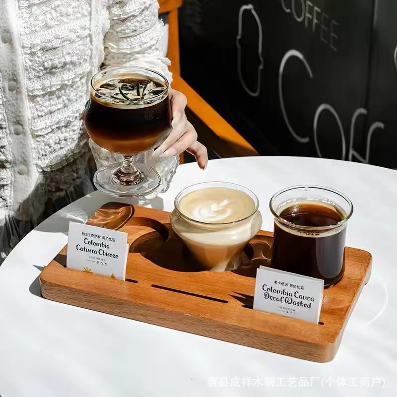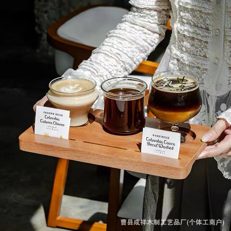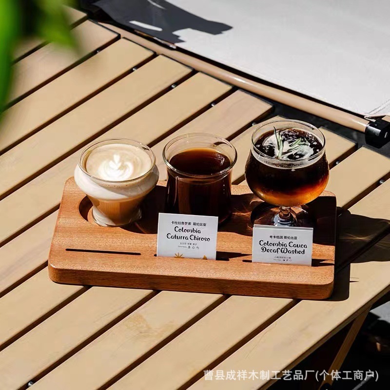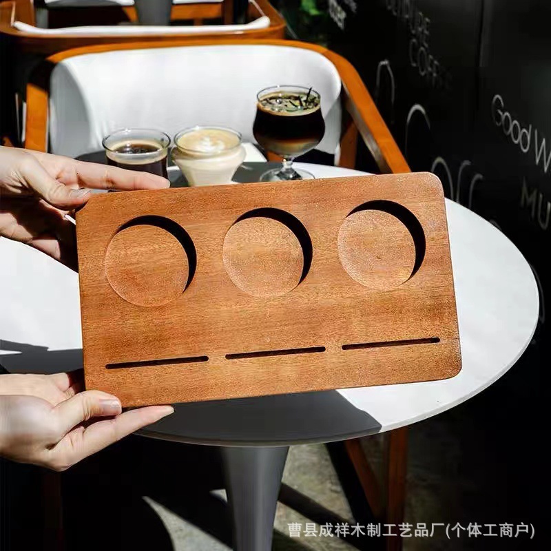 재고 있음: 아카시아 나무 상업용 커피 컵 트레이, 원두 1개에 컵 3개를 담을 수 있는 원목 트레이, 로고 인쇄 가능스토어 가기