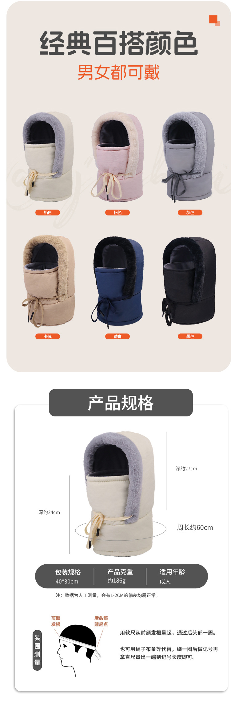 남녀공용 레이펑모자 겨울 통근용 사이클링용 큰 머리둘레 챙 없는 보온 방한 마스크