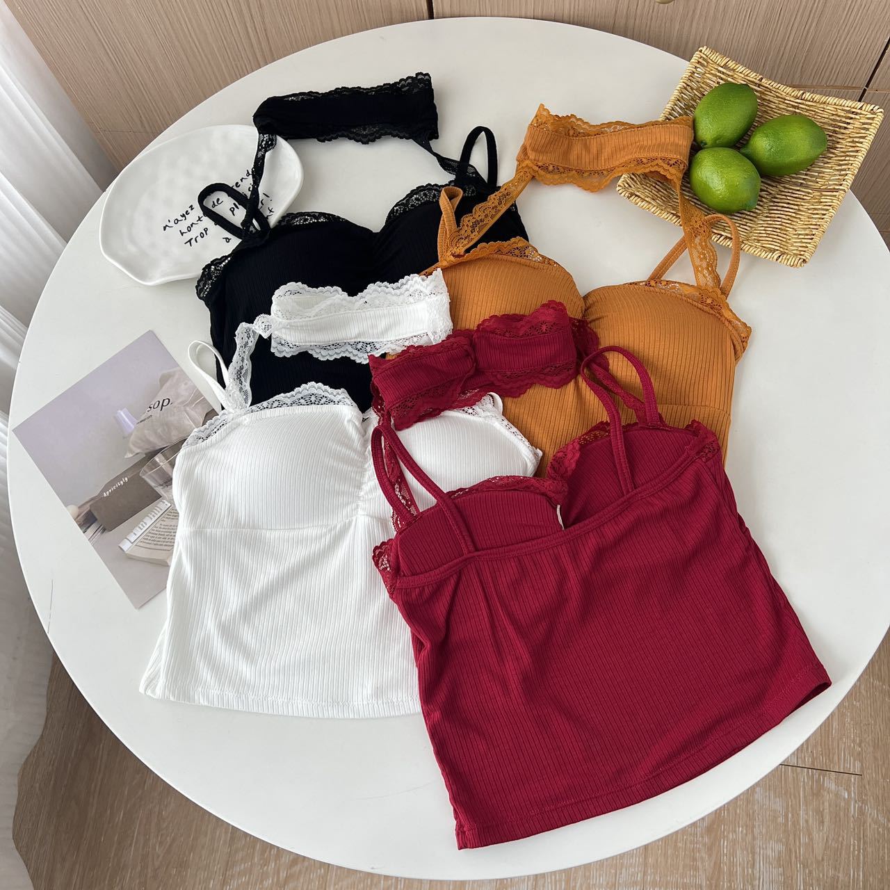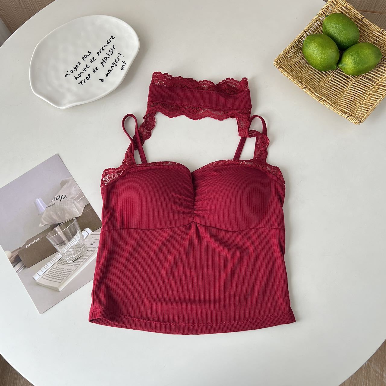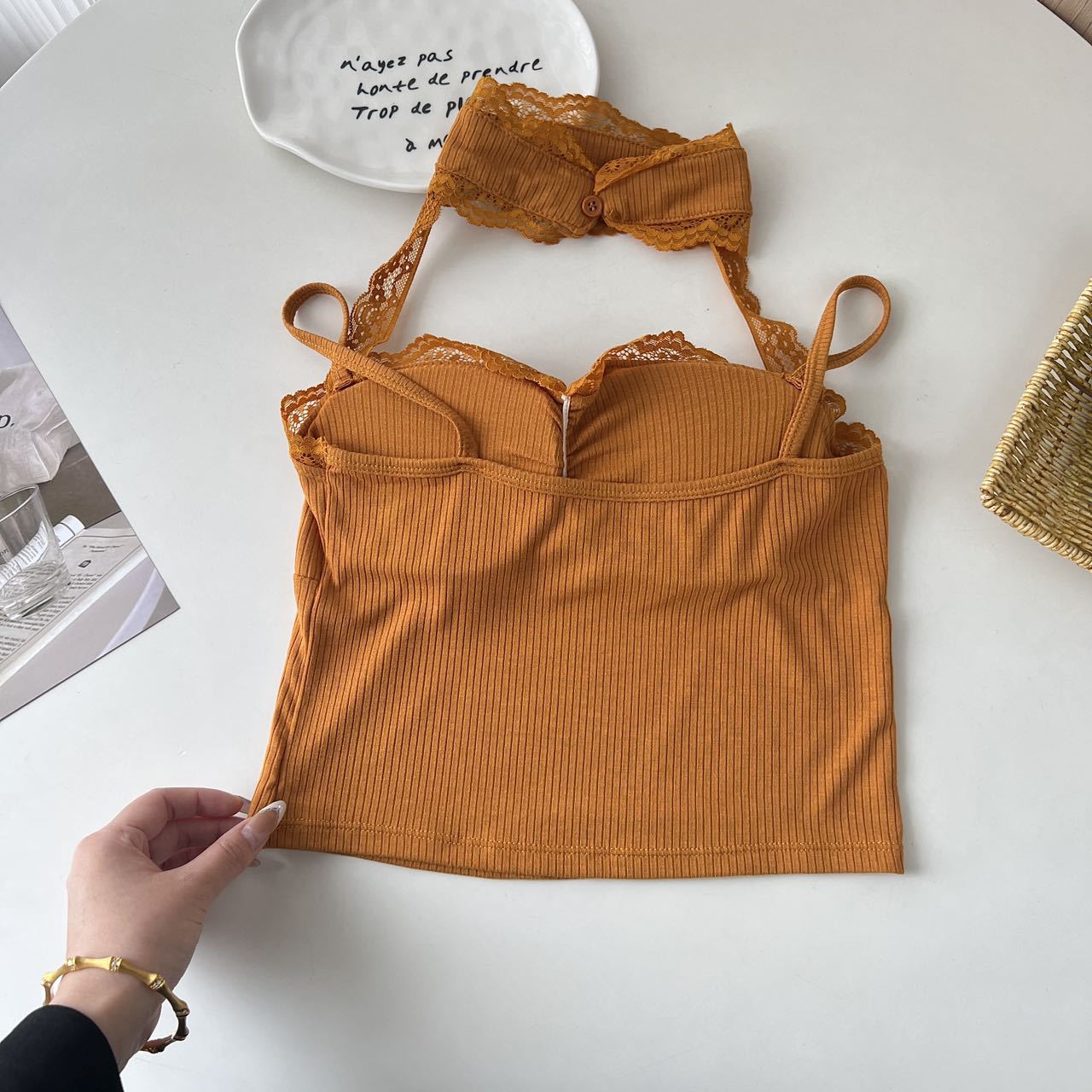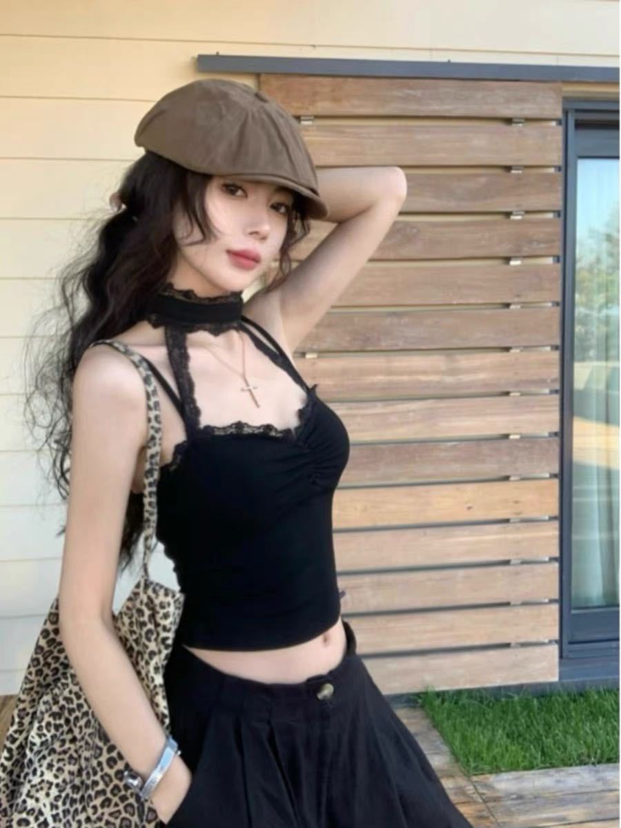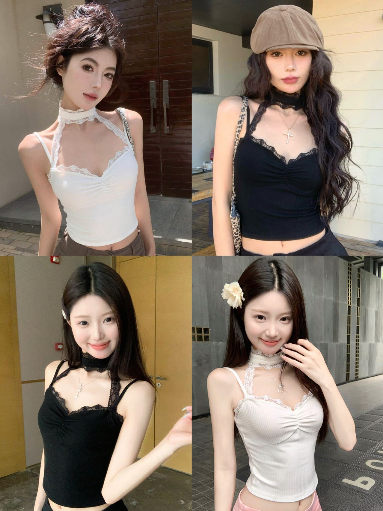 1814 # 새로운 순수 스파이스 소녀 스타일 레이스 바느질 교수형 넥 슬림 카미 솔 소녀의 감정 탑