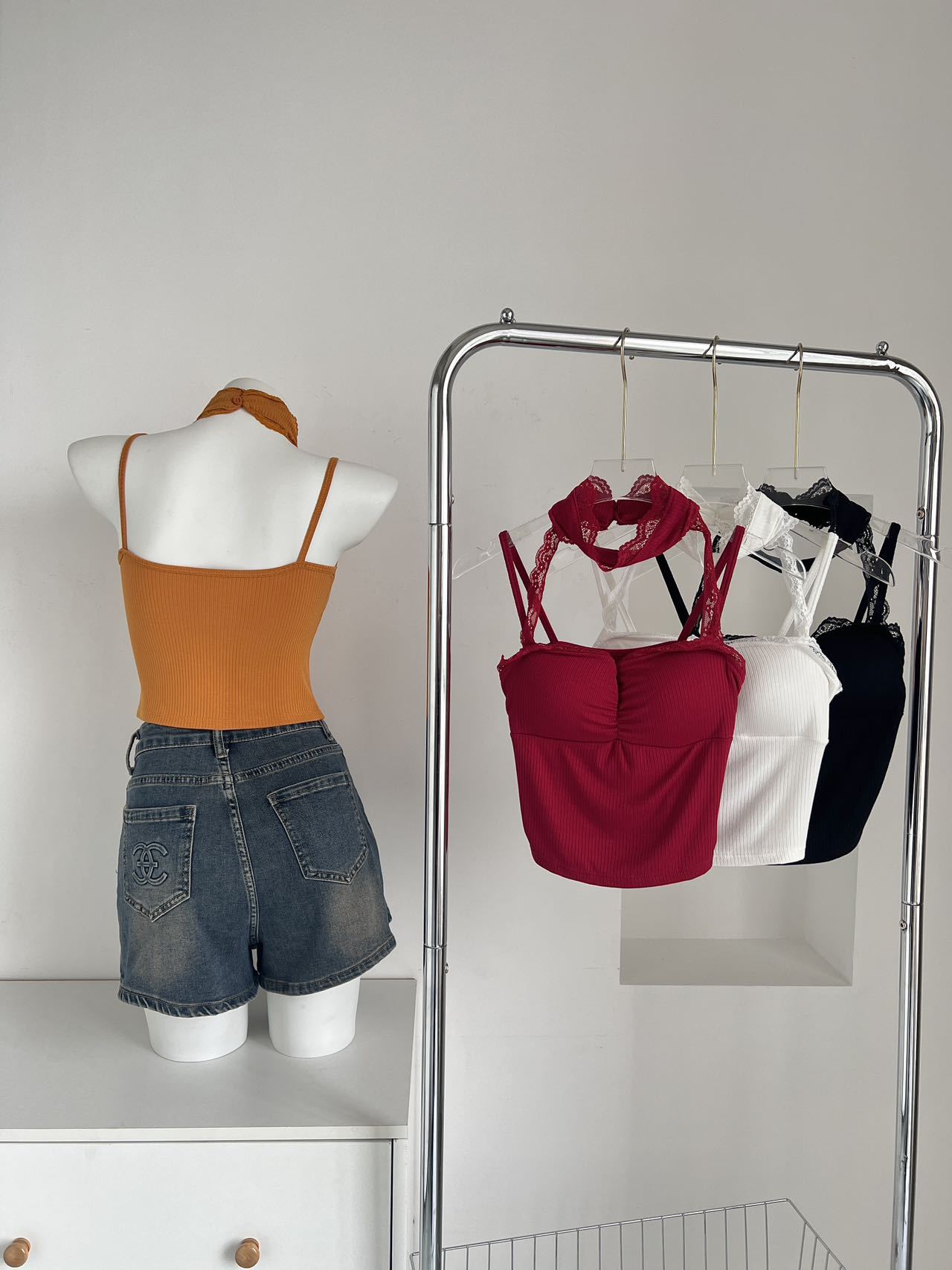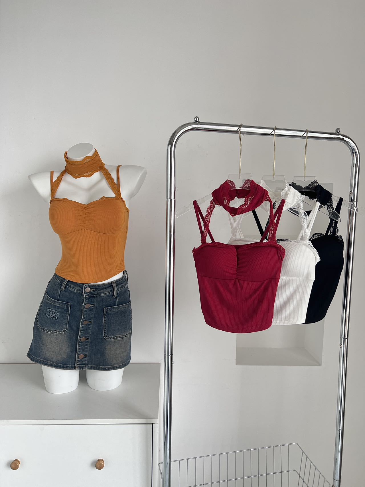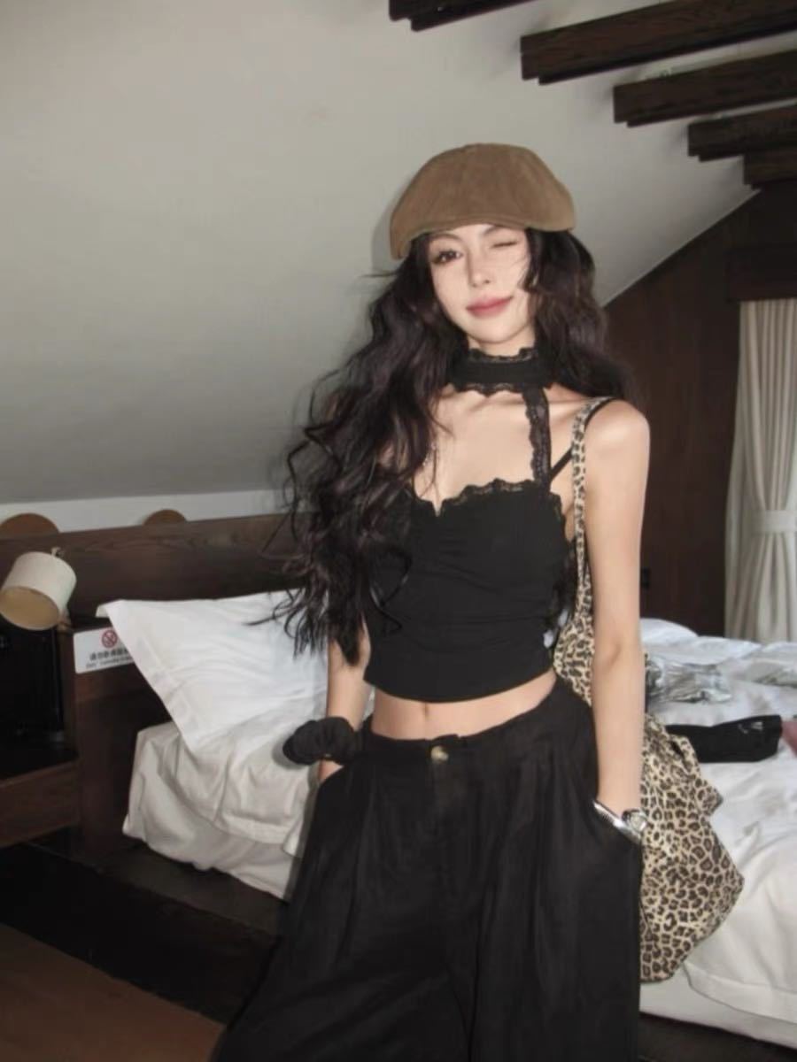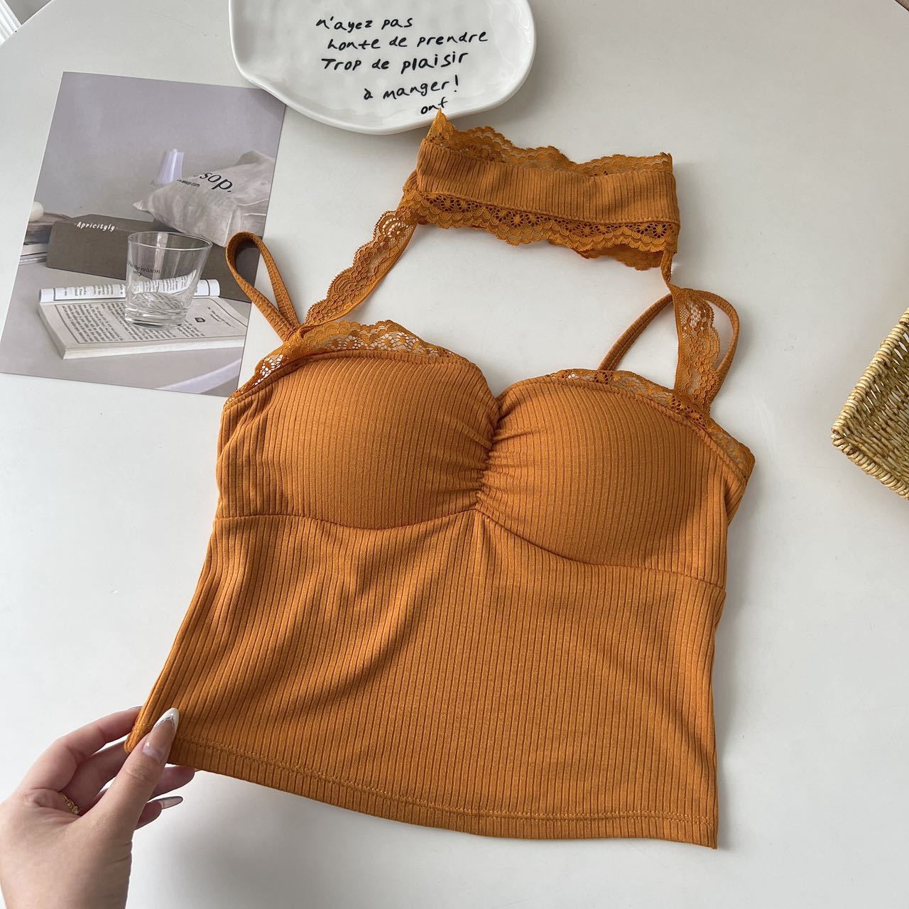 1814 # 새로운 순수 스파이스 소녀 스타일 레이스 바느질 교수형 넥 슬림 카미 솔 소녀의 감정 탑